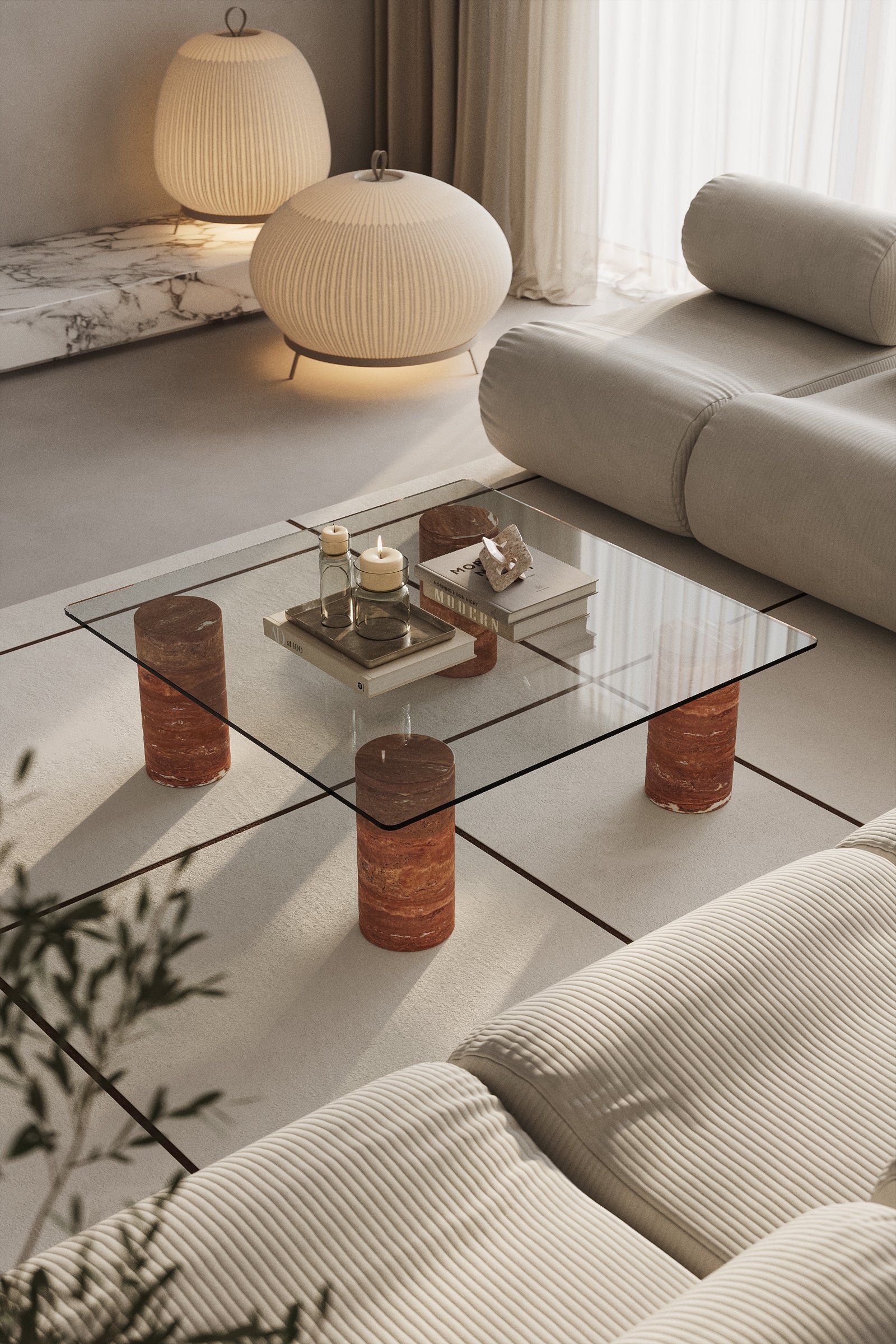 A clear glass top is elevated by cylindrical red travertine pillars, revealing warm earthy tones and rich natural veining beneath the surface. The contrast between transparent glass and expressive stone creates a strong architectural presence. Light reflects softly while the stone grounds the composition. Sculptural yet balanced, it adds depth without heaviness. A distinctive centrepiece that brings warmth and character to modern
