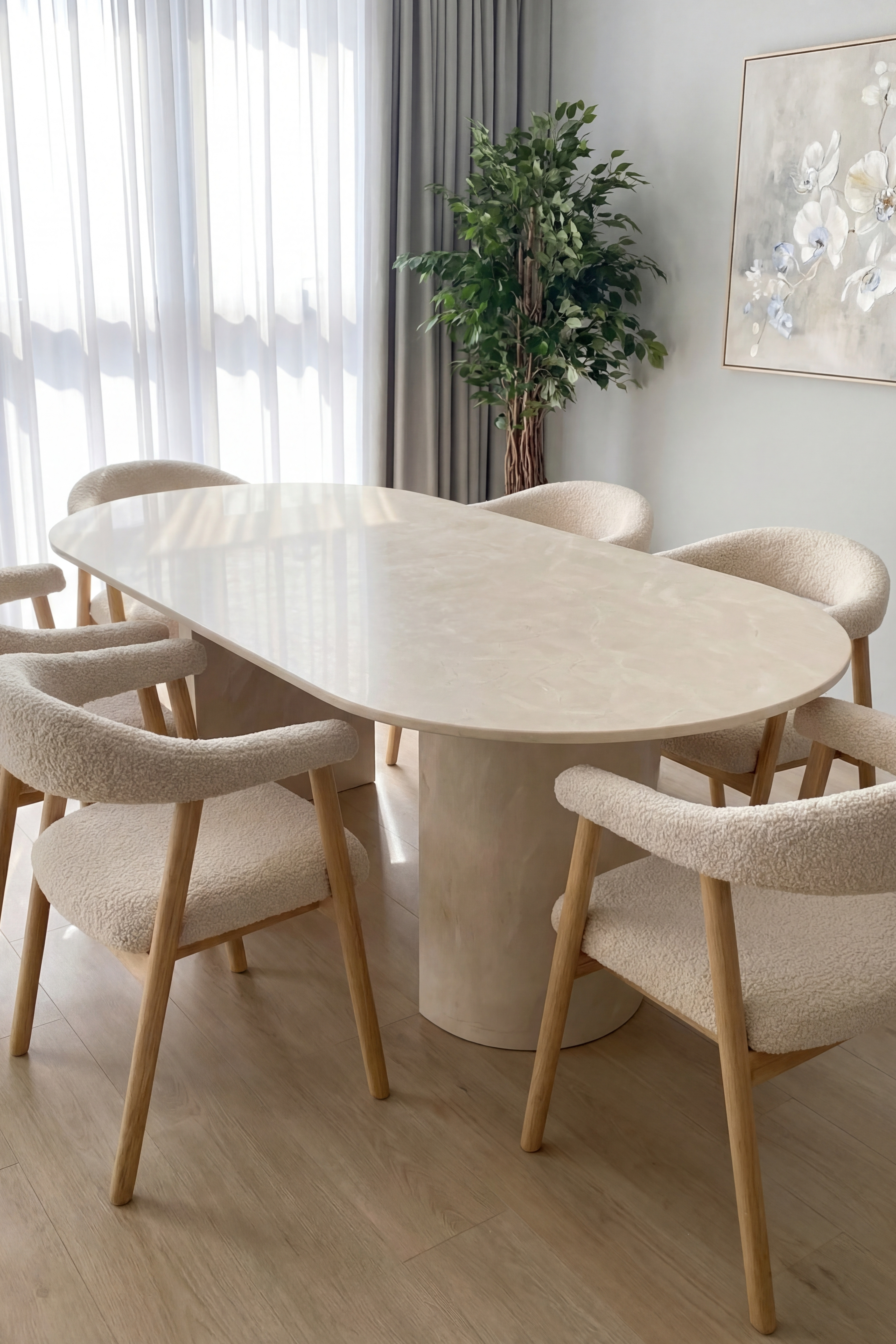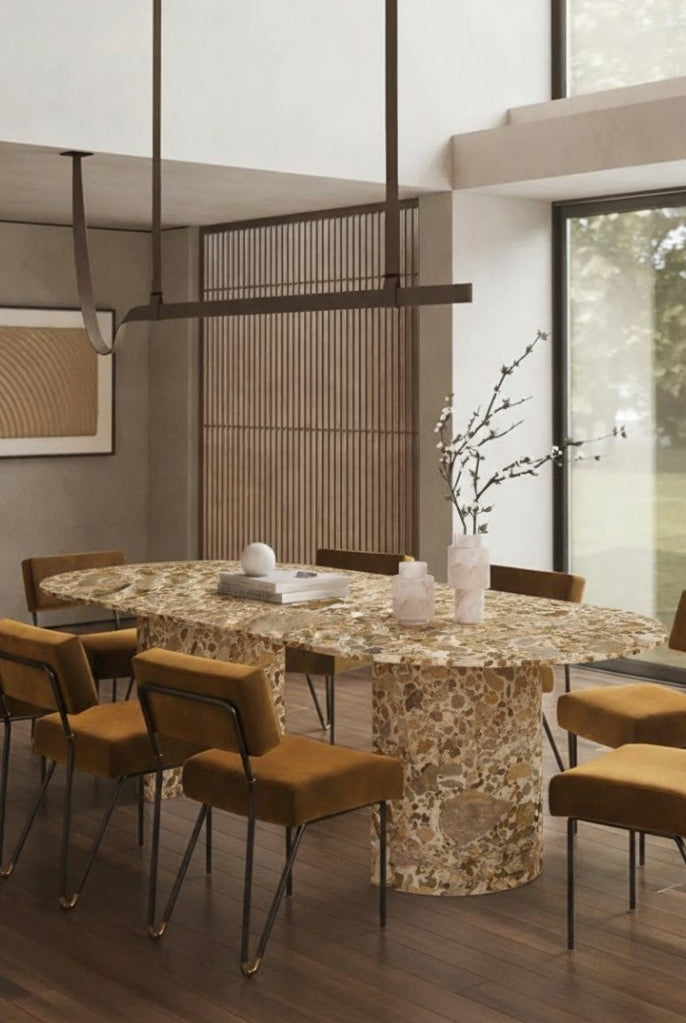 Transform your dining space with a table that radiates refined modern elegance. Expertly crafted from luxurious Bianco Venus stone, its polished surface highlights soft natural veining that brings depth and visual warmth. Sculptural half-moon legs provide a striking architectural foundation, offering both stability and an artful silhouette. The stone’s subtle, neutral tones blend effortlessly into contemporary and minimalist interiors. Designed with generous proportions, it provides ample space for both daily dining and memorable gatherings. A true centerpiece, this table delivers timeless sophistication and enduring style to any home.