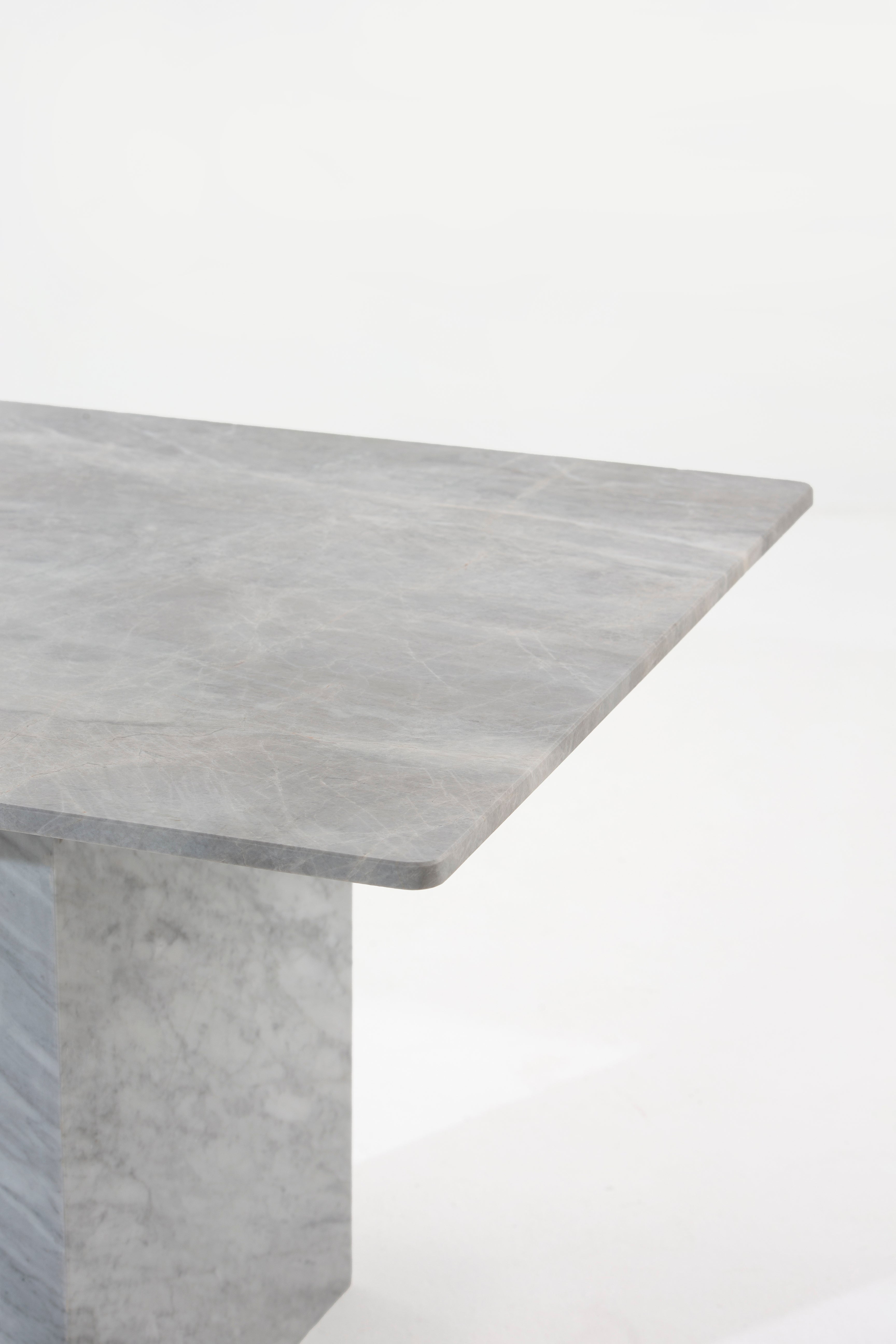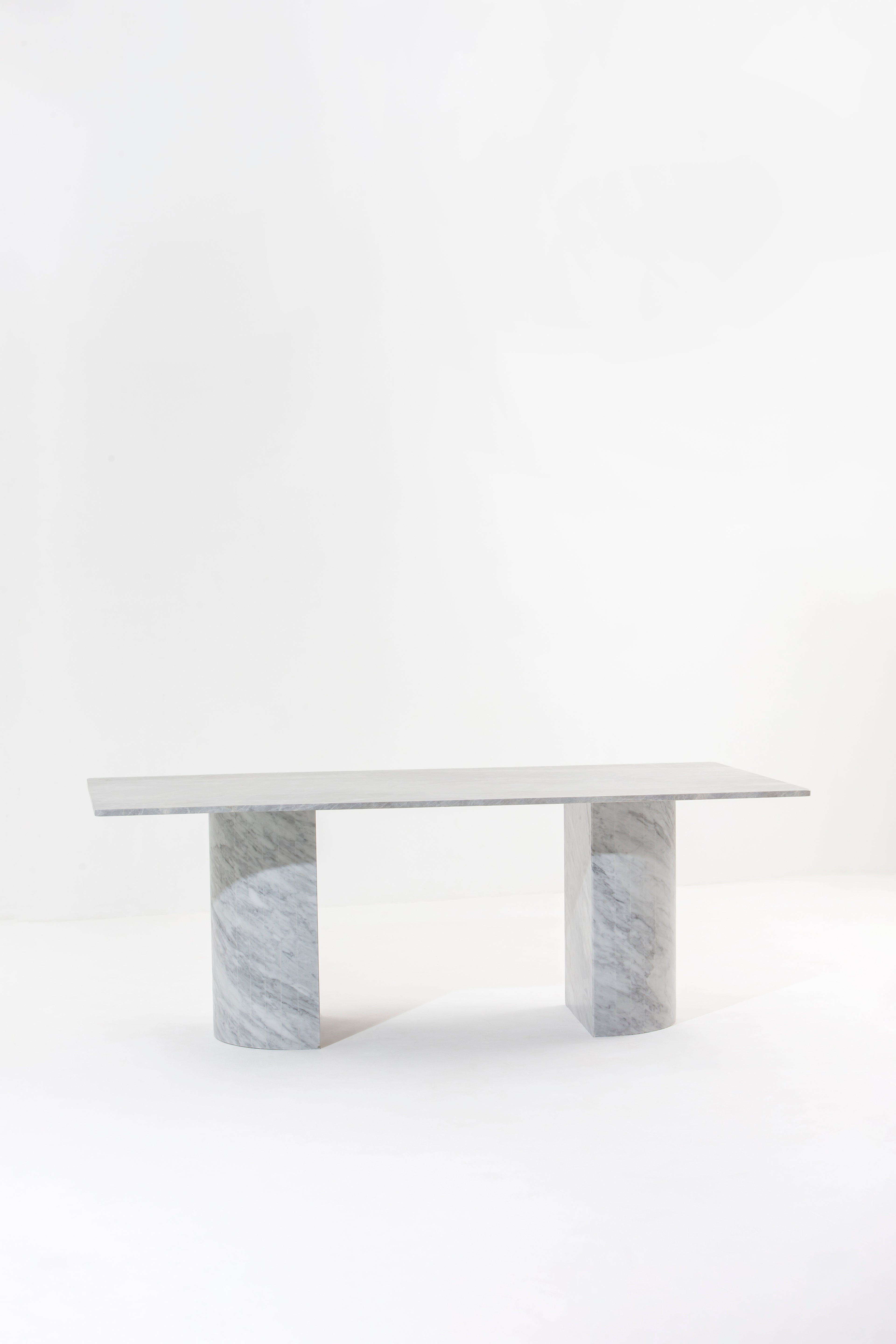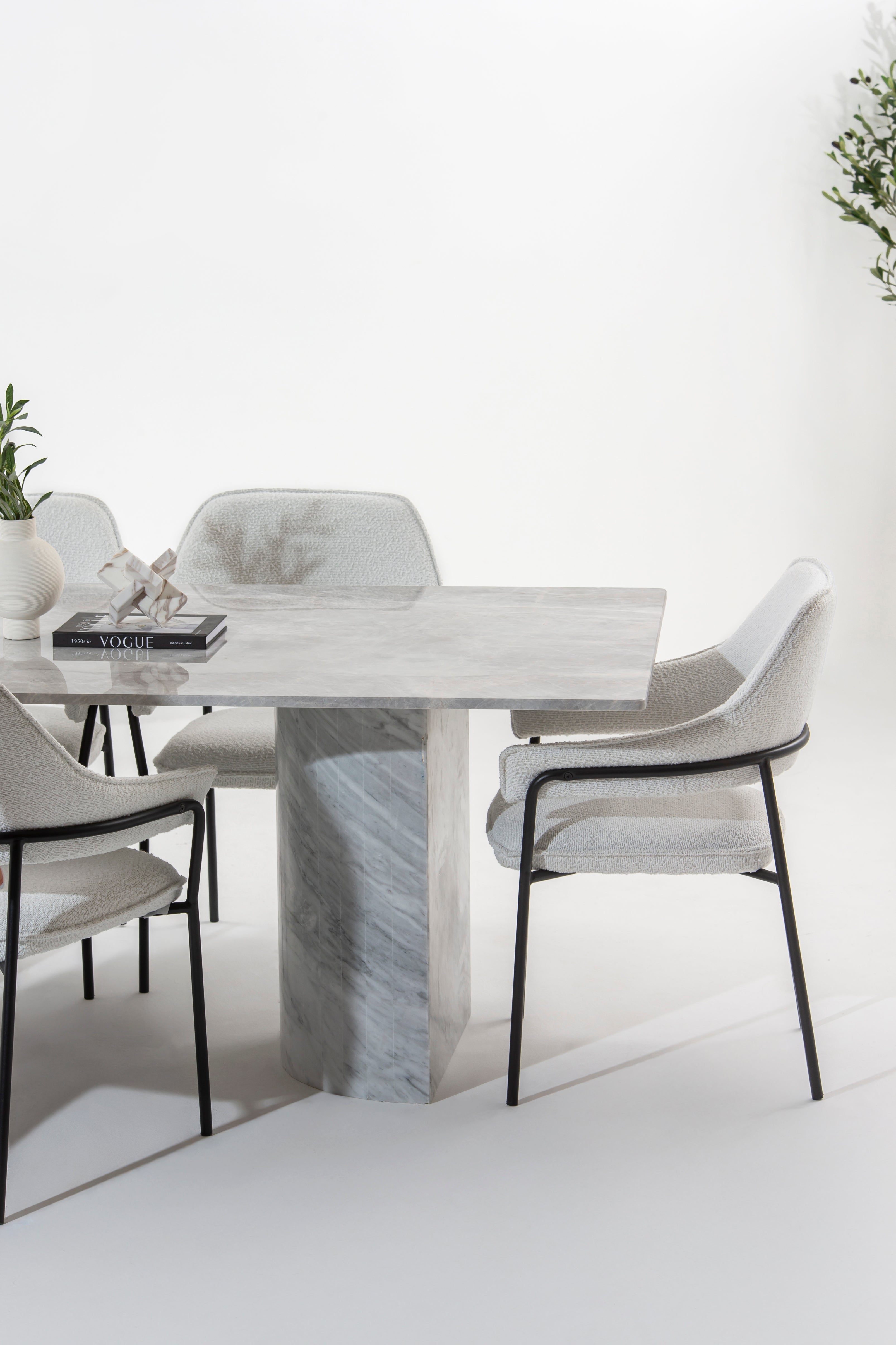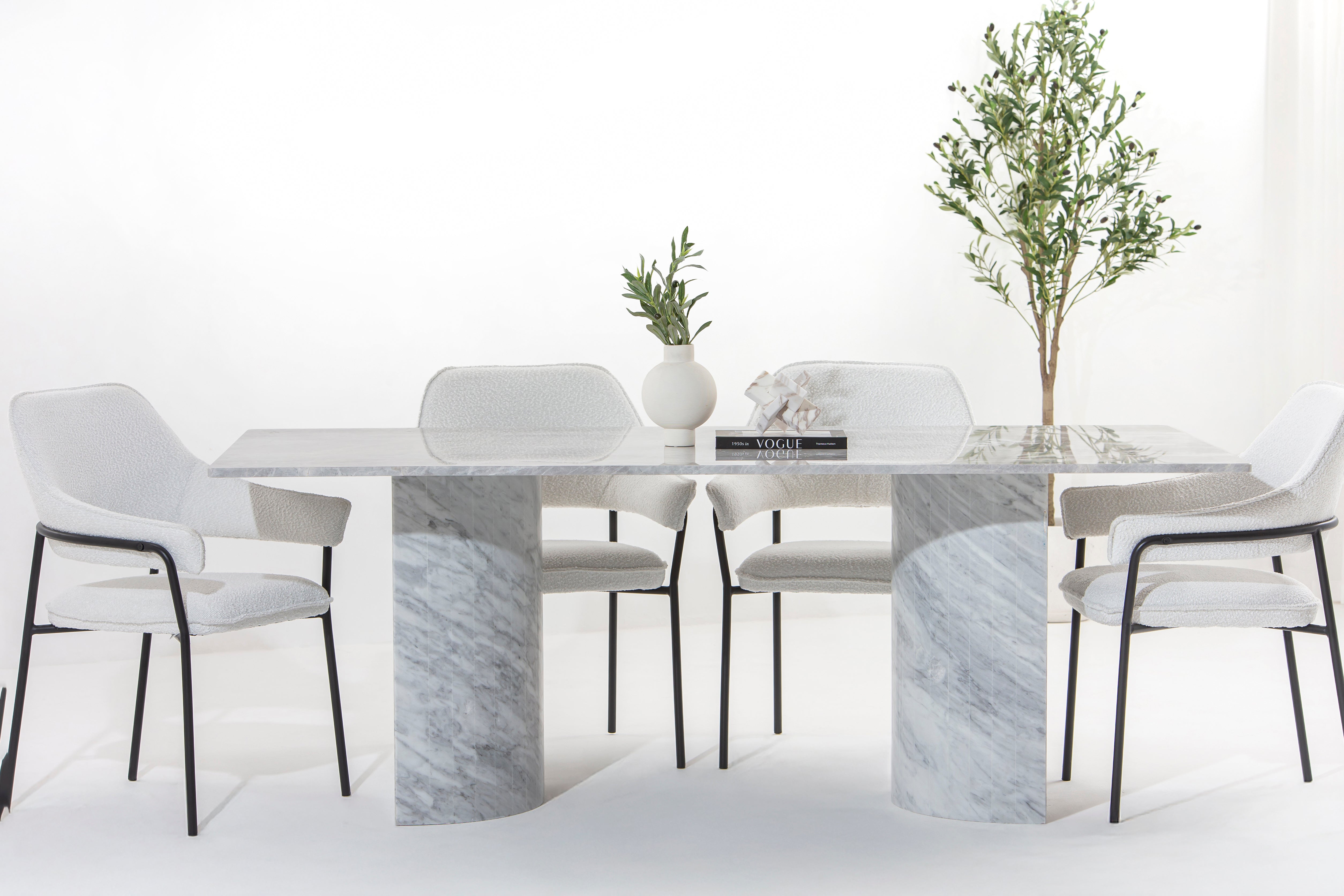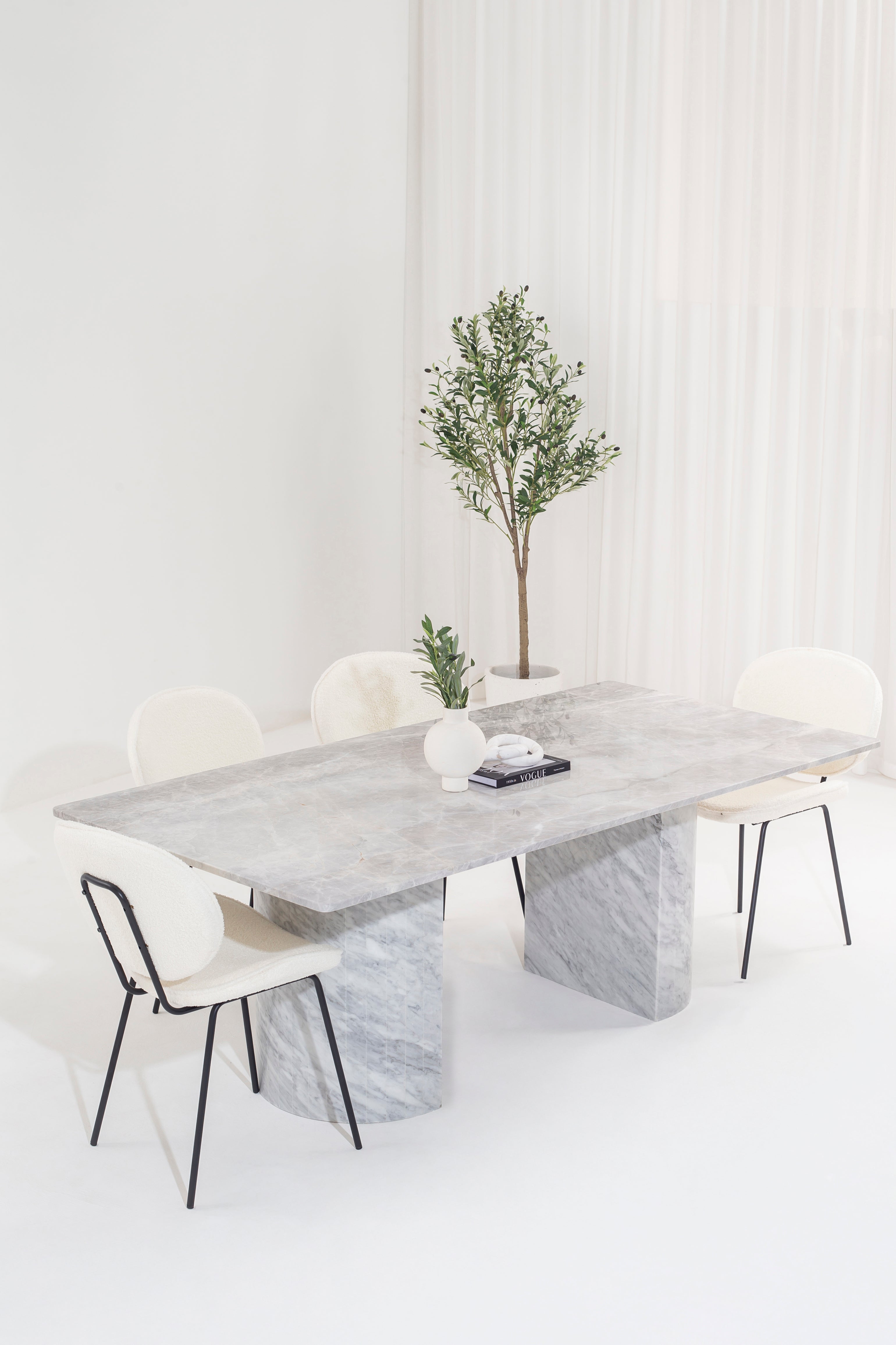 Featuring a refined Fior De Pasco marble-look top, this table showcases soft grey veining with a natural stone texture that reflects light beautifully. The standout half-moon pedestal bases add a bold architectural statement, blending symmetry and softness in a unique silhouette. As you gather around this artful dining centerpiece, its smooth surface and curved foundation become a reflection of your taste—sophisticated, minimalist, and effortlessly modern. The Lunaro table turns everyday meals into gallery-worthy moments.