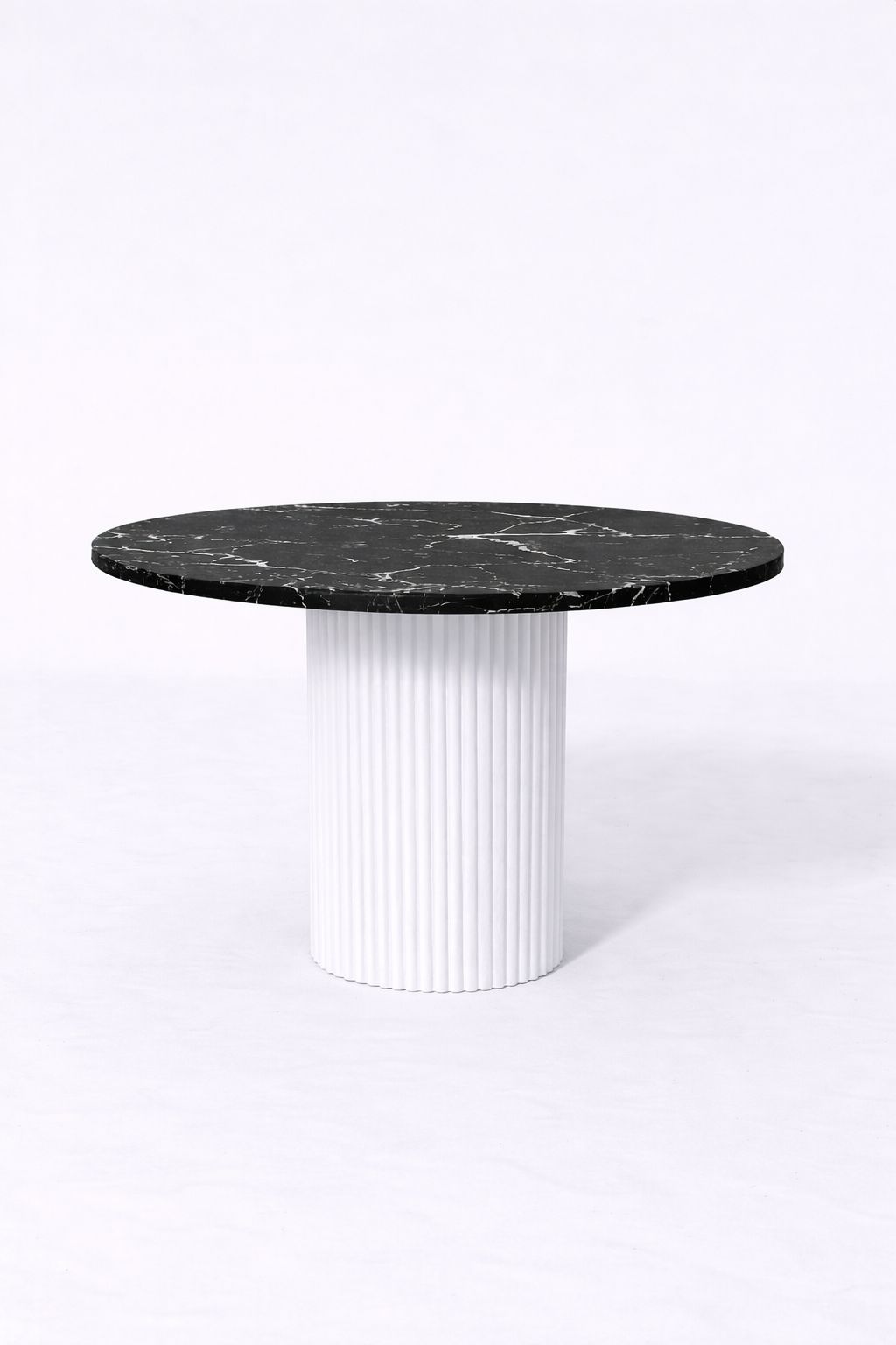Bring striking contrast to your dining space with a rich black marble top paired with a crisp white wood base for a refined, modern statement. The round tabletop adds a sleek, luxurious touch, while the fluted pedestal base introduces soft texture and sculptural balance that feels both bold and timeless. Perfect for everyday dining and elevated hosting, it blends beautifully with contemporary, monochrome, and minimalist interiors. Please note that natural marble veining and tone vary from slab to slab, making every table uniquely yours.