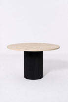 Elevate your dining space with the organic beauty of travertine paired with a bold black wood base for a refined, modern statement. The smooth round tabletop brings a calm, timeless presence, while the fluted pedestal adds sculptural texture and a beautifully grounded silhouette. Perfect for everyday meals and stylish hosting, it blends effortlessly with contemporary, minimal, and classic interiors. Please note that natural travertine features unique pores, tones, and patterns, so each piece will vary slightly and remain one of a kind.