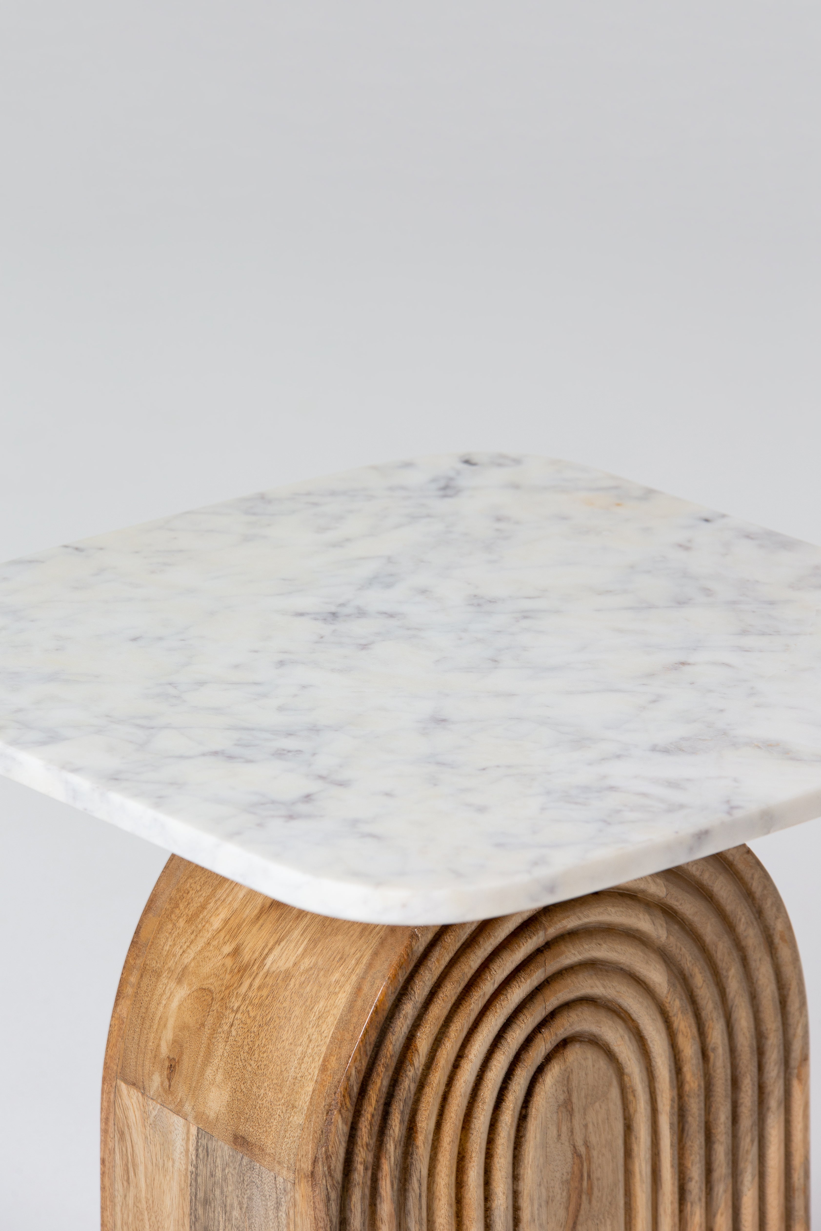 Crafted with a mango wood base and a sleek white marble top, the Hannelore Side Table combines timeless elegance with modern design. The unique arch-inspired wooden base, showcasing intricate natural grains, complements the smooth marble surface, making it an ideal accent piece for contemporary or rustic interiors. Perfect for any living room or bedside setting.