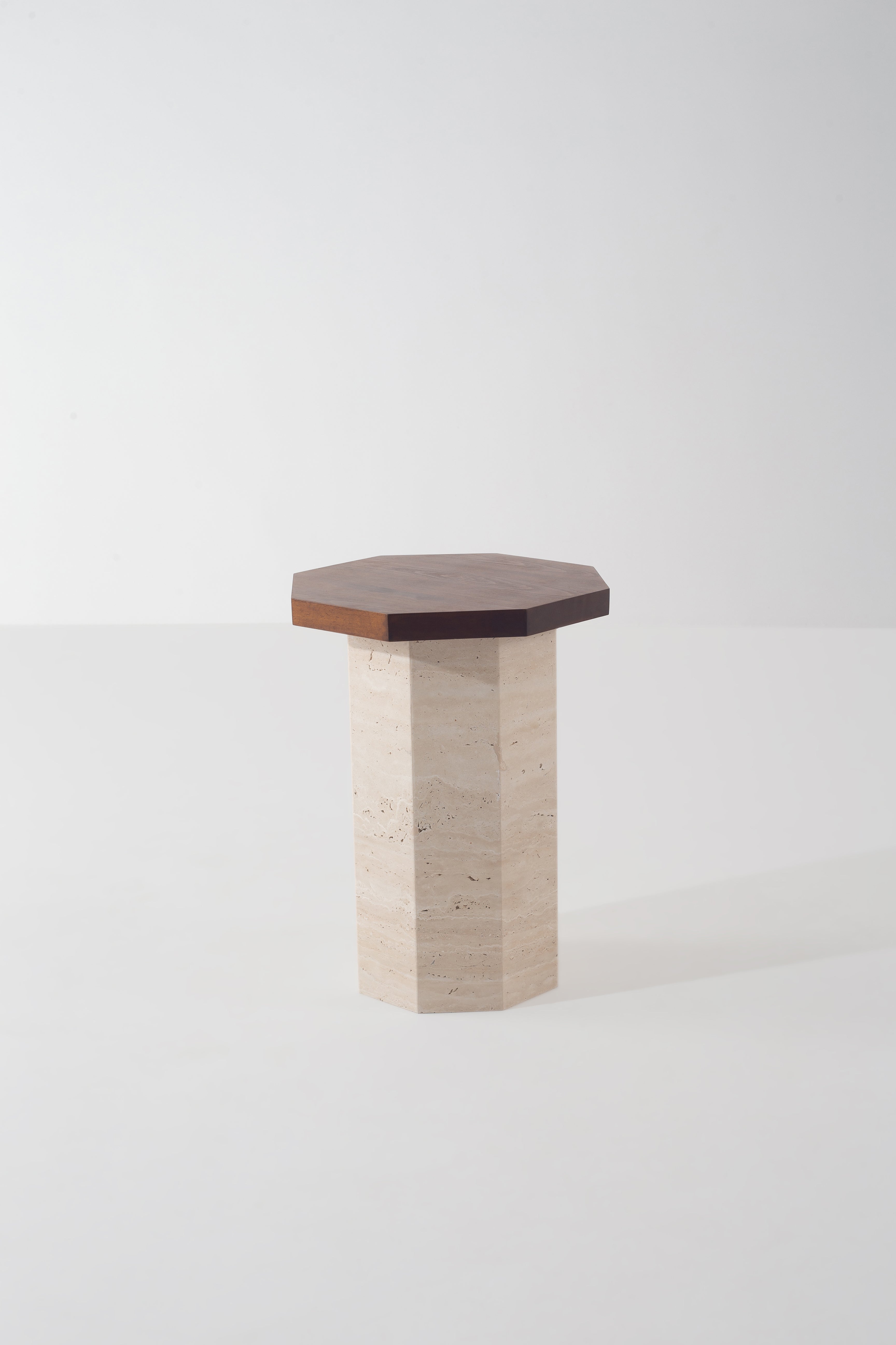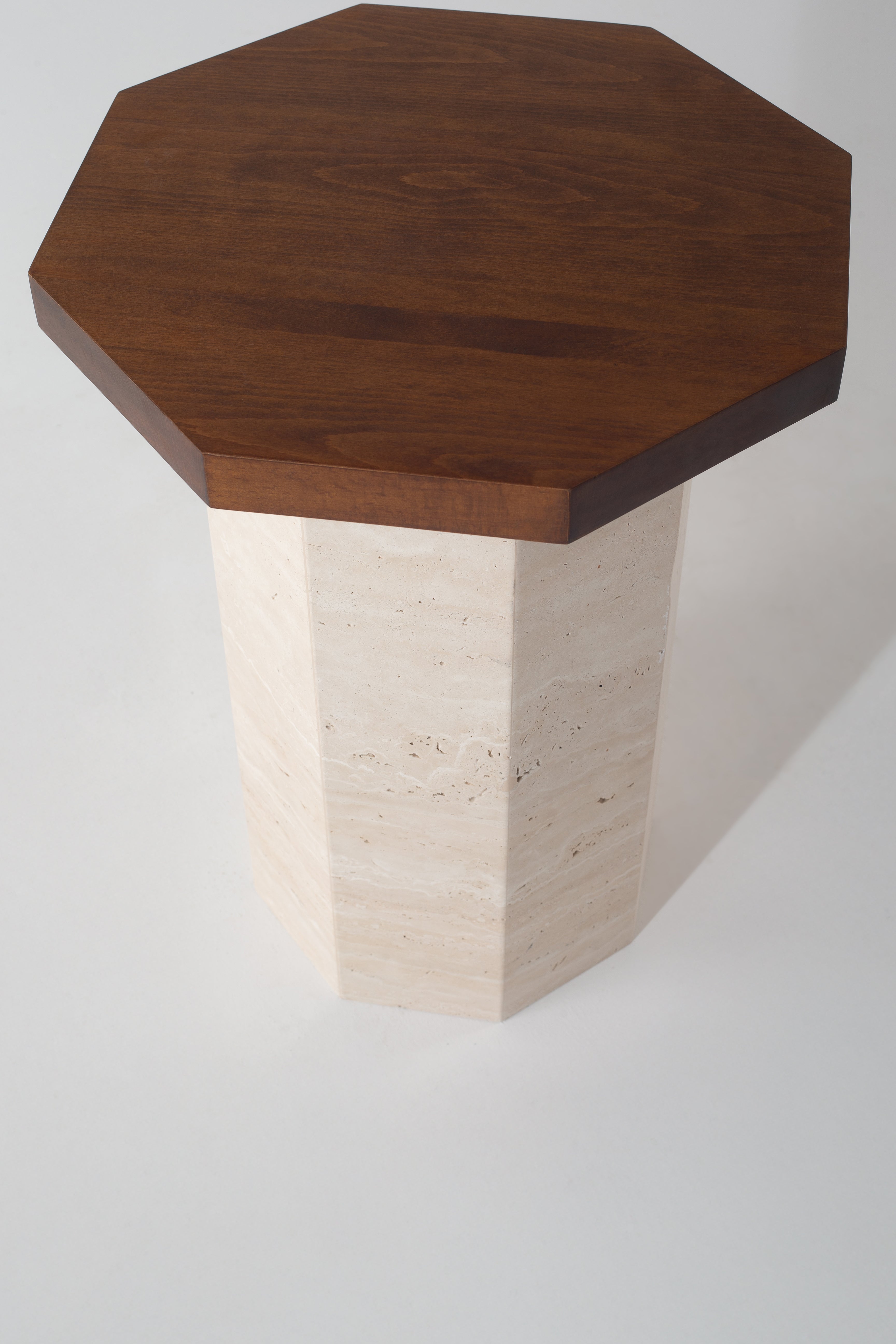 The Lucasta side table combines an octagonal travertine base with a smooth wood top, creating a balanced dialogue between solid form and warm surface tone. Its geometric structure feels architectural yet understated, allowing the natural stone texture to add depth and quiet character. Designed to function as both a side table and display plinth, it brings calm presence and refined structure to modern interiors.