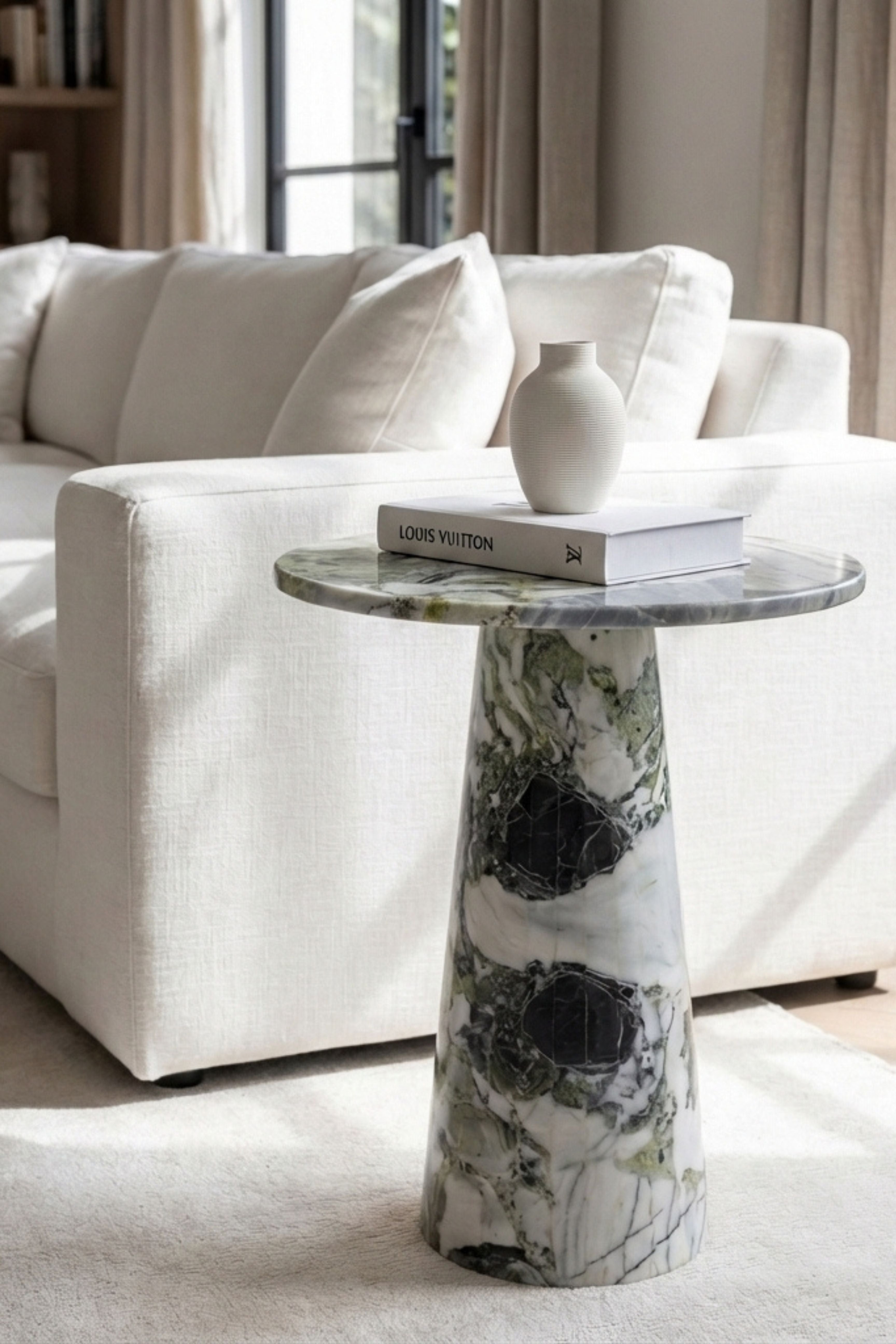 Enhance your living space with this exquisite marble side table, featuring a striking conical base and a polished round top. Crafted from luxurious white beauty marble, this table showcases intricate natural veining in shades of white, green, and black, adding a sophisticated touch to any room. Its unique design makes it a perfect accent piece for modern and contemporary interiors, whether placed next to a sofa, armchair, or used as a standalone decor element.