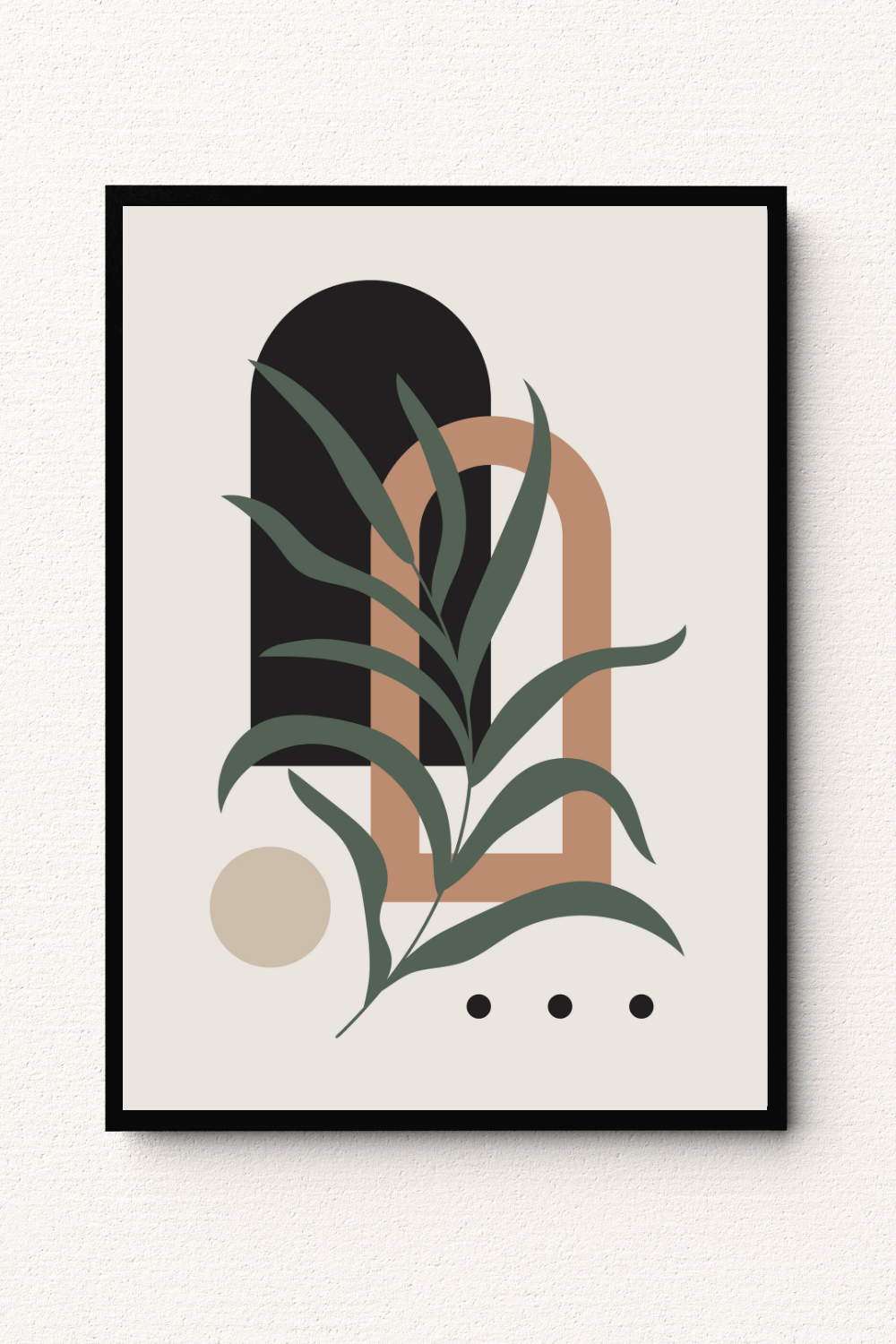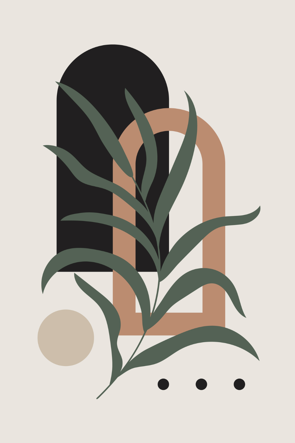 Layered architectural arches in deep black and warm clay tones frame flowing sage green foliage, creating a bold yet harmonious composition that brings organic elegance to your space. The balanced geometric structure and soft botanical curves allow you to style your interior with earthy warmth, modern depth, and refined contemporary character.