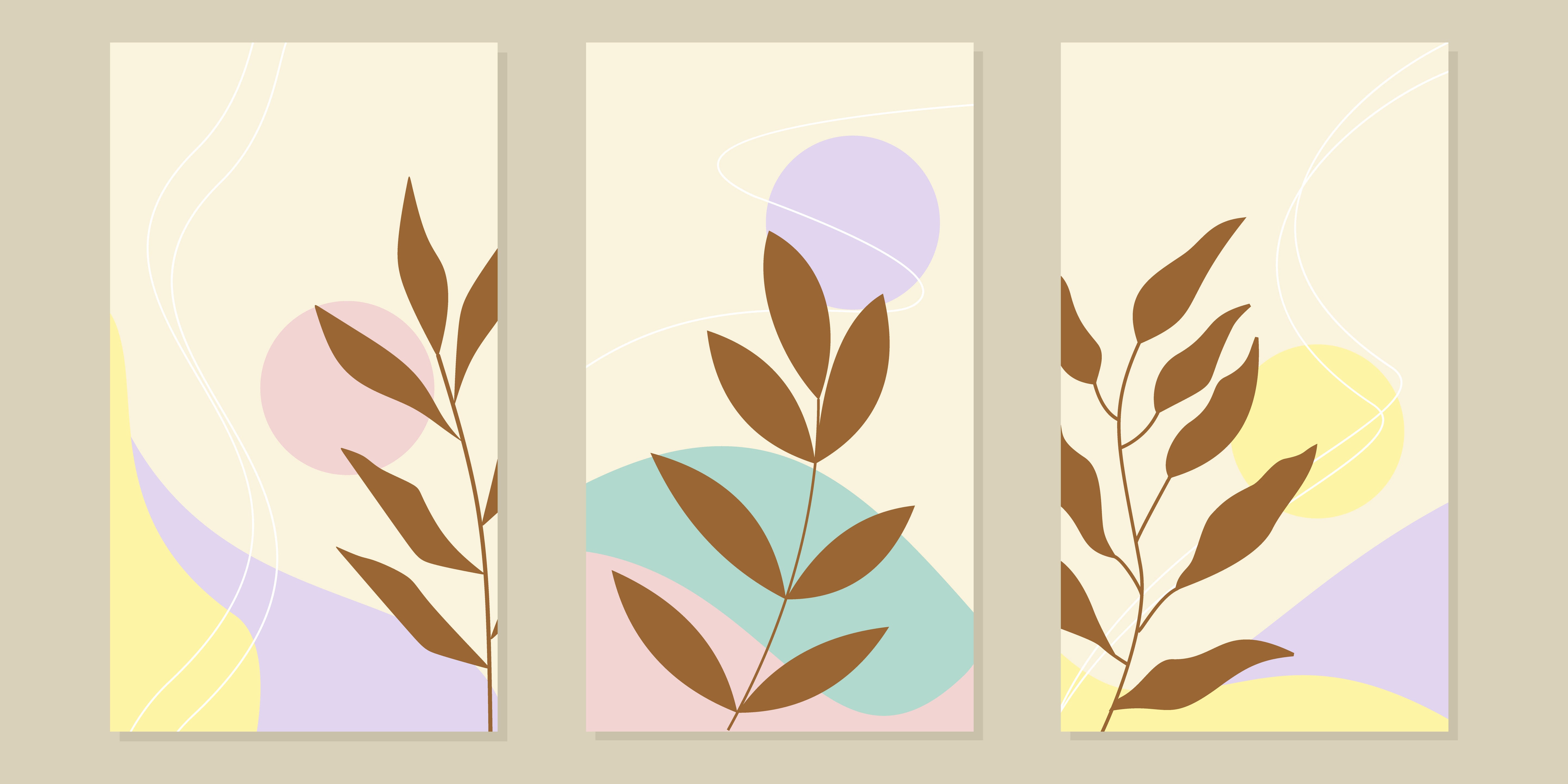Warm caramel leaves rise against soft sage, blush, and lavender tones, creating a gentle layered composition with fluid ivory line accents. The balanced shapes and muted palette bring a calm, airy presence while adding subtle depth. You introduce modern botanical elegance into your space with this refined abstract statement.