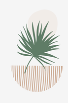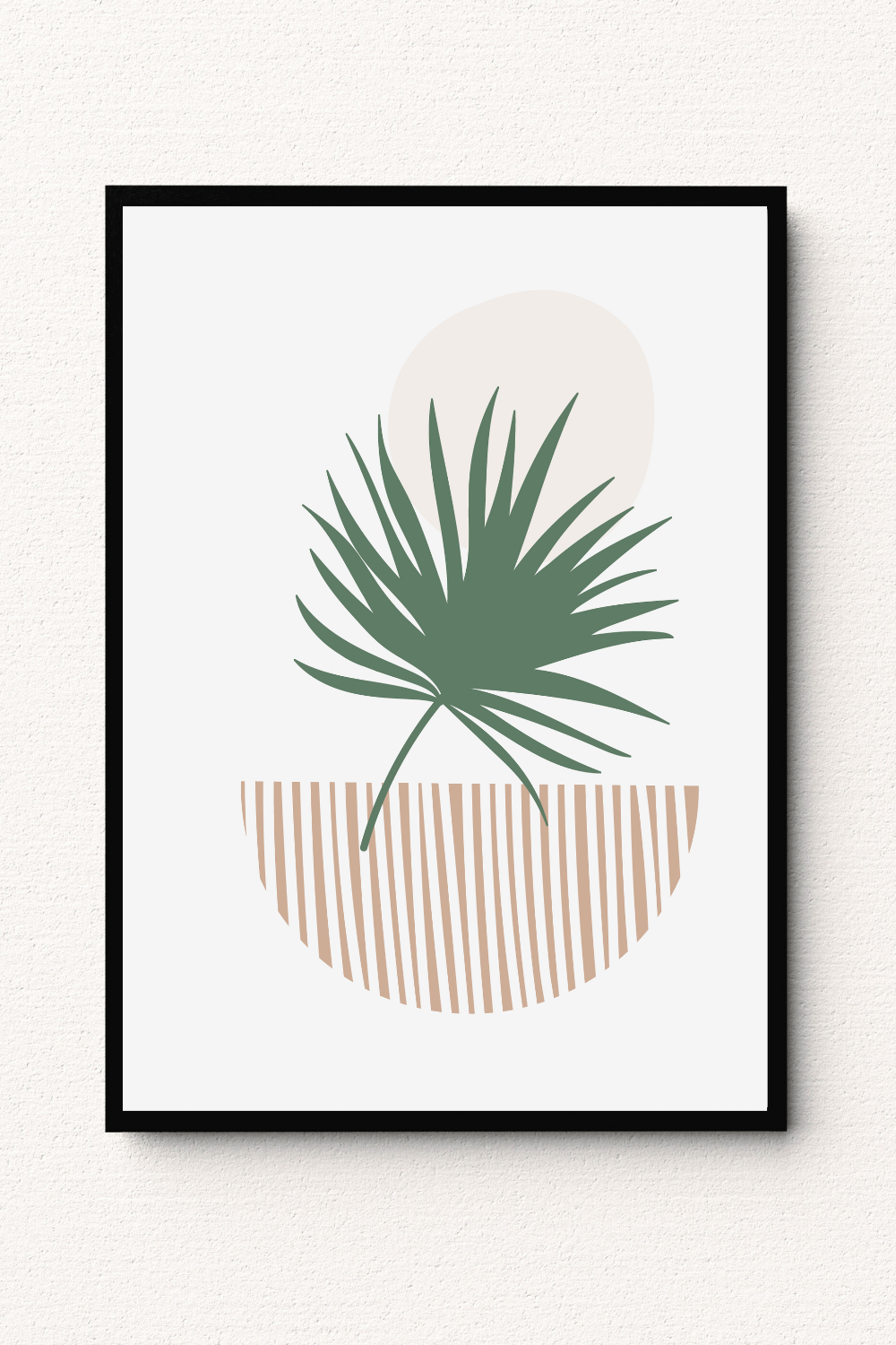 A bold sage green palm silhouette rises above a warm striped base, creating a refined contrast between organic form and graphic pattern. The soft neutral backdrop and subtle circular accent add depth and balance, allowing you to style your space with tropical calm, modern elegance, and earthy contemporary warmth.
