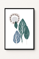 Layered botanical silhouettes in muted sage and dusty blue rise beneath a soft sun circle, creating a balanced composition of light and texture. Subtle distress detailing and organic linework add depth while maintaining a calm, modern aesthetic. You bring natural warmth and contemporary serenity into your space with this refined botanical statement.