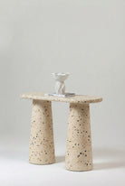 A warm creamy base enriched with delicate black and sand terrazzo speckles creates a refined interplay of texture and tone, while the softly rounded top and sculptural column legs bring architectural elegance to your entryway or living space, allowing you to style it with curated decor and transform your interior into a statement of modern luxury, artistic detail, and timeless sophistication.
