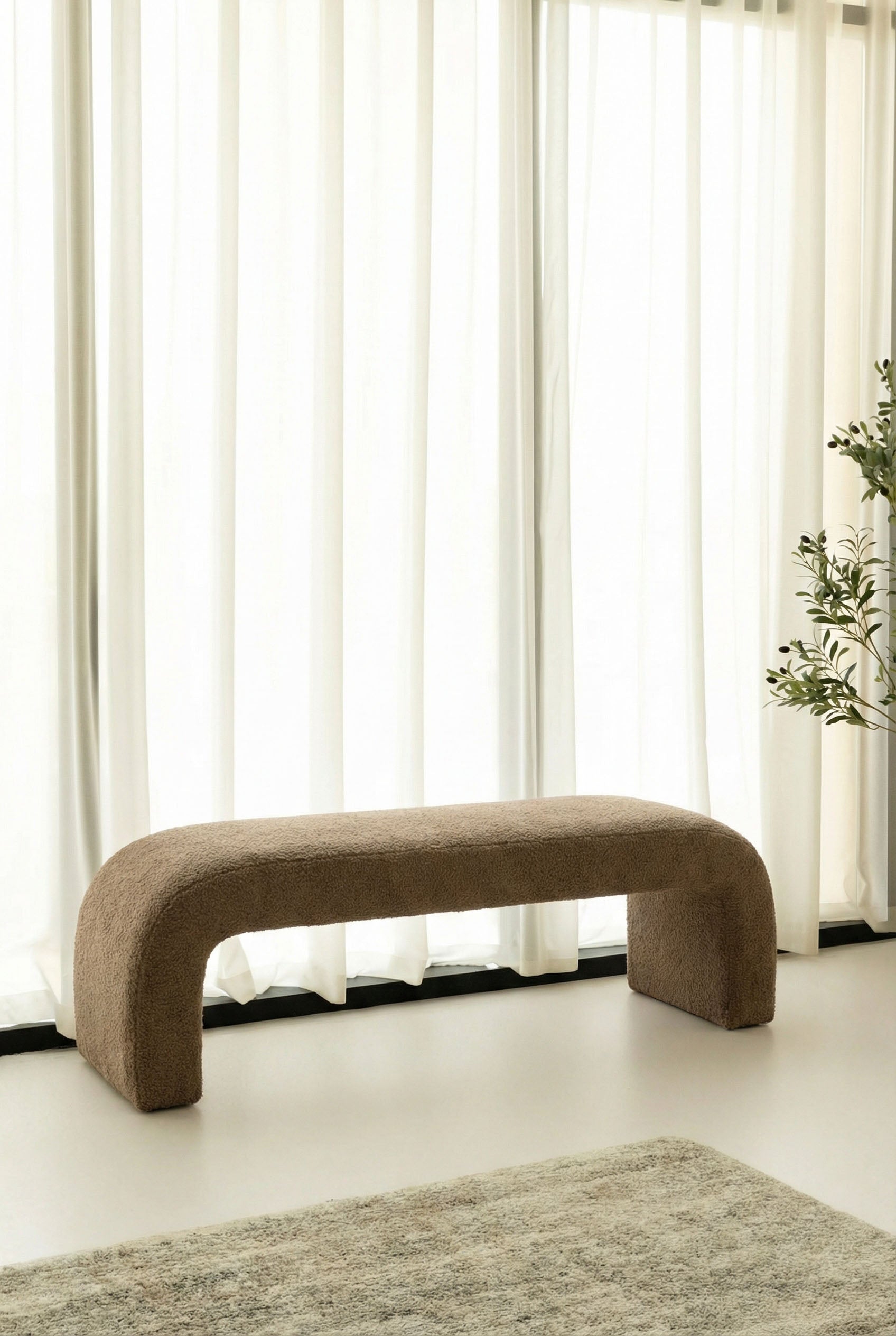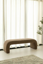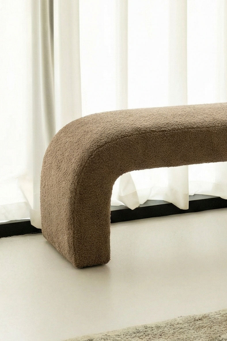 Designed to bring sculptural softness into modern interiors, this arched bench features a generously cushioned form wrapped in a rich brown textured fabric that feels warm and inviting. The curved silhouette creates a grounded yet elegant presence, making it a natural focal point at the foot of a bed, along an entryway wall, or within a calm living space. Its refined proportions and tactile finish add depth and comfort while blending effortlessly into contemporary and organic styled interiors.