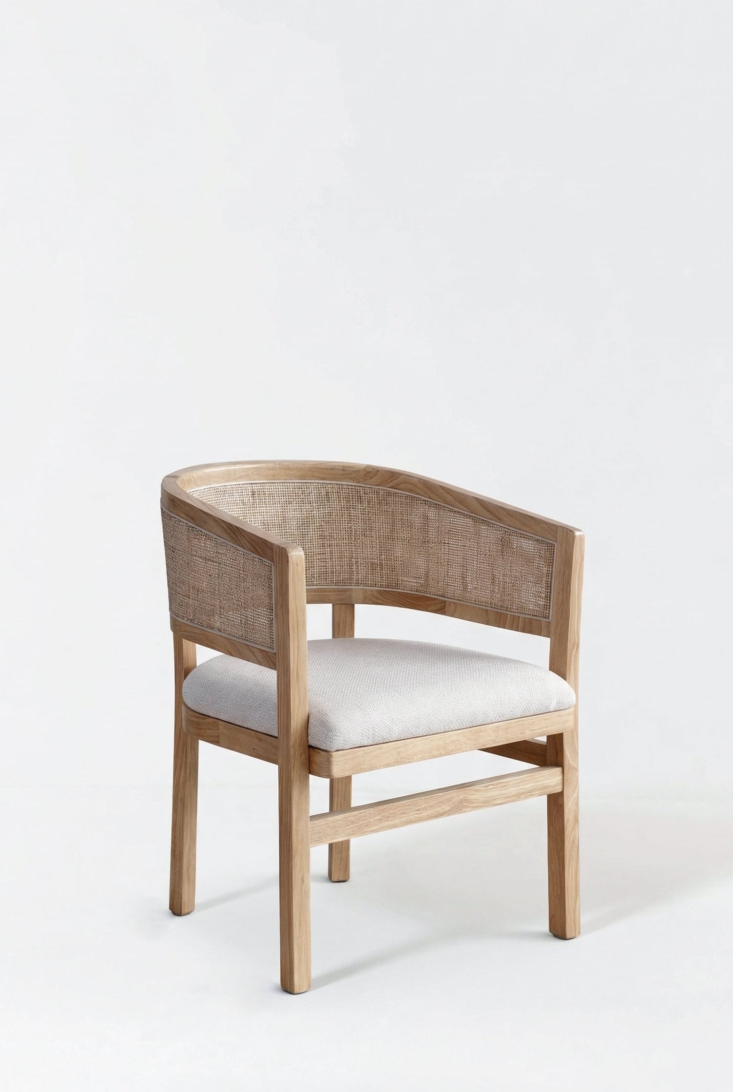 Natural wood framing curves gracefully around woven cane panels, creating a warm, airy silhouette with timeless Mediterranean charm. The soft neutral cushion adds inviting comfort while highlighting the organic texture and craftsmanship of the frame. You bring effortless coastal elegance and relaxed sophistication into your dining space.