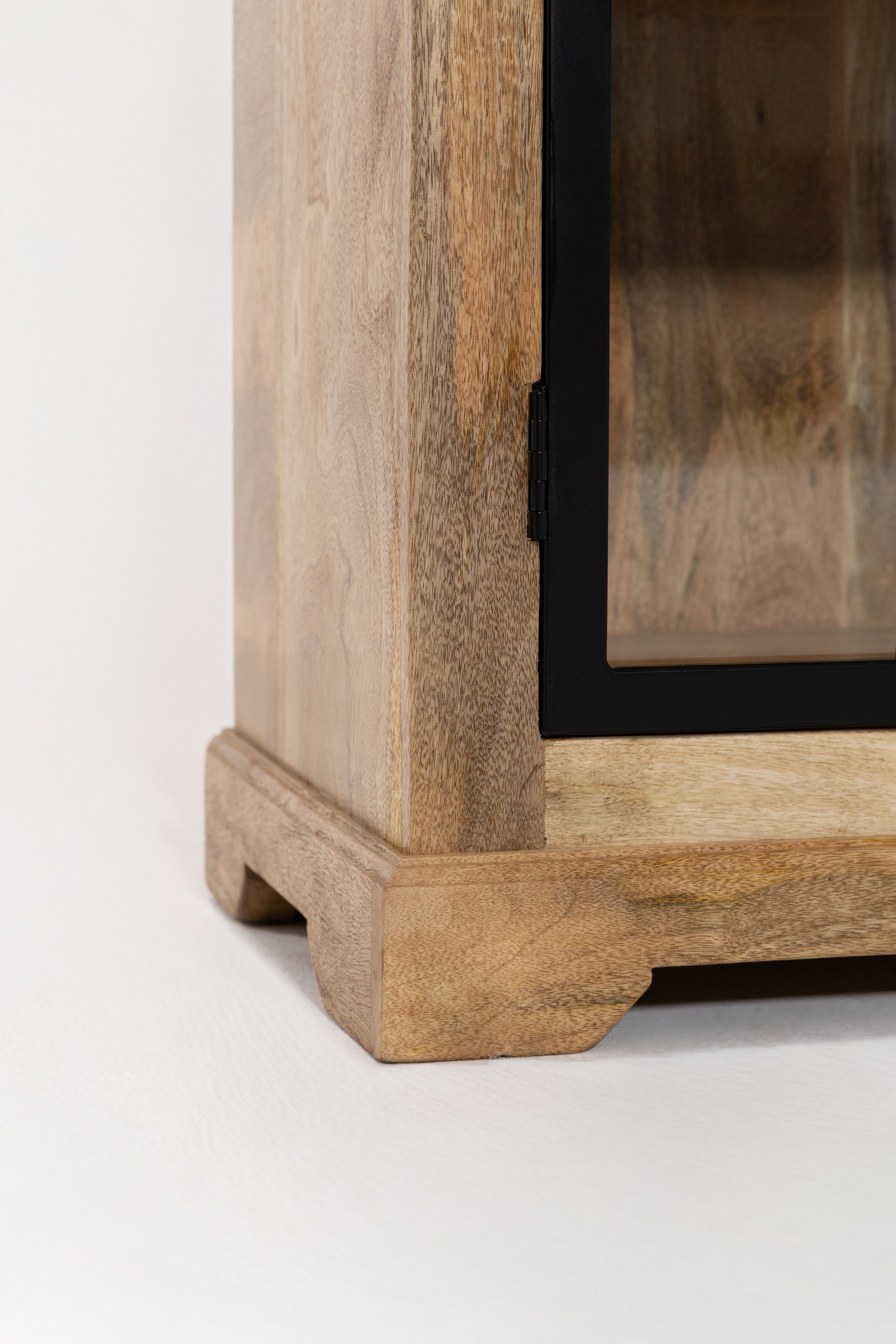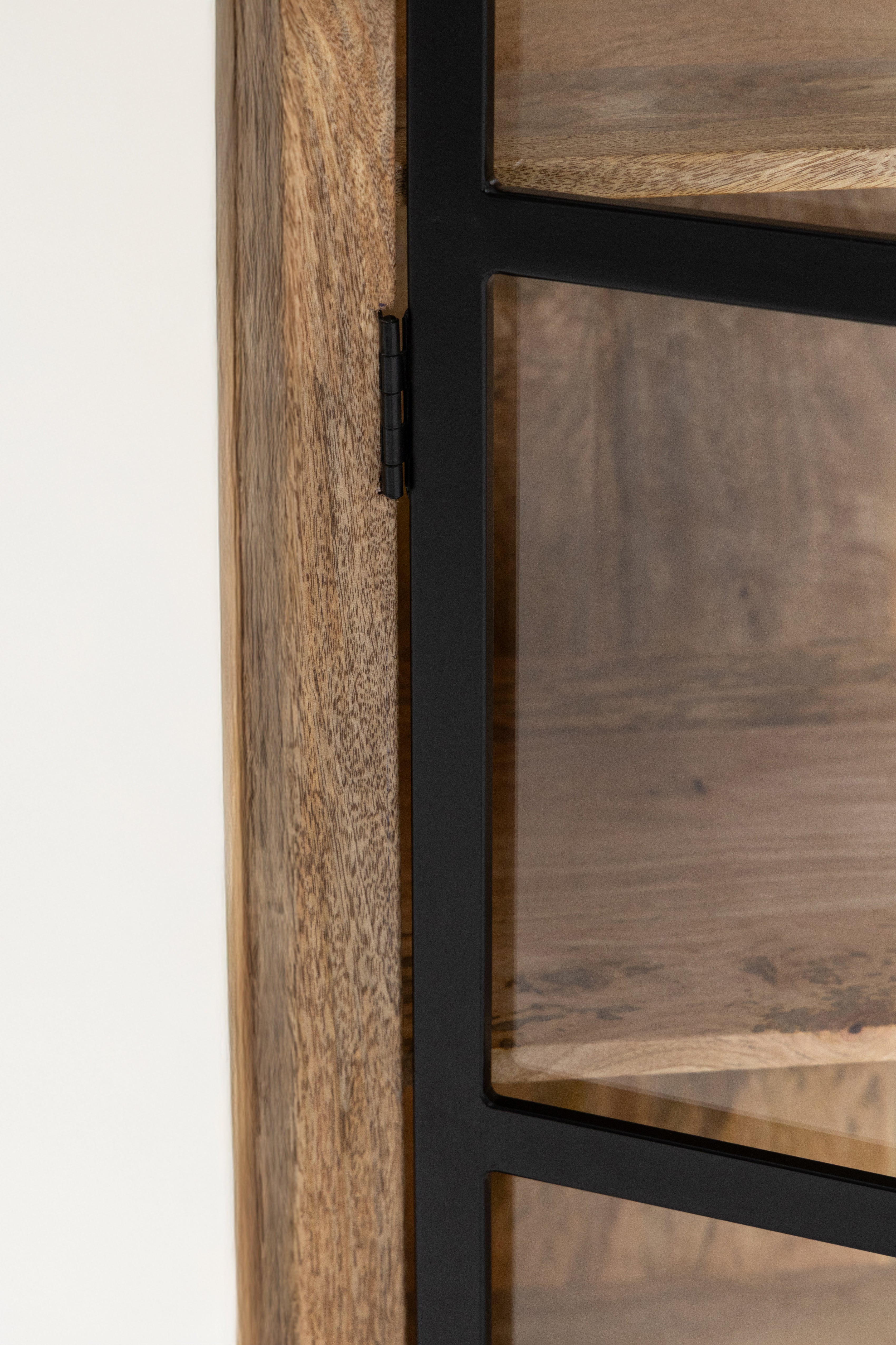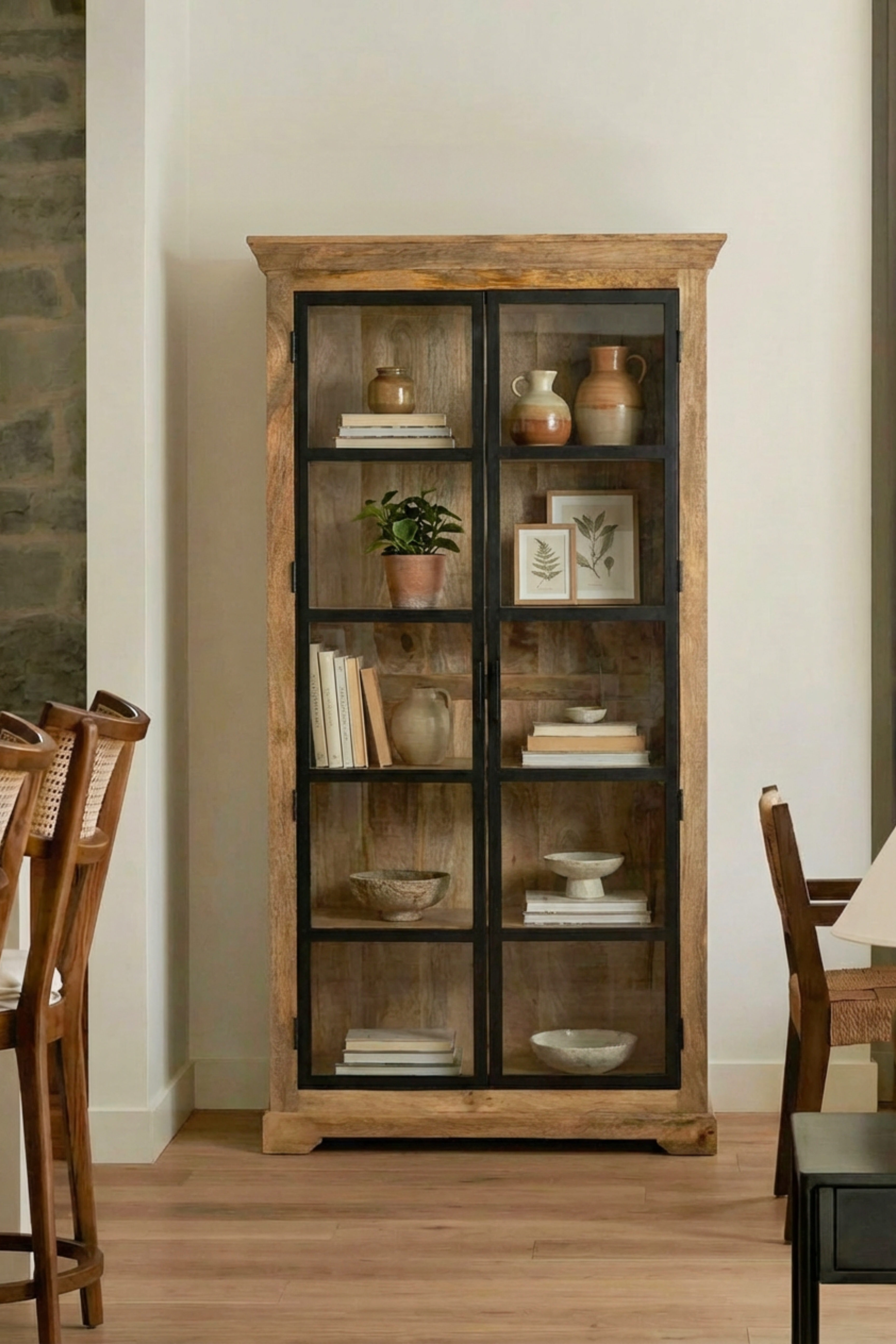 Defined by a refined balance of natural warmth and industrial character, this cabinet is crafted from solid mango wood and framed with sleek black metal doors that reveal its beautifully grained interior. The tall, structured silhouette offers generous display and storage while maintaining a light, architectural presence.