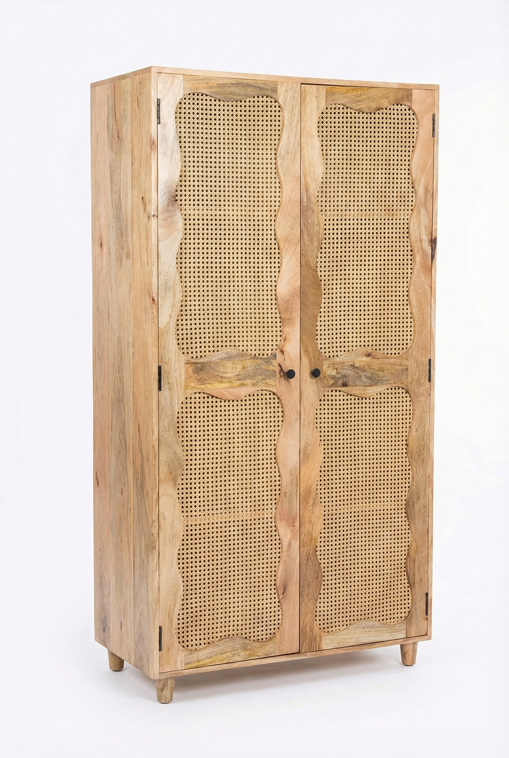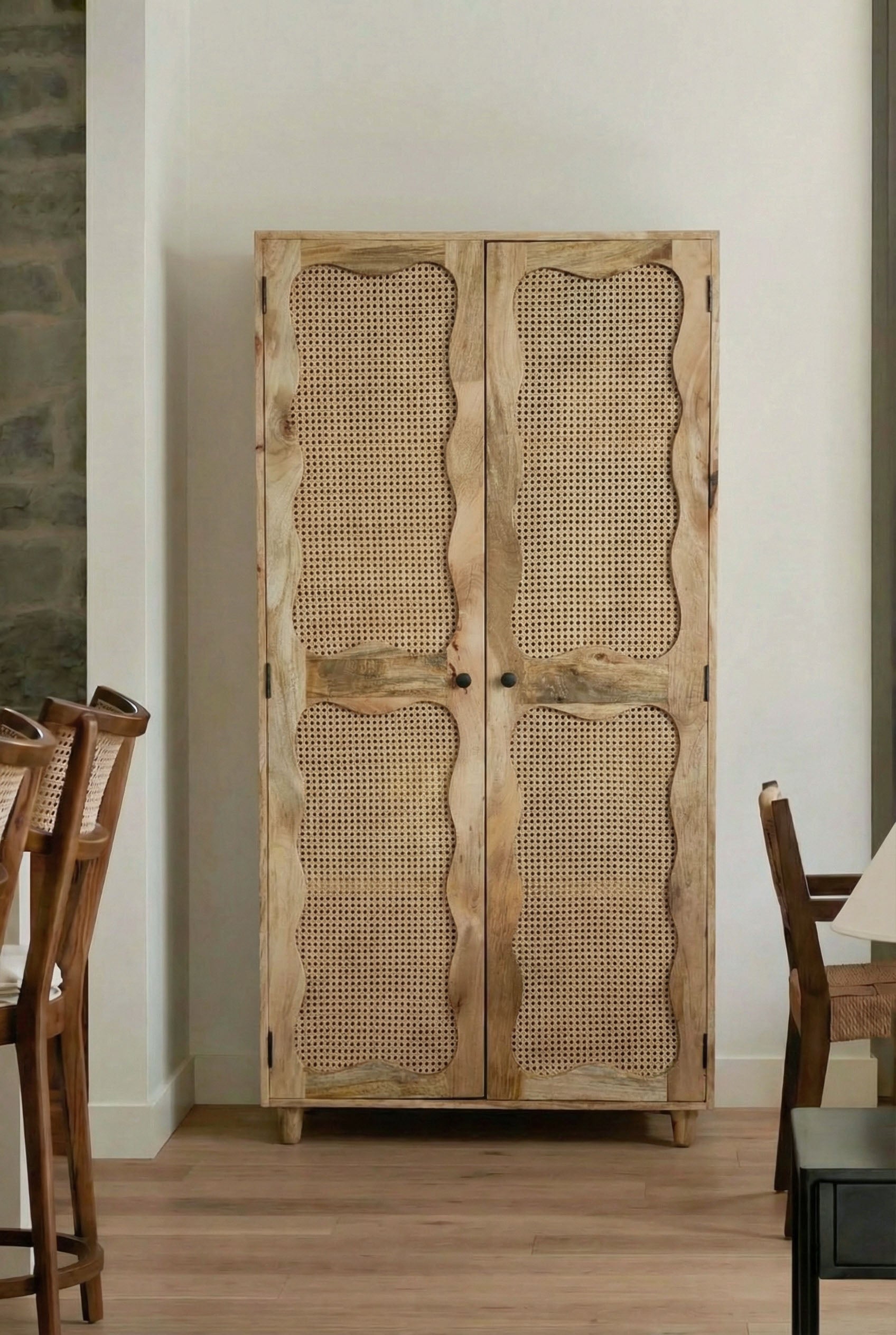 Crafted from beautifully grained wood and finished with woven cane panel doors, this tall cabinet brings softness and natural texture into your space. The signature wave inspired detailing adds an artisanal touch while keeping the silhouette clean and elevated, making it ideal for bedrooms, living rooms, or entryways. Designed for generous concealed storage, it offers a refined way to organize essentials while enhancing your home with warm, timeless character.