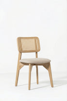 Crafted from solid mango wood, this dining chair blends organic warmth with refined craftsmanship through its sculpted frame and woven cane backrest that adds airy texture and visual depth. The softly upholstered seat enhances comfort while preserving its clean natural aesthetic, making it ideal for modern, coastal, and contemporary interiors. Designed to elevate everyday dining, it brings timeless character and understated luxury into your space.