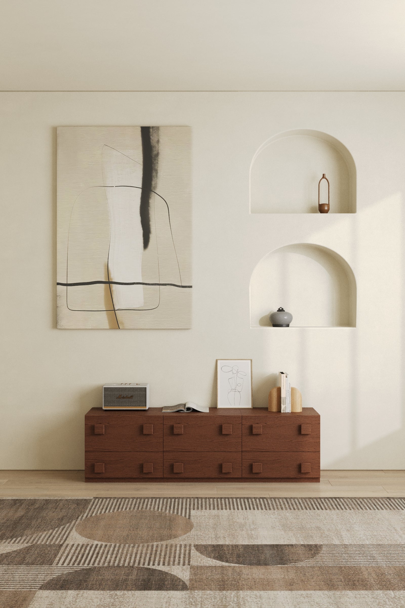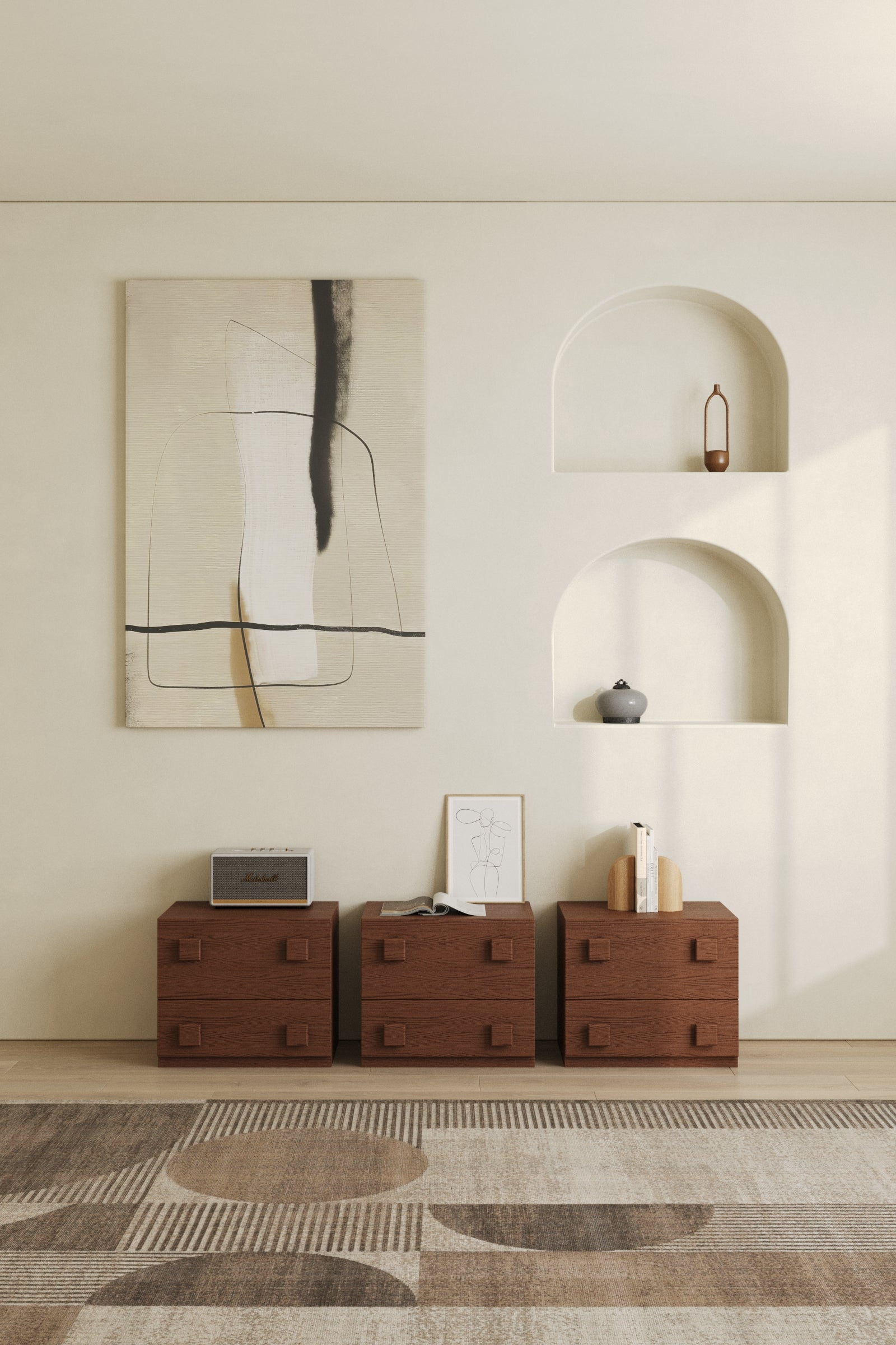 Add depth and sophistication to your space with a dark wood sideboard cabinet set that blends storage with sculptural design, crafted as separate units that are not attached to each other. Style the pieces together for a bold statement, or arrange them individually as a media unit, bedside tables, or versatile storage accents that fit your space. The rich finish creates a grounded, luxurious presence, while the tessera inspired drawer layout brings subtle texture and modern structure to the silhouette. Perfect for living rooms and open plan interiors, each unit keeps everyday items neatly concealed to maintain a clean, polished look. Finished with a spacious top surface for styling décor, statement pieces, and art books, it delivers a refined, elevated feel from every angle.