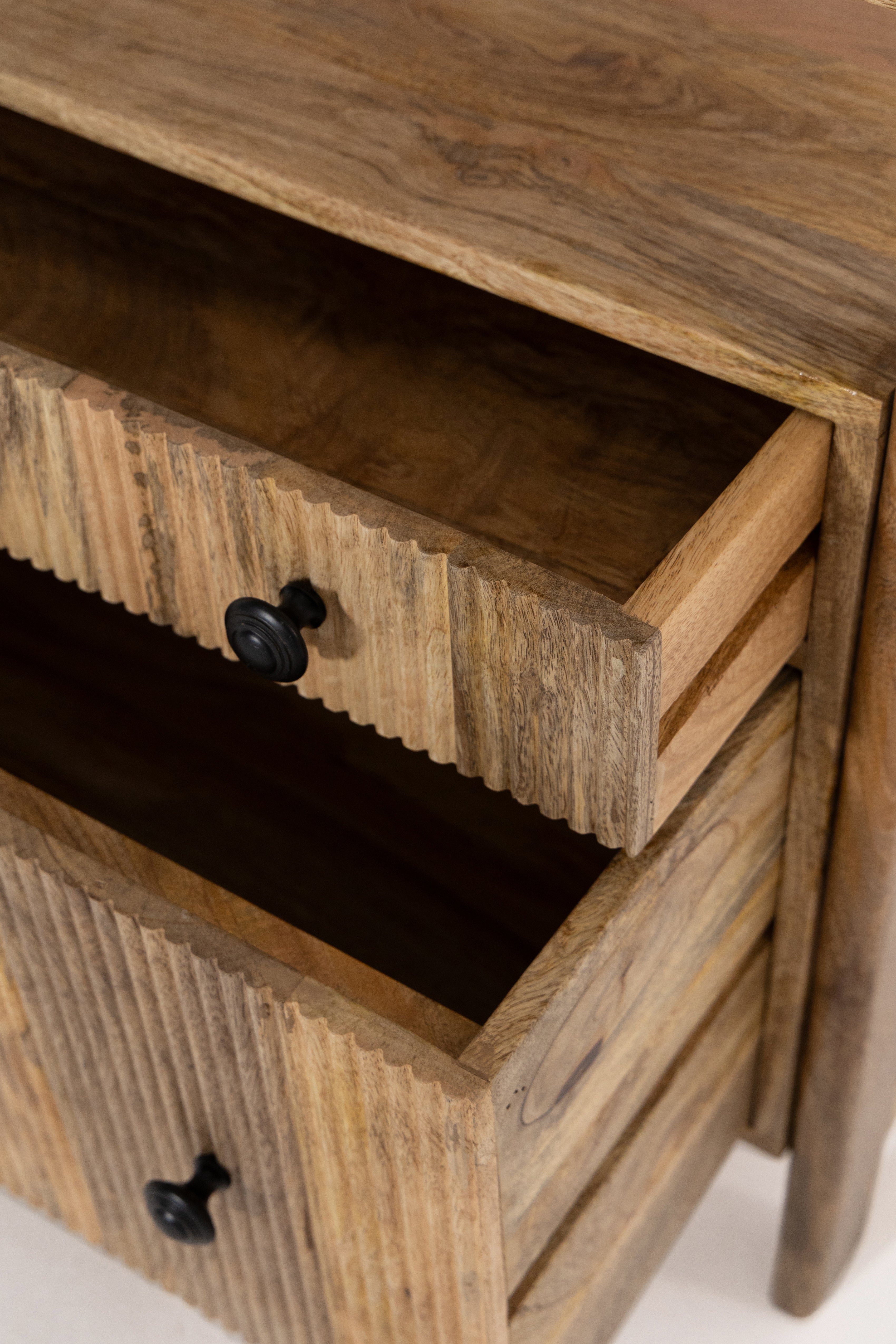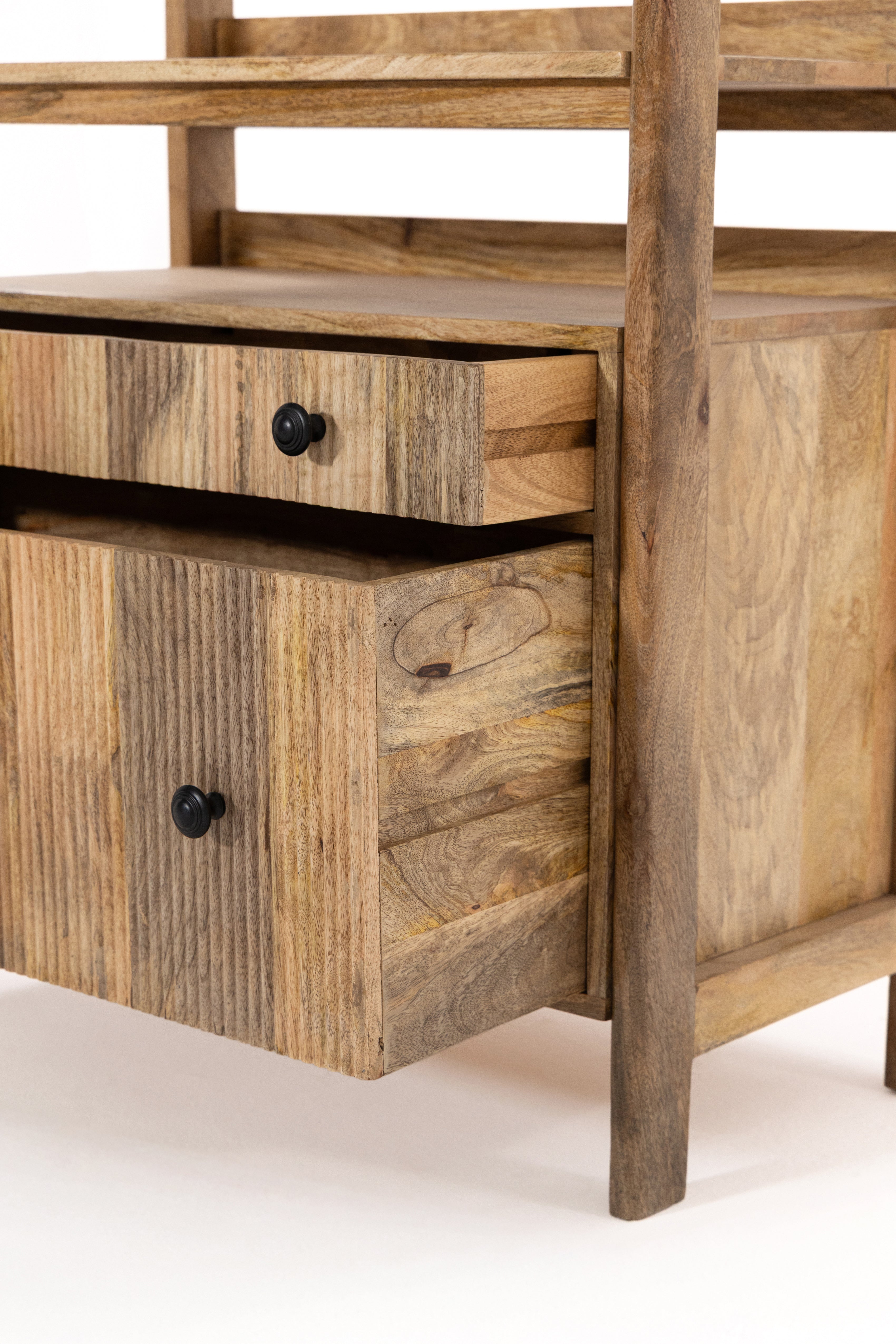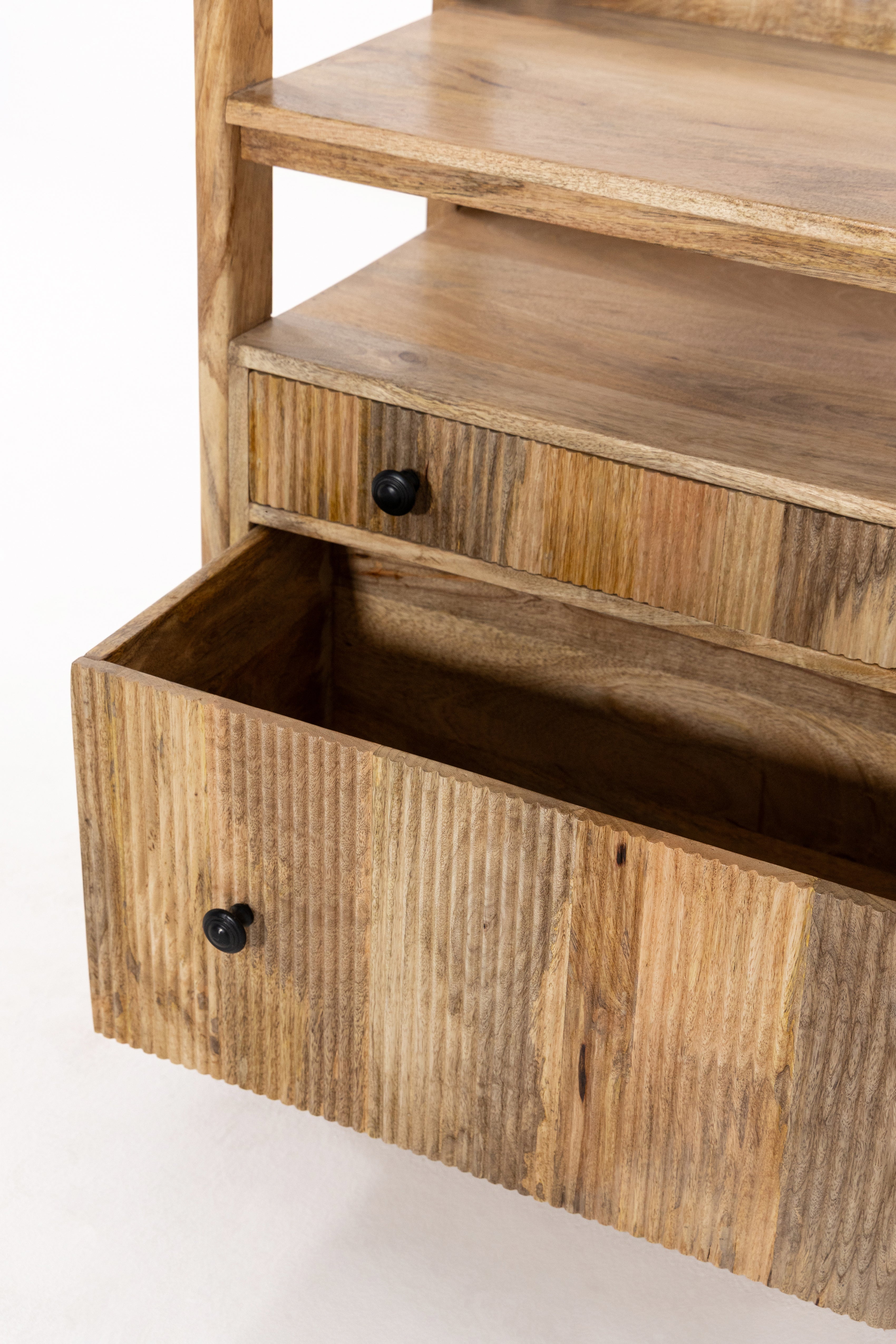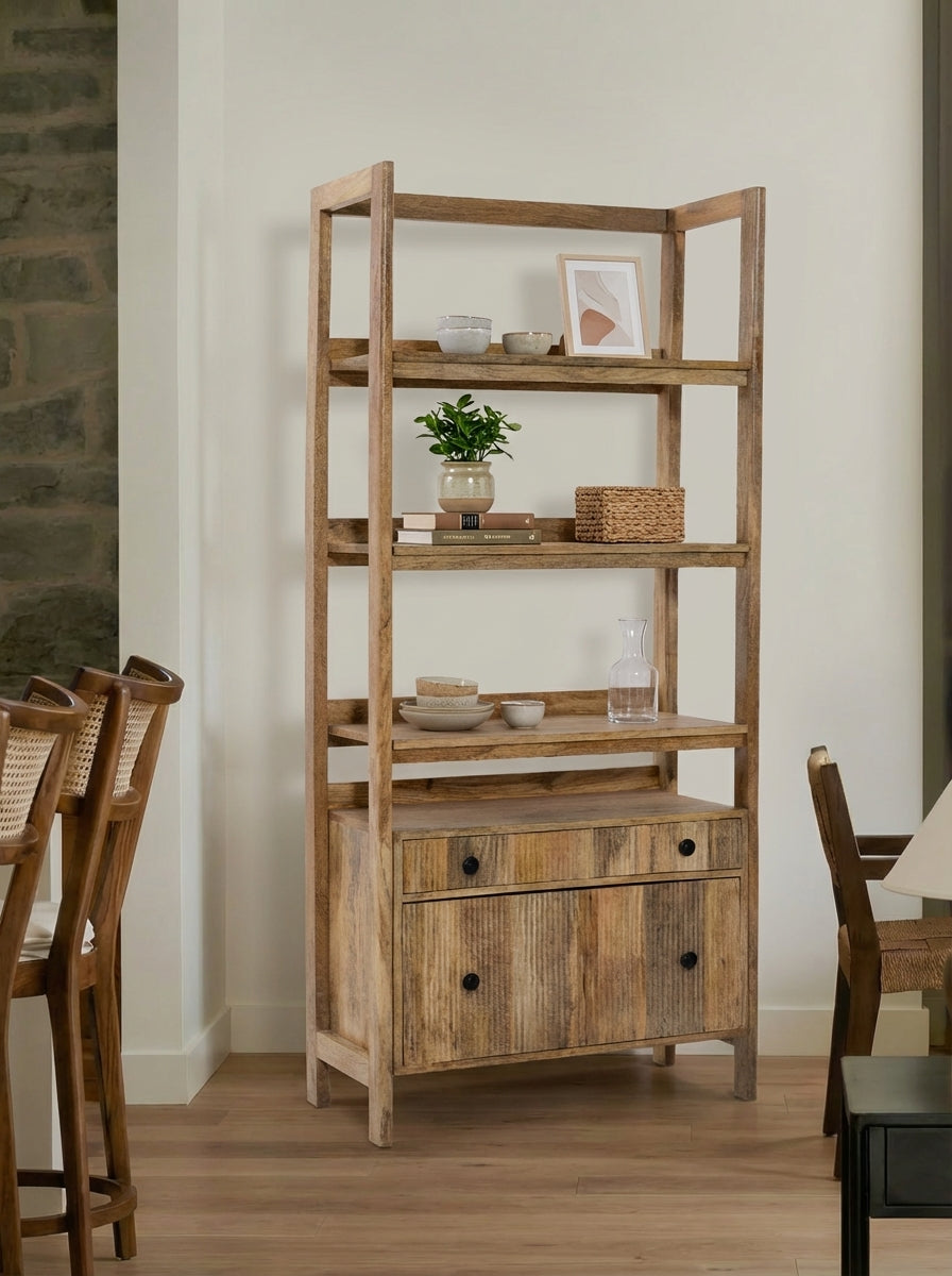 Designed to combine open display with practical storage, this display shelves unit is crafted from solid mango wood and defined by a clean, structured frame that feels both warm and refined. Multiple open shelves create an airy space for styling books, decor, and personal pieces, while two lower drawers offer discreet storage to keep essentials neatly tucked away.