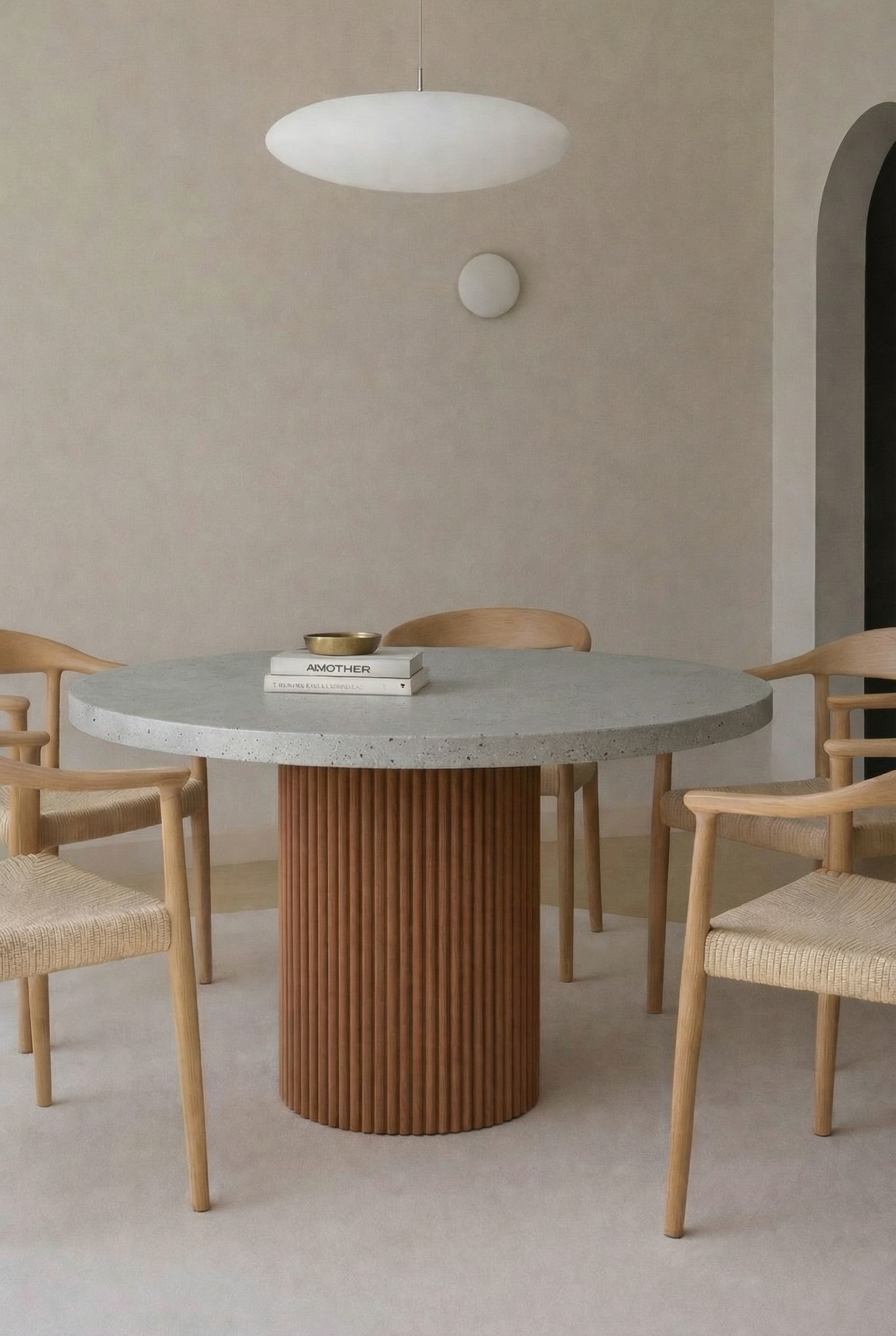 Designed with a refined round silhouette, this coffee table features an ash grey speckled microconcrete top that showcases a soft matte texture enriched with subtle dark flecks for added dimension. The sculptural fluted cylindrical base in a warm natural tone creates a beautiful contrast, balancing cool stone hues with organic warmth. Its clean lines and tactile finishes bring depth and quiet sophistication to your living space, making it a timeless centerpiece for modern, minimalist, and contemporary interiors that celebrate texture and architectural form.