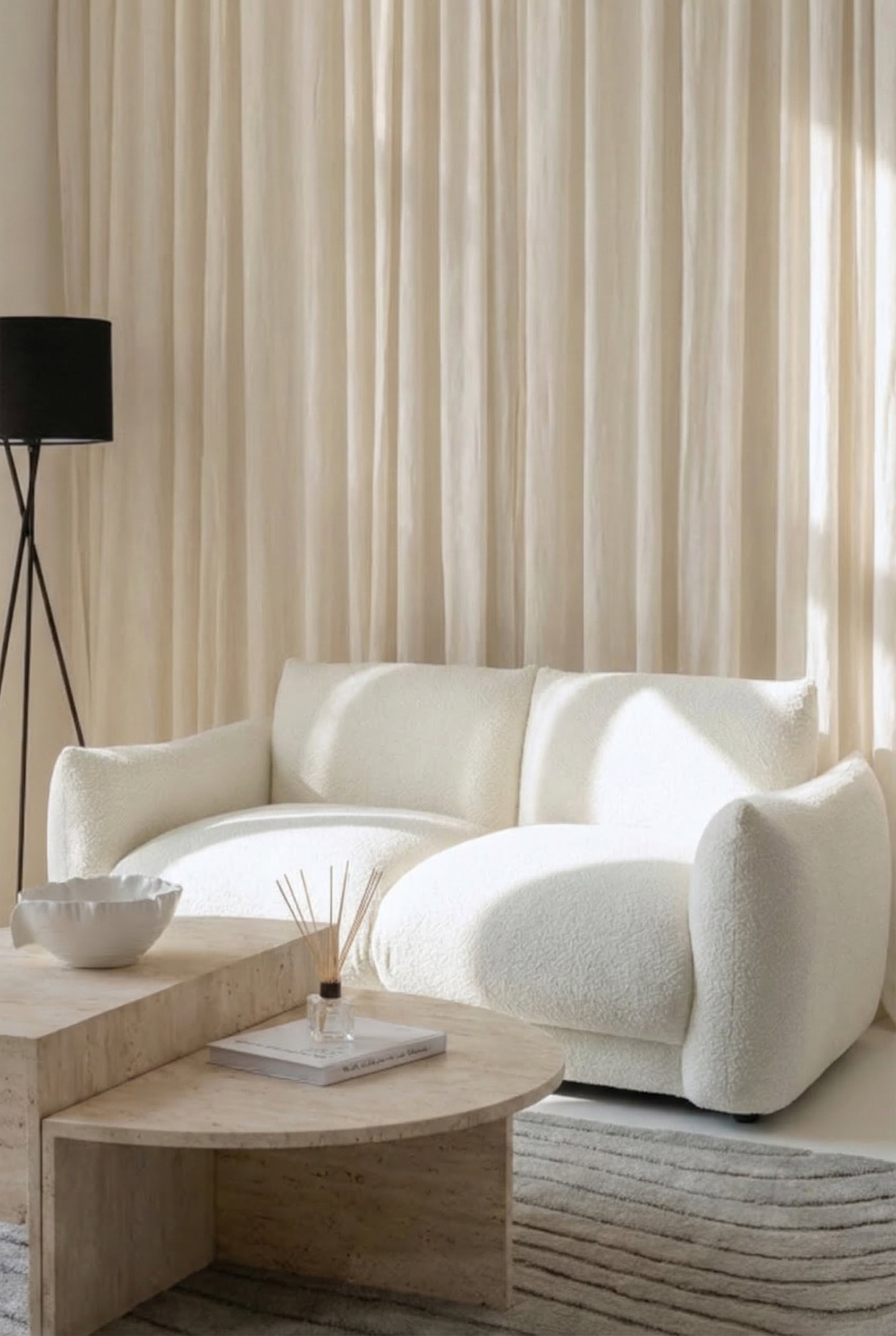 A sculptural silhouette that embodies minimalist elegance. Wrapped in textured ivory upholstery, its curved armrests and deep seating create a visually inviting presence. The refined modular design, enhanced by boucle-style fabric, brings a sense of modern sophistication to any interior. Ideal as a focal point in contemporary living spaces, it balances clean lines with an effortlessly elevated aesthetic.