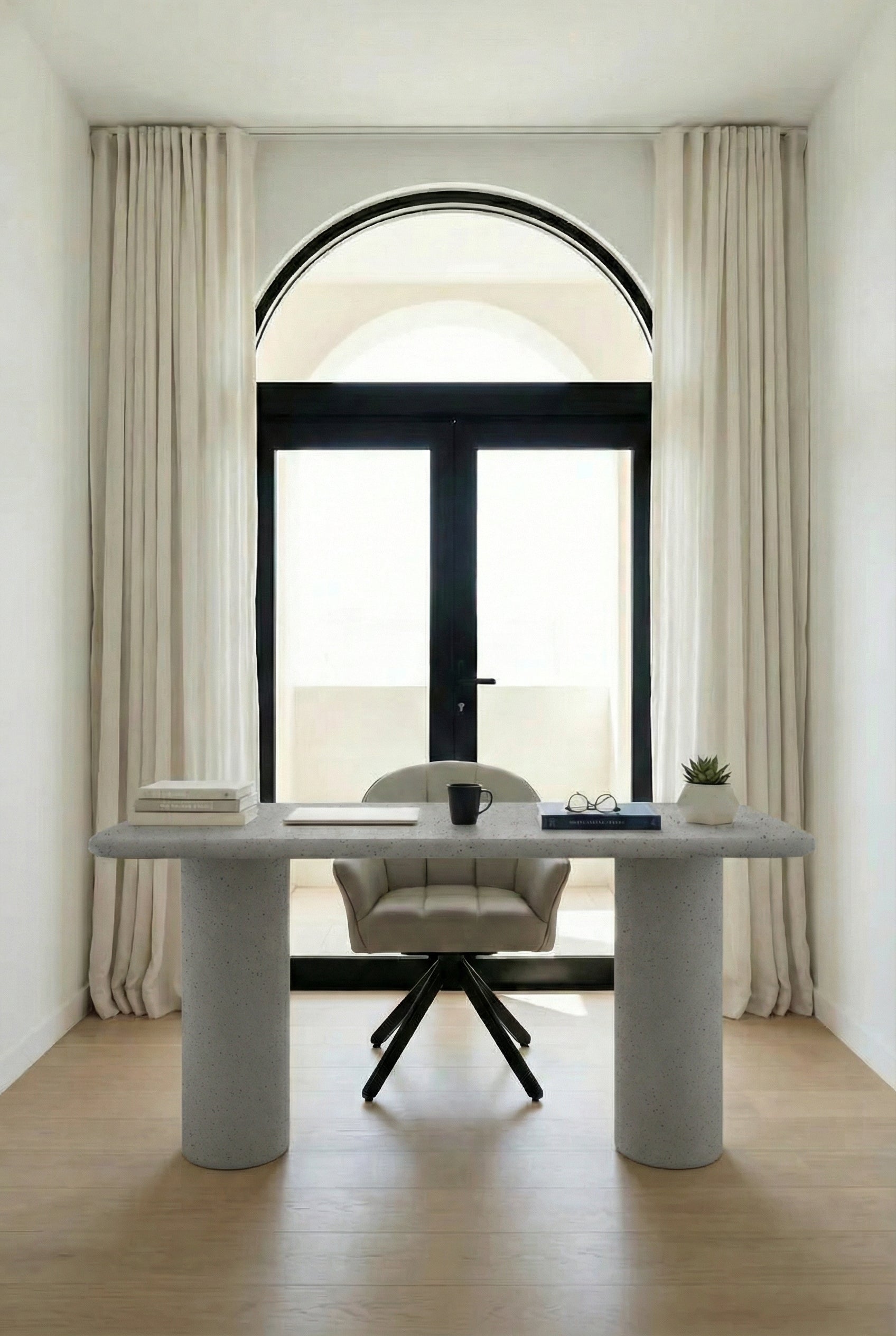 A refined ash grey microconcrete surface enriched with delicate speckled detailing brings subtle texture and quiet sophistication to your workspace, while sculptural cylindrical legs and a smooth matte finish create a harmonious balance of strength and softness, allowing you to design a serene, modern office that feels grounded, elegant, and effortlessly elevated.
