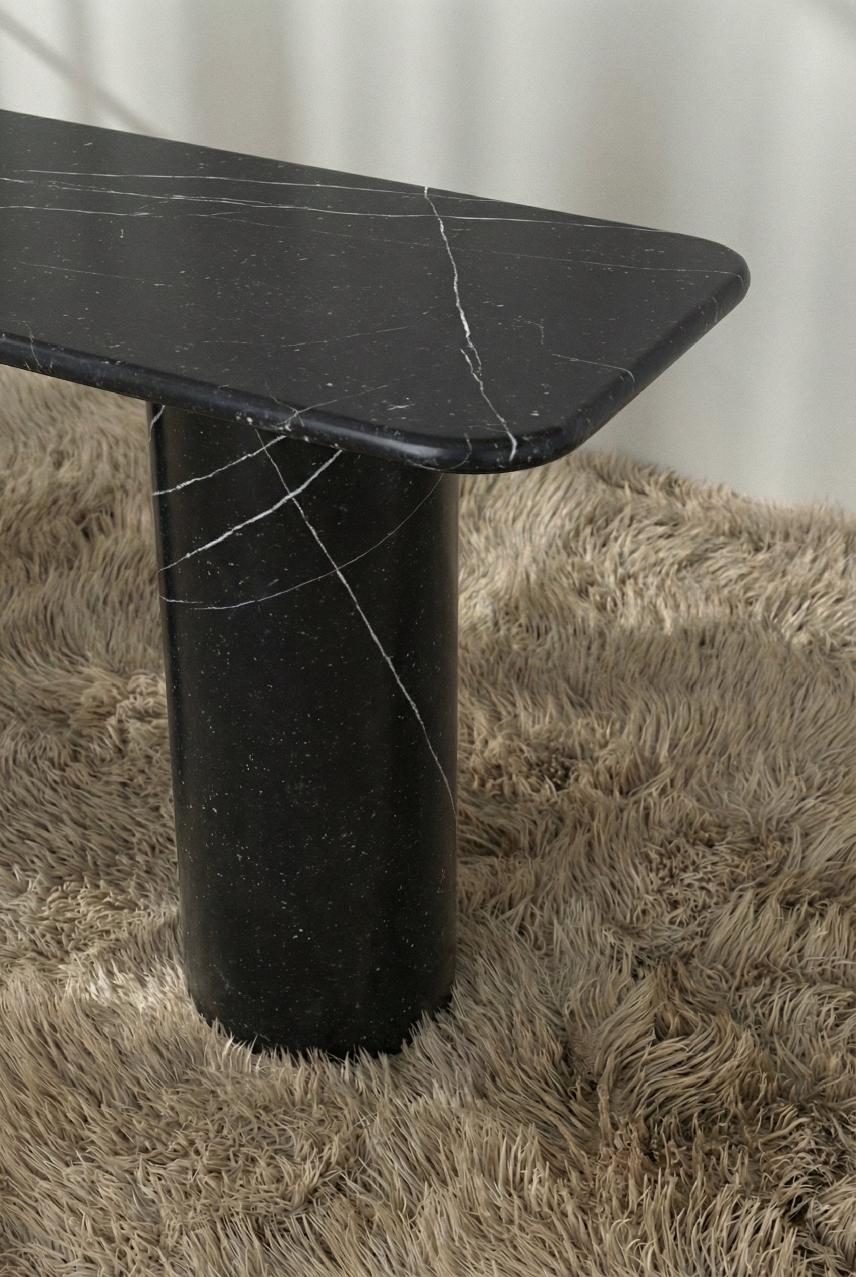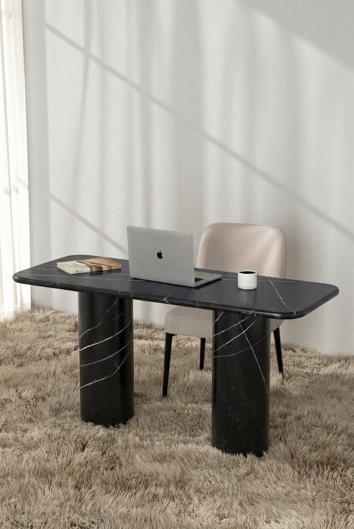 Polished Black Marquina marble anchors the space with dramatic contrast and quiet authority, where bold white veining and sculptural cylindrical legs create a refined workspace that feels grounded, intentional, and effortlessly modern, elevating focused moments with timeless architectural elegance.