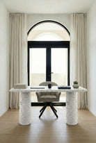 Soft rialto microterrazzo microconcrete with delicate stone speckling and a smooth matte finish creates an uplifting workspace that feels balanced and thoughtfully composed, enhancing focus and creativity while adding visual texture, modern elegance, and sculptural presence to serene home offices and refined interiors.