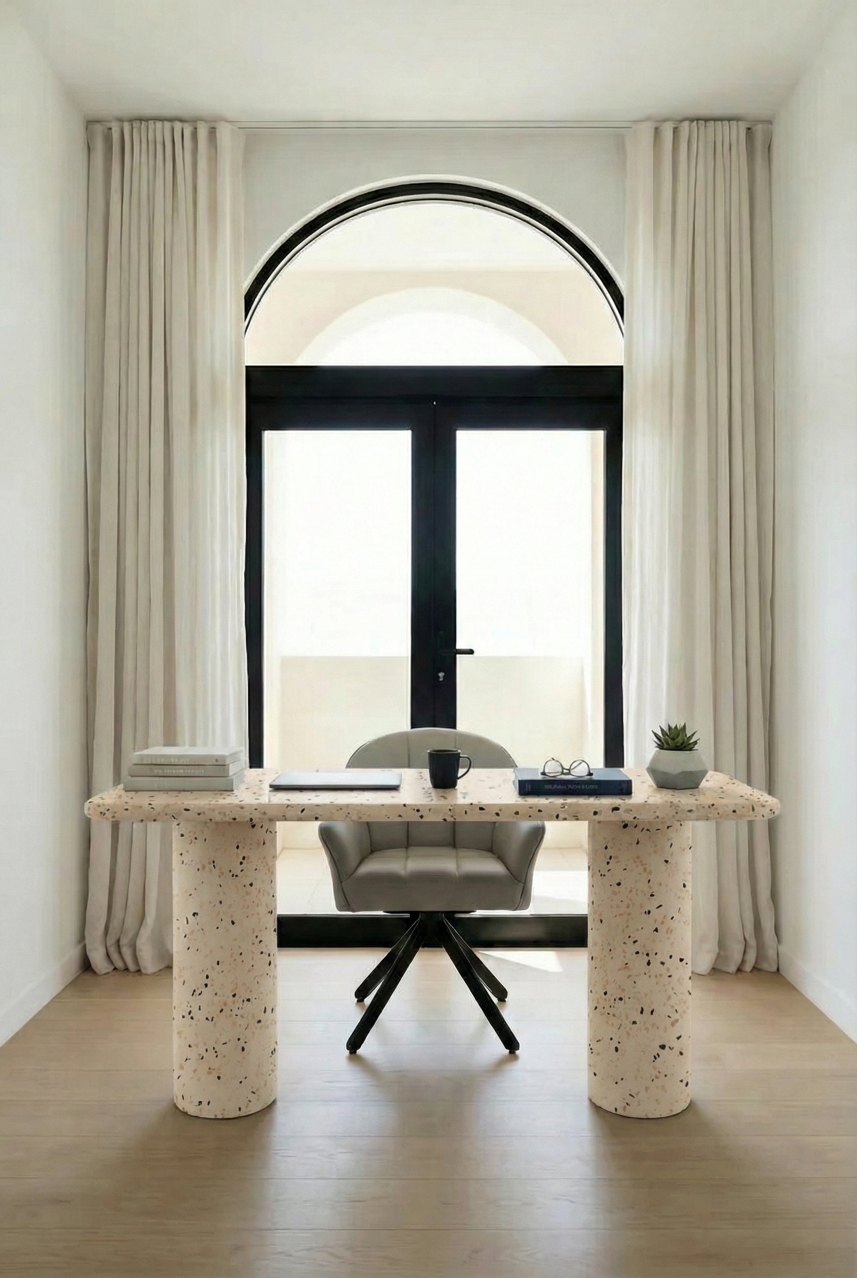 Warm venezian microterrazzo microconcrete with softly scattered stone fragments and a smooth matte surface creates a refined workspace that feels calm and intentional, allowing natural light to reflect gently while adding visual depth, modern elegance, and sculptural balance to thoughtfully curated home offices and serene interiors.