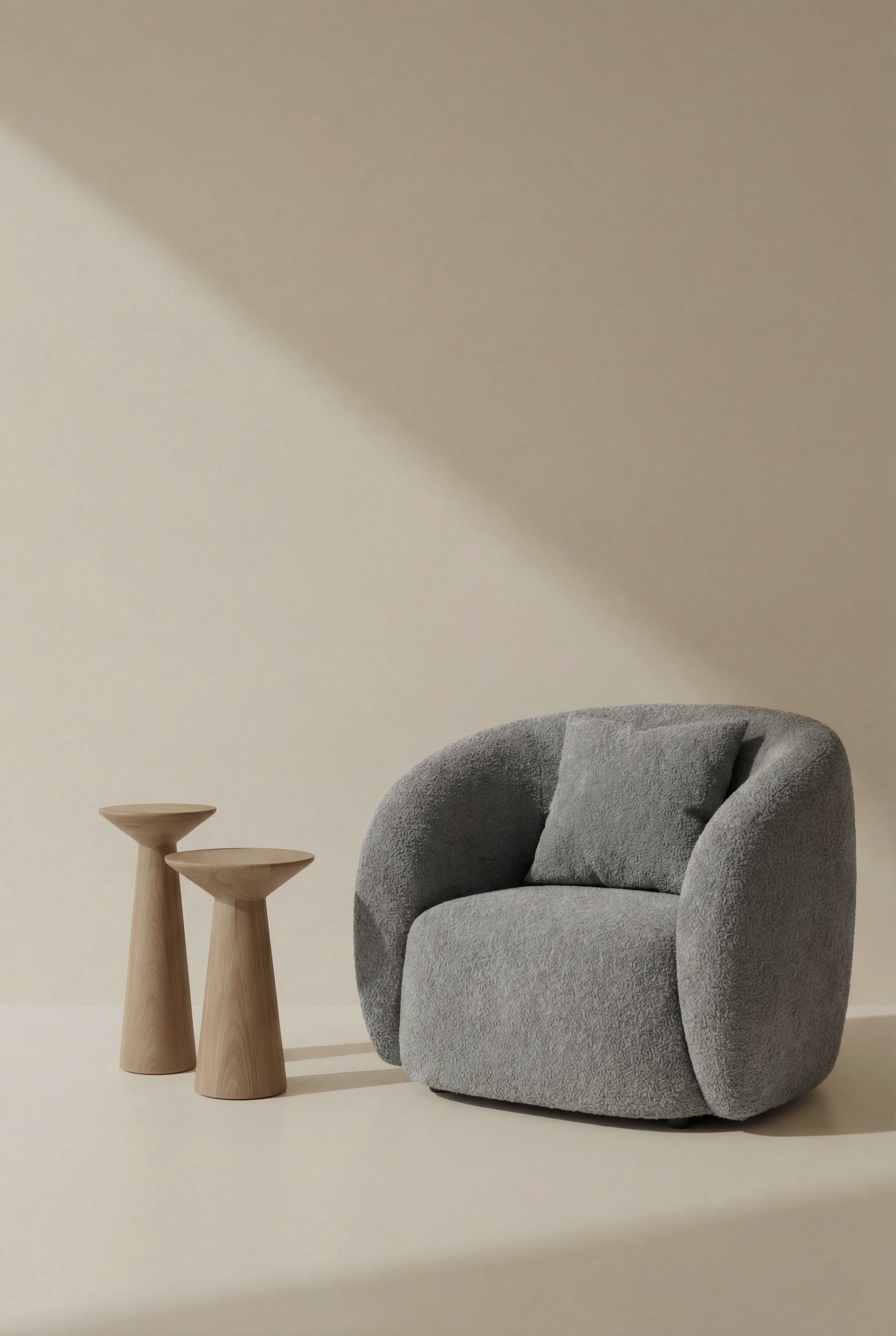 Soft curves and generous cushioning create an inviting seat designed for comfort and modern elegance. Upholstered in textured grey boucle, the form brings warmth and depth to contemporary interiors while maintaining a sculptural presence. The rounded silhouette embraces the body for a relaxed lounging experience, making it an ideal statement piece for living rooms, reading corners, or stylish lounge spaces.