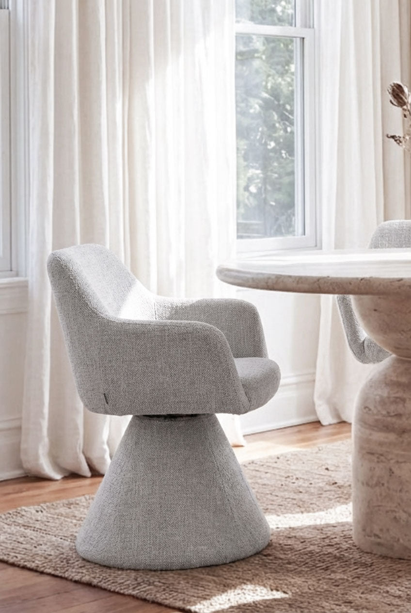 Indulge in effortless elegance with a modern swivel dining chair upholstered in a soothing repose grey bouclé that brings soft texture and visual calm to your space. The sculpted silhouette features gently curved armrests and a refined conical base, creating a balanced look that feels both contemporary and inviting. Designed for comfort and ease, the smooth 360° swivel allows flexible movement for everyday dining or relaxed lounging. A timeless seating choice that complements modern, minimalist, and Scandinavian interiors with quiet luxury.