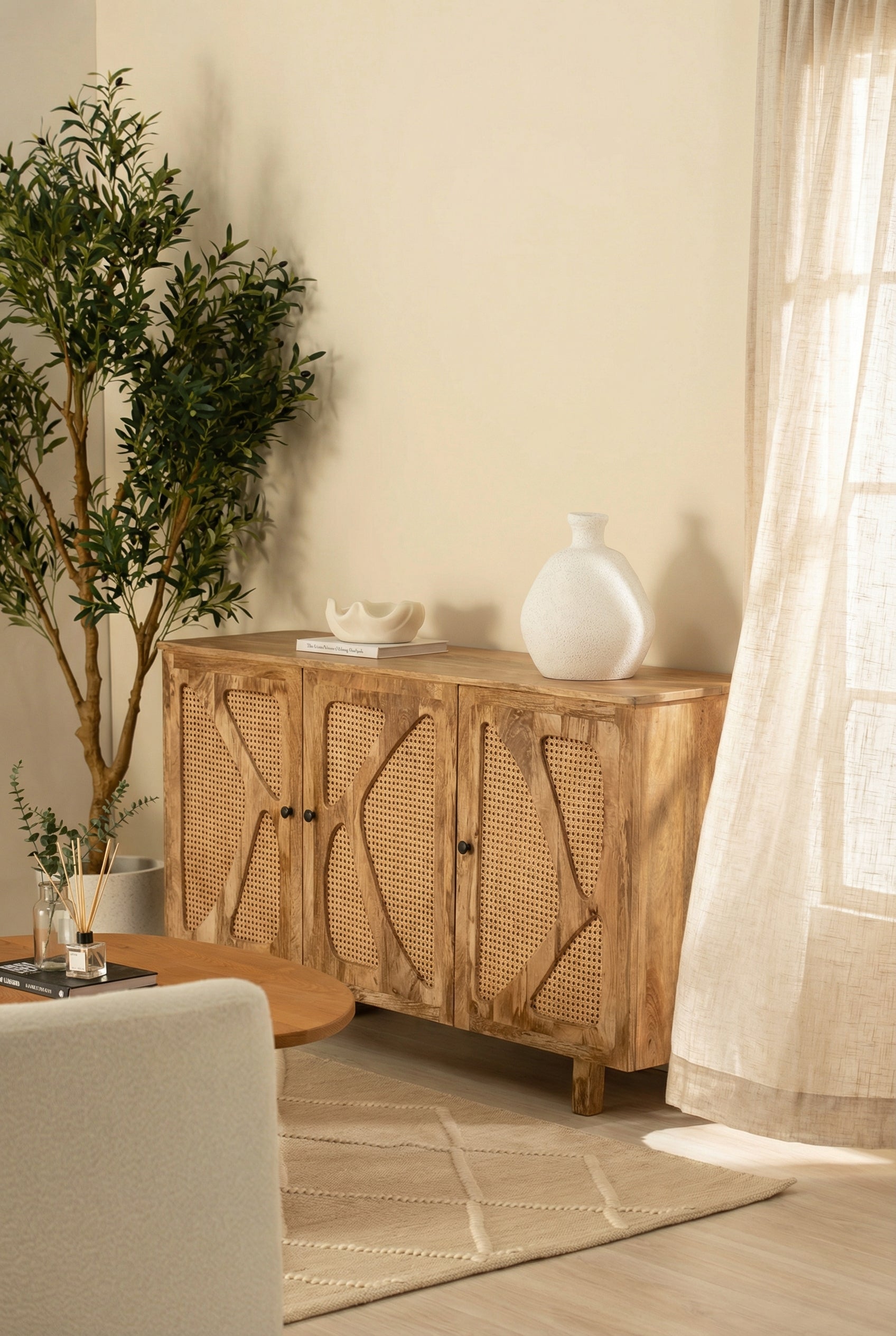 Designed to anchor your dining or living space with warmth and texture, this wooden sideboard features sculptural cane panel doors framed in richly grained wood. The organic detailing creates visual depth while maintaining a clean and balanced silhouette, making it ideal for contemporary and earthy interiors alike. Perfect for storing tableware, linens, or curated decor, it blends functionality with natural elegance to elevate everyday living.