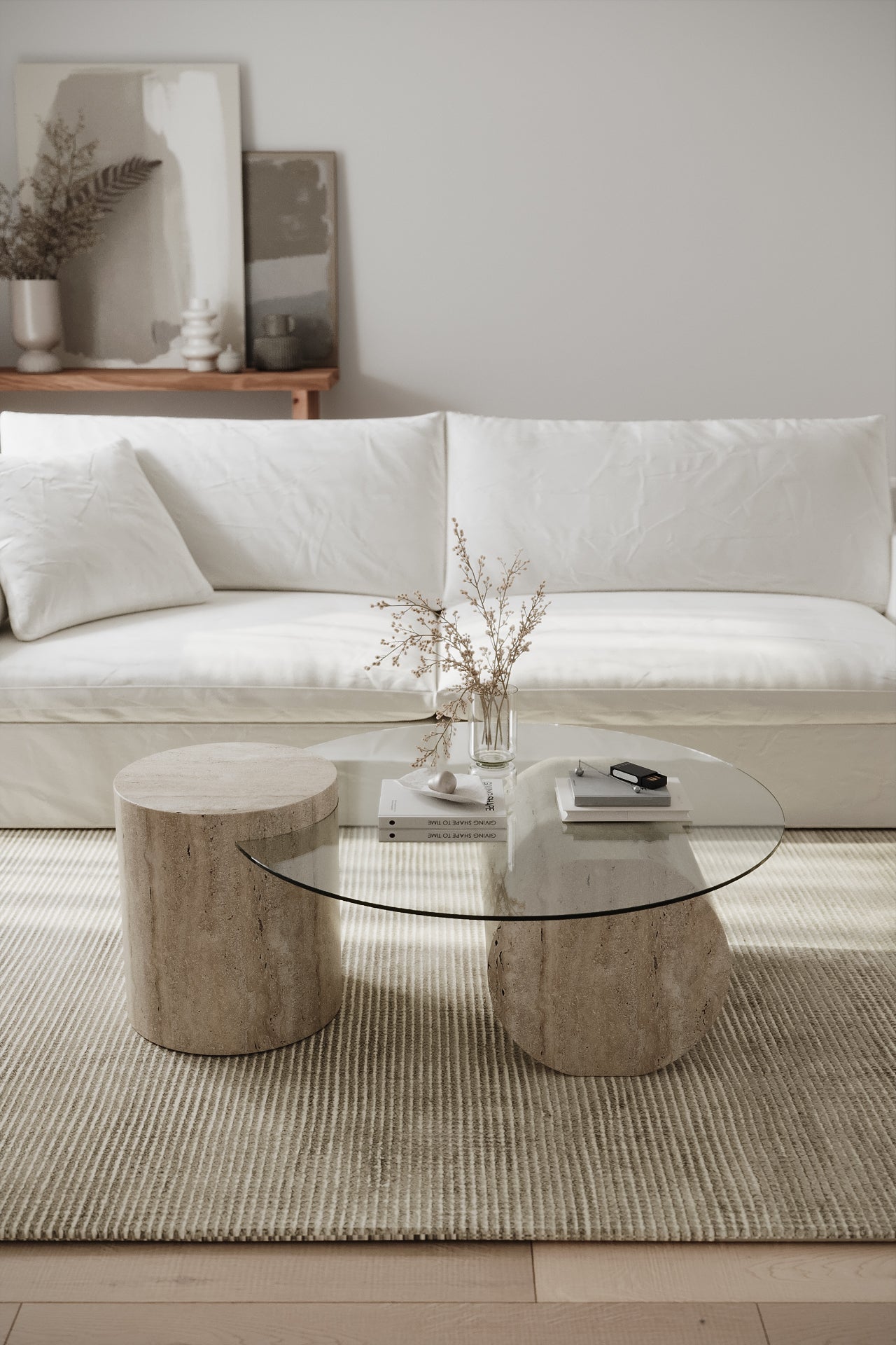 A striking fusion of natural travertine and crystal-clear tempered glass. Picture yourself gathering around its smooth, oval glass top, gracefully balanced on two cylindrical travertine bases with warm beige and cream stone veins that tell a story of timeless elegance. Its minimalist, sculptural form blends modern design with organic texture, making it a centerpiece that reflects your refined taste while complementing both contemporary and classic interiors. Perfect for those who appreciate art, nature, and luxury in one statement piece.