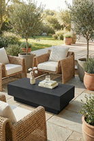 Designed for outdoor use, this black microconcrete coffee table features a clean rectangular form with a low, solid profile. The smooth matte surface has a subtle texture that reflects the material’s natural character, while the dark finish adds contrast to outdoor seating arrangements. Its block-style design provides a stable surface for everyday outdoor use, suitable for books, tableware, or decorative objects. Well suited for terraces, patios, and covered lounge areas, it pairs comfortably with modern, neutral, and monochromatic outdoor settings.