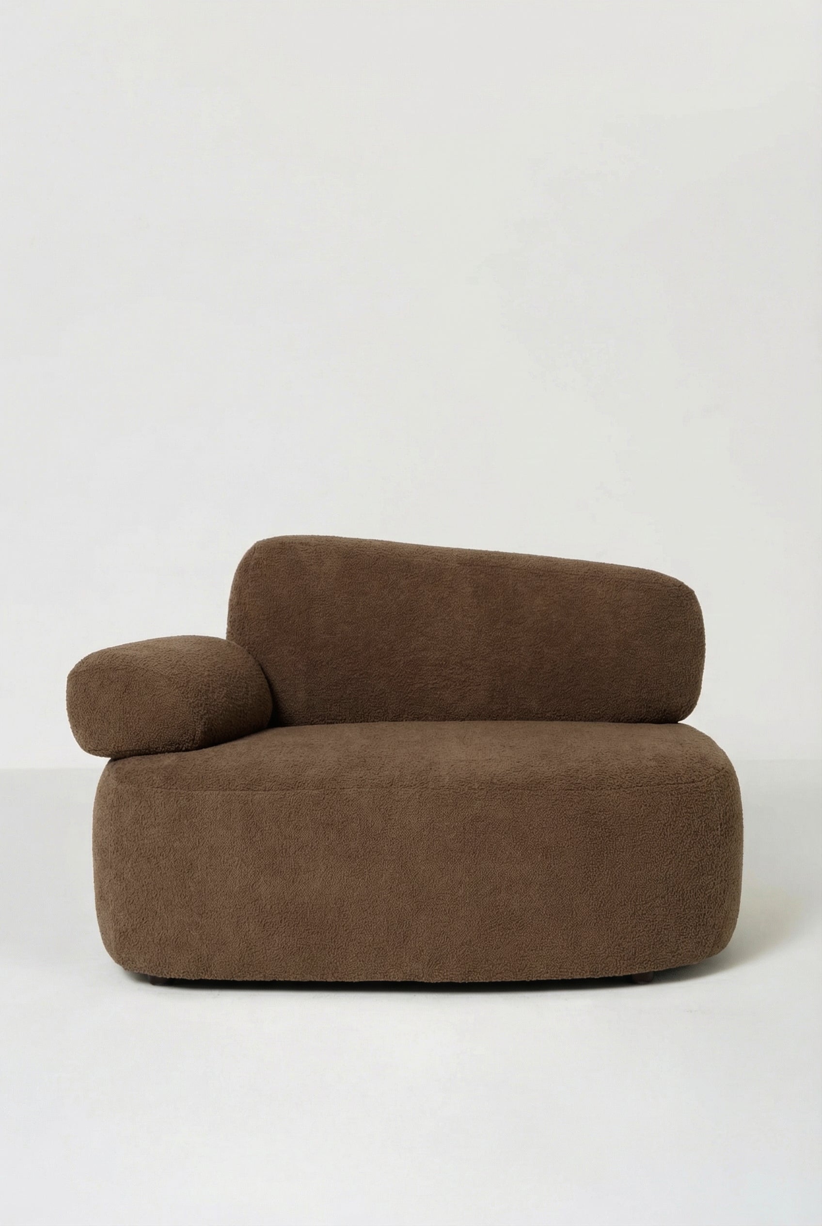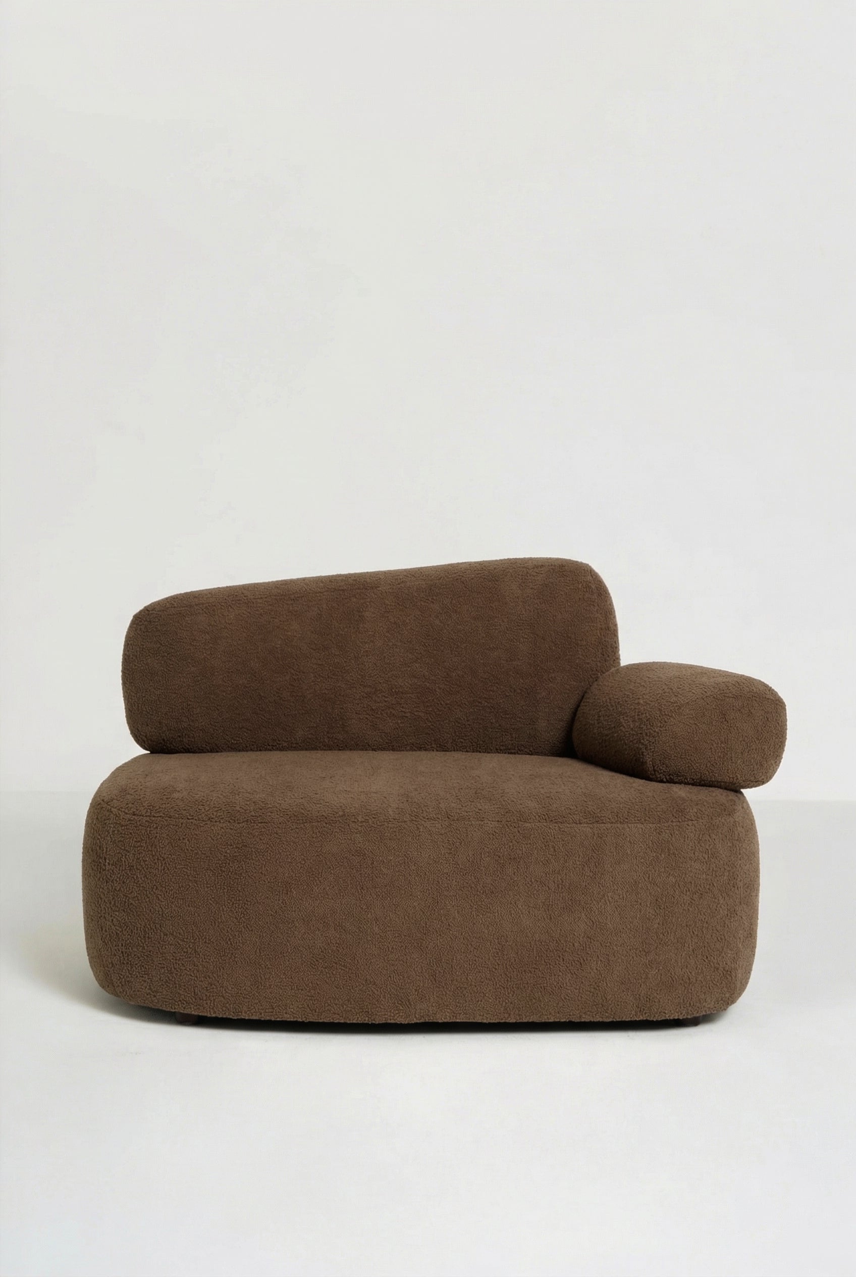 Soft sculptural curves and plush cushioning create a lounge seat that feels both inviting and refined. Upholstered in rich brown boucle, the textured fabric adds warmth and depth while the rounded silhouette introduces a modern statement to contemporary interiors. The generous seat and supportive backrest offer a relaxed lounging experience, making it an elegant accent for living rooms, reading corners, or cozy lounge spaces.