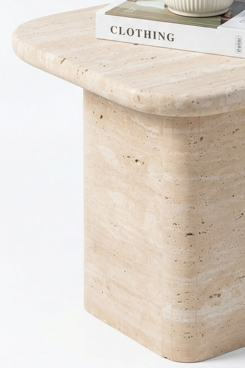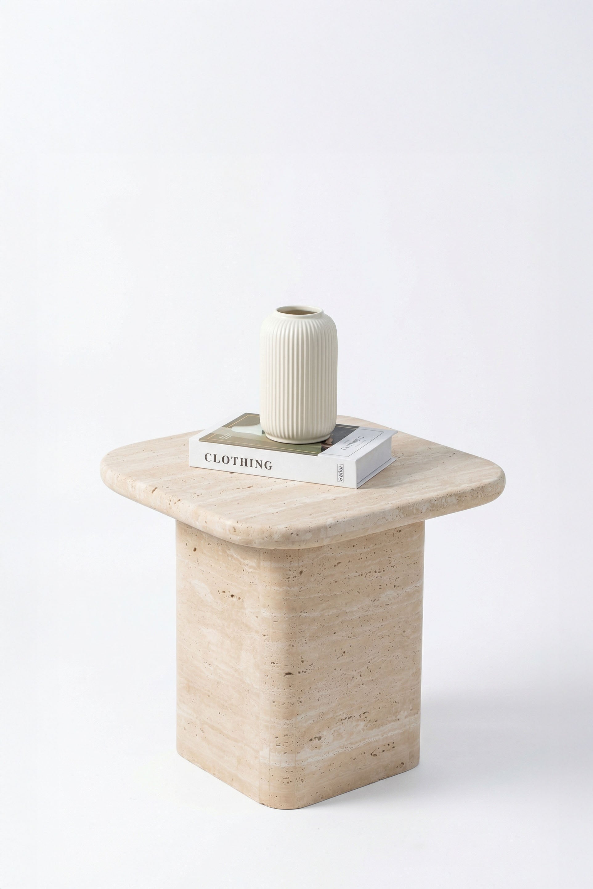 Sleek yet softly sculpted, this travertine side table brings a refined sense of balance to your space with its square top and gently rounded corners. The natural stone surface showcases delicate veining and warm tonal variation, creating an organic statement that feels effortlessly luxurious. Designed to sit beautifully beside a sofa or accent chair, it adds structure, texture, and timeless elegance while keeping your styling clean, calm, and elevated.
