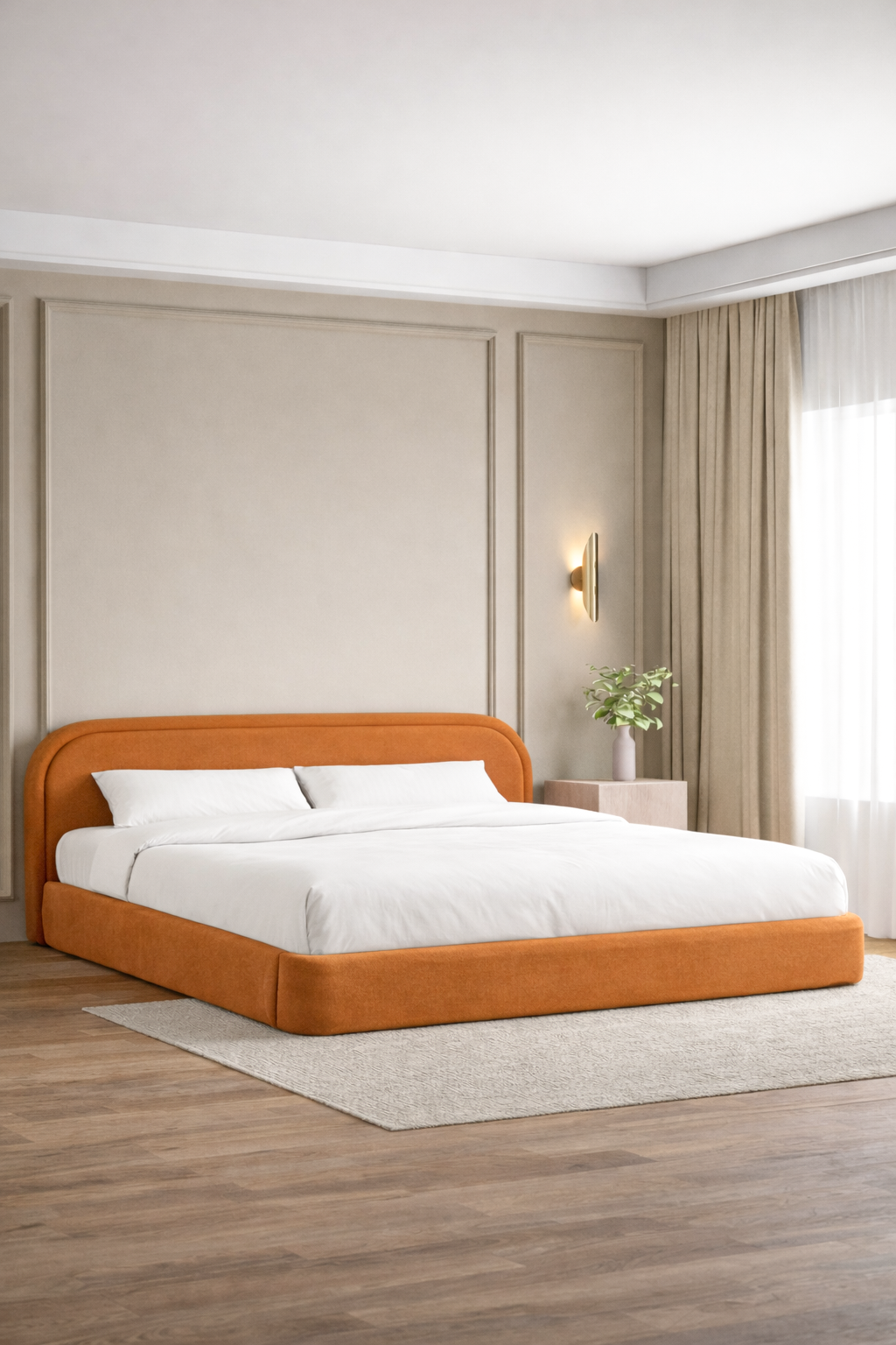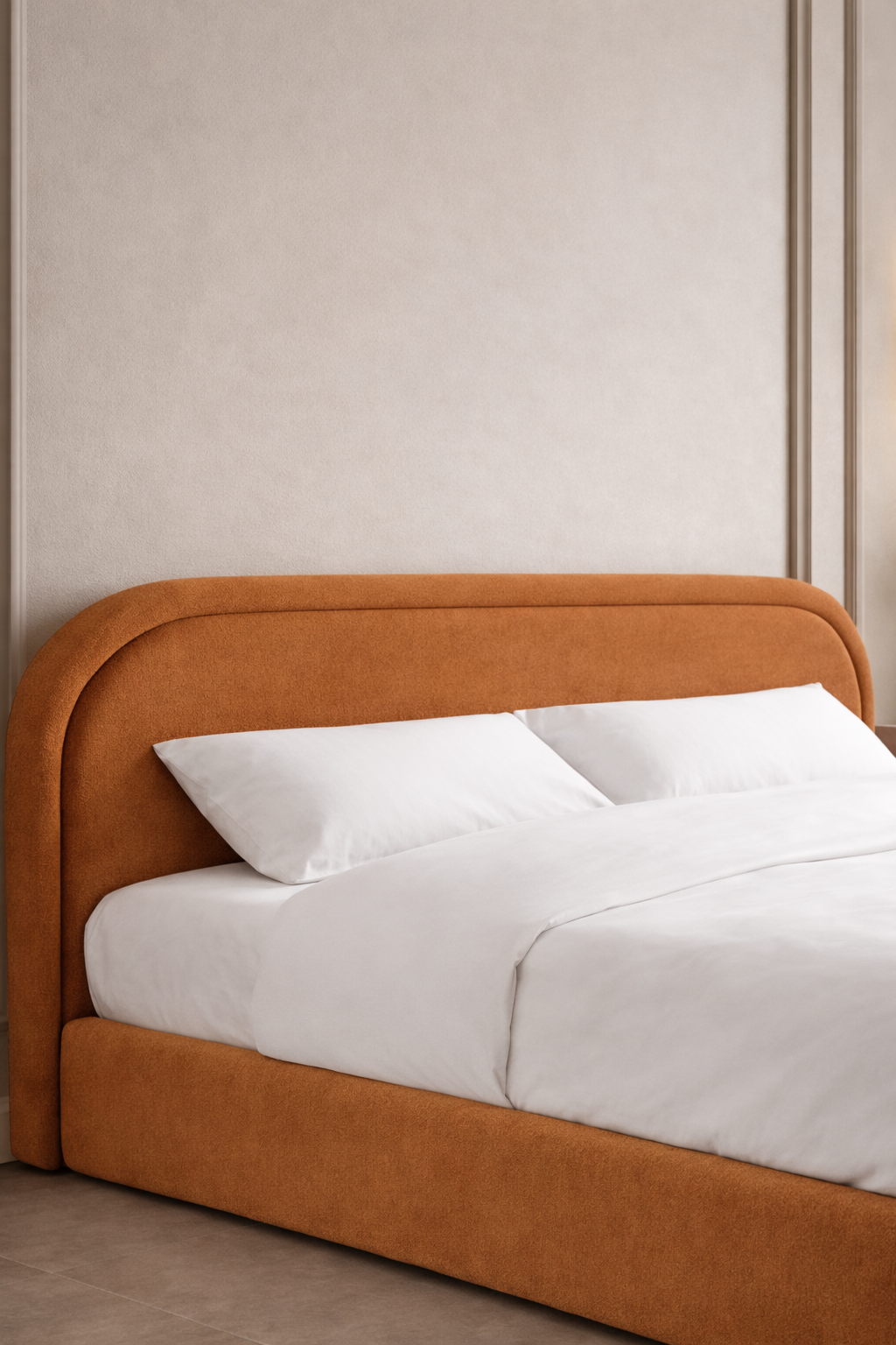 Create a calm, elevated bedroom retreat with a softly curved silhouette wrapped in terracotta upholstery that brings warm, sunbaked richness to your space. The sculpted headboard adds a gentle architectural statement while keeping the look grounded, inviting, and beautifully balanced. Designed to pair effortlessly with warm woods, natural stone textures, and layered neutral linens, it delivers a refined boutique hotel finish with everyday comfort. A perfect foundation for minimalist, modern, or organic luxury interiors.