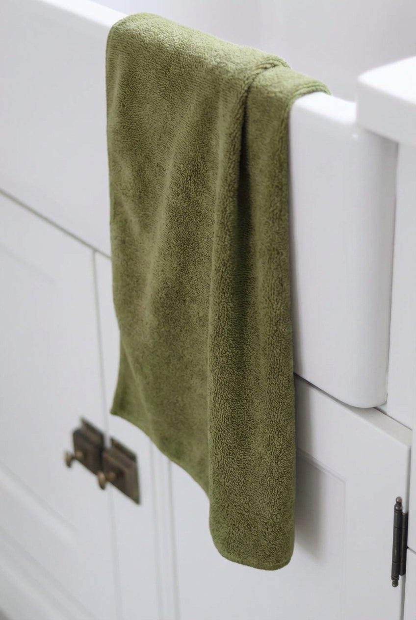 Bring grounded elegance into your bathroom with a deep army green tone that feels calm and contemporary. Crafted in ultra soft microfiber, this towel delivers a plush touch, superior absorbency, and fast drying comfort, turning everyday moments into a refined hotel inspired ritual that feels composed, warm, and effortlessly premium.