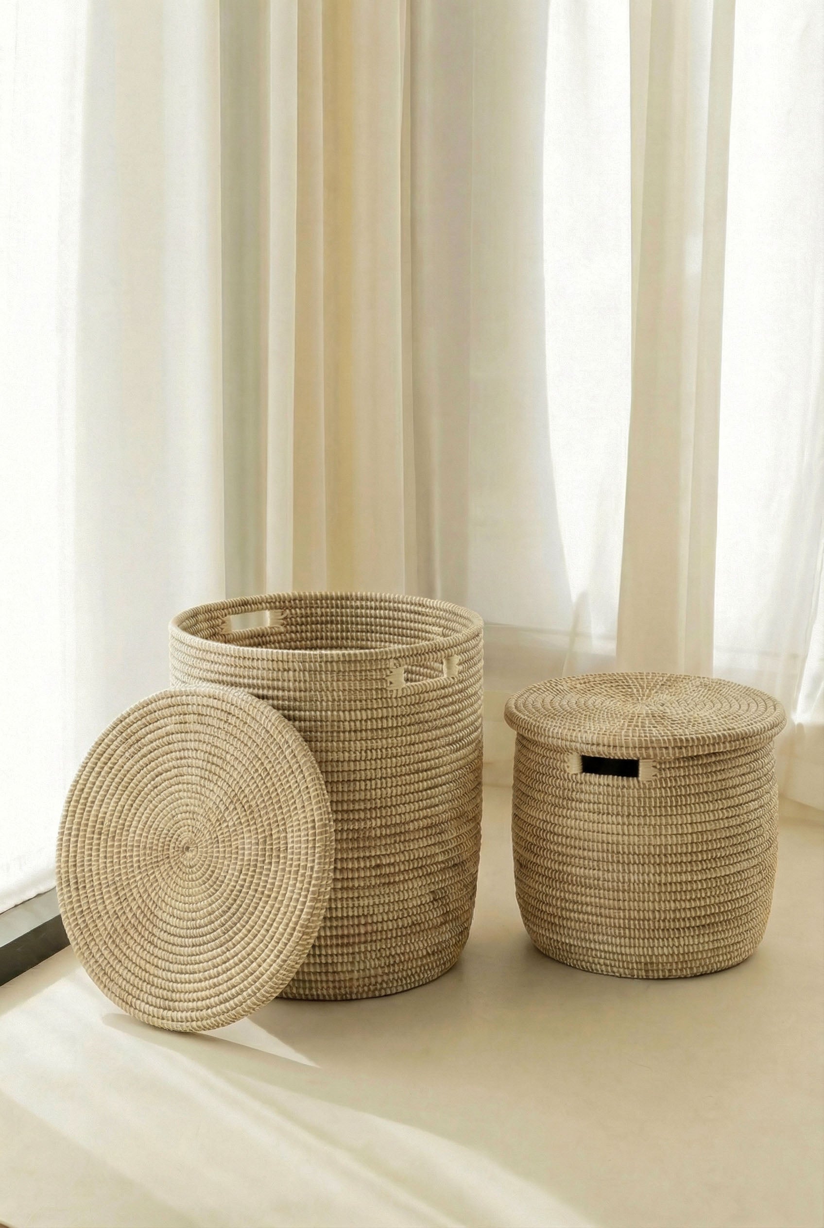 Bring timeless elegance and practical storage to your space with a handcrafted piece designed in a warm neutral tone and a beautifully textured weave that feels both natural and refined. Handwoven in Senegal by women in rural villages using dried local grass and eco friendly PP plastic, each basket takes around two days to craft, making every piece a meaningful expression of artisanal skill. Lightweight yet durable, it adds a calm, organized, and quietly elevated feel to your home while supporting women in providing for their children’s schooling, food, and health.