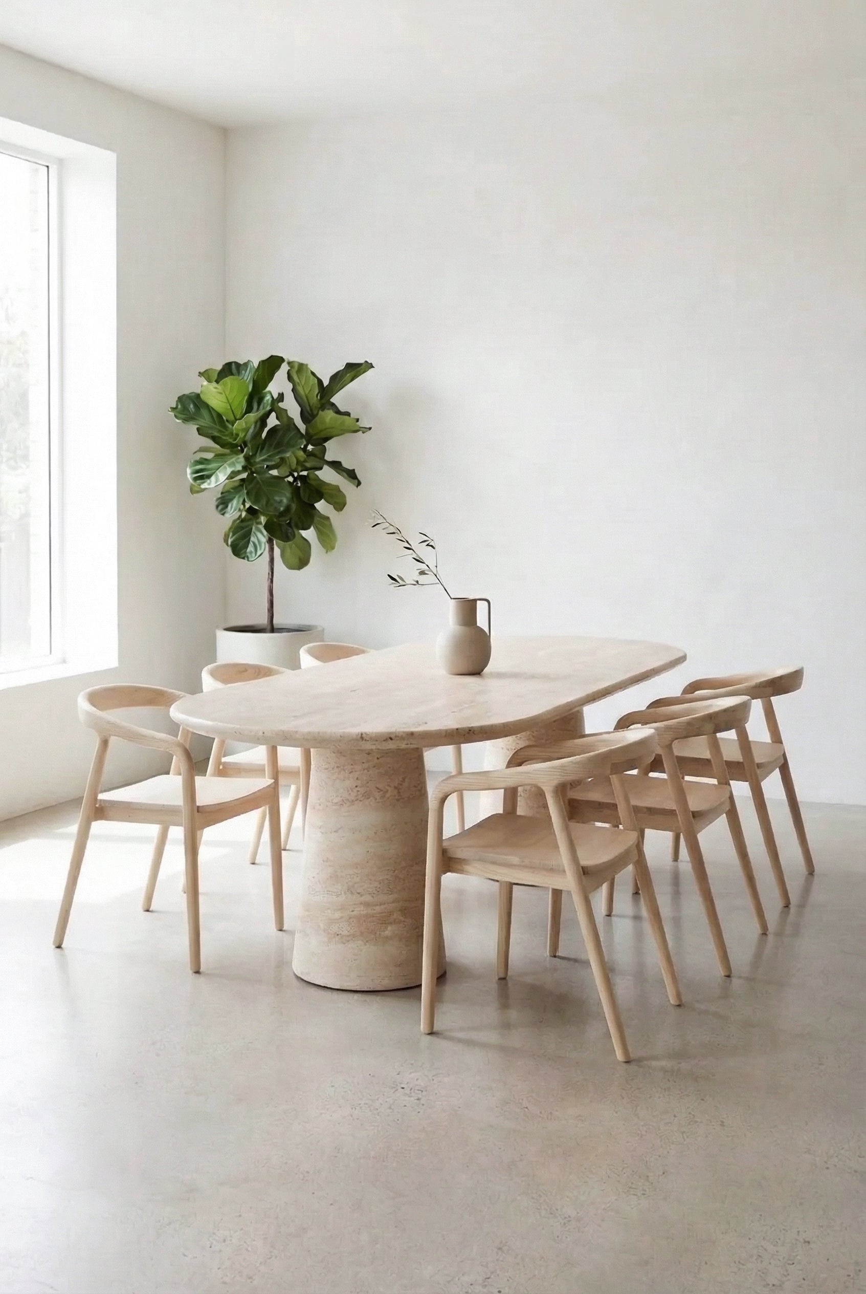 The Dolce Off White Concrete Dining Table exudes contemporary charm with its smooth, rounded design and dual cylindrical bases. Made from premium Glass Fiber Reinforced Concrete (GRC), this table offers unparalleled durability while maintaining a sleek, elegant appearance. Its Off white concrete finish radiates a clean, modern vibe, seamlessly enhancing minimalist, Scandinavian, or industrial-inspired dining spaces. The rounded tabletop softens the overall aesthetic, creating an inviting focal point for dining or social gatherings.