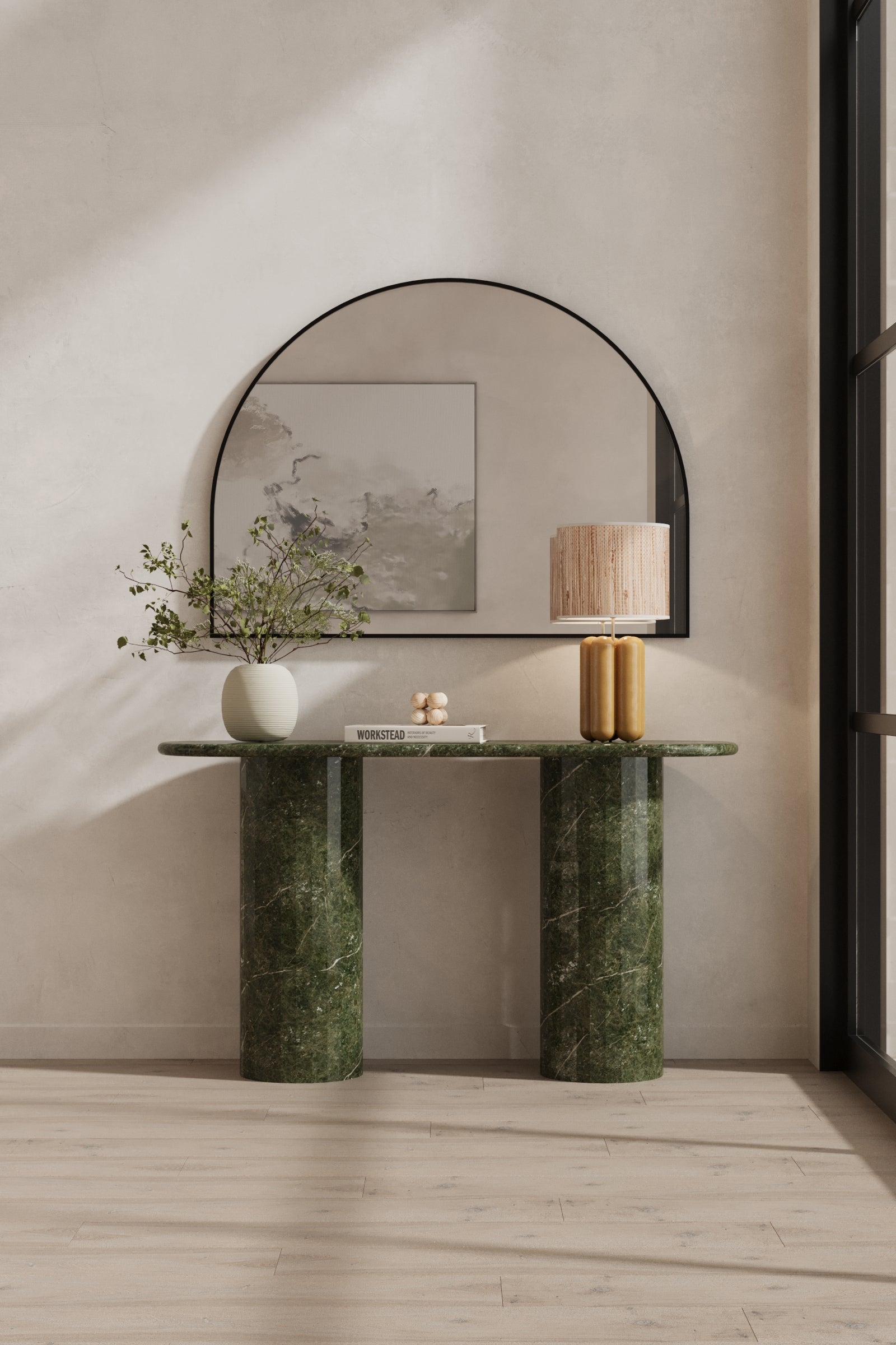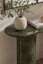 Crafted with a striking oval top and sculptural column legs, this console table showcases rich Ming Green stone that brings depth, character, and timeless luxury to any interior. The natural veining and polished surface highlight the stone’s organic beauty, while the elongated silhouette offers a refined foundation for decorative accents, lighting, or entryway essentials. Designed to elevate modern, transitional, or curated spaces, this piece blends artistry and function, creating a sophisticated focal point that enhances hallways, living rooms, or dining areas with effortless elegance.