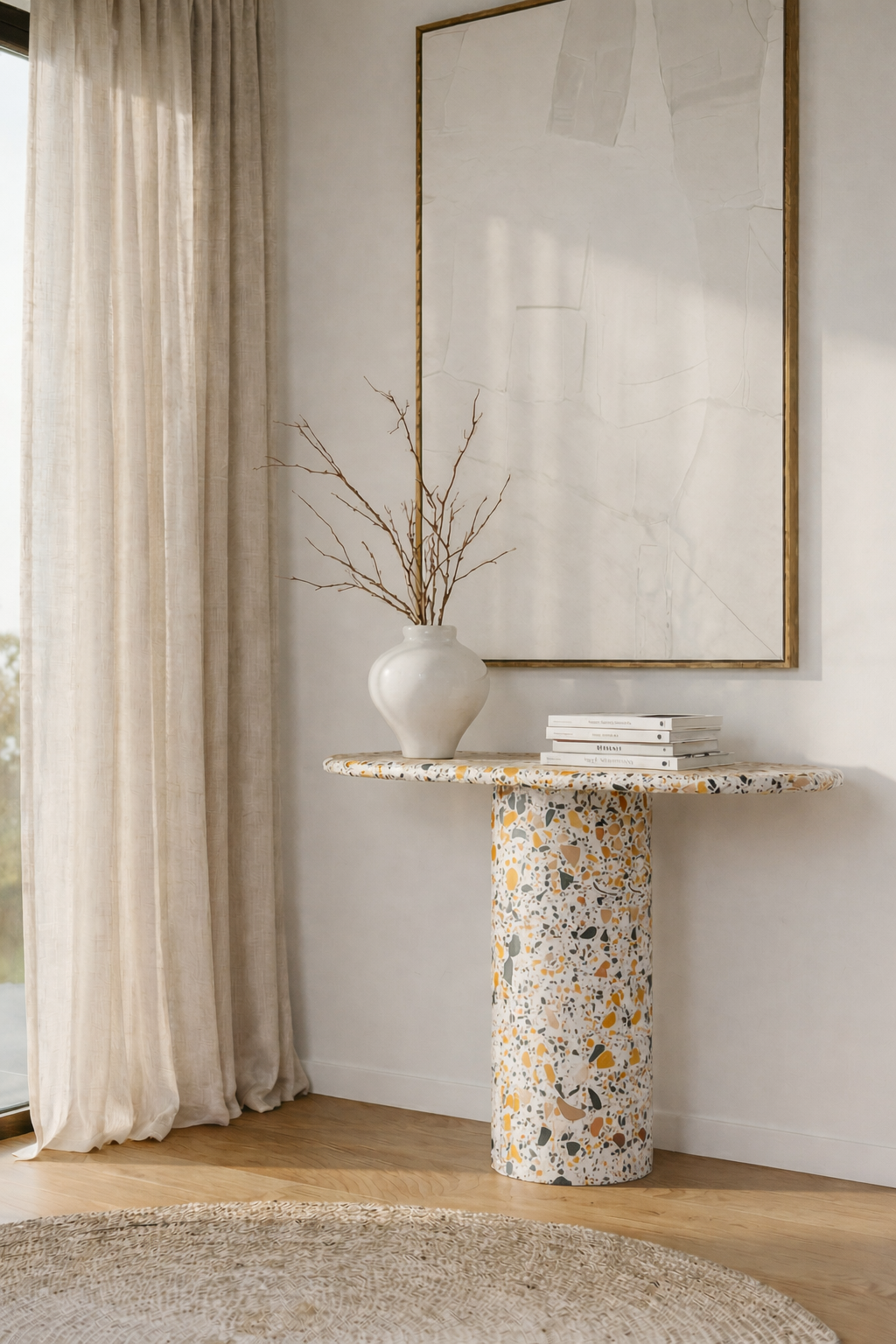 Crafted in richly detailed Venetian terrazzo, this console table features a smooth oval top balanced on a bold cylindrical pedestal, creating a sculptural yet refined presence. The surface reveals a harmonious blend of warm ochre, soft ivory, muted green, and natural stone fragments that add depth, texture, and artisanal character. Its clean silhouette and rounded form soften your space while introducing subtle movement and warmth, making it a sophisticated statement for entryways, living rooms, or styled corners where modern design meets timeless Italian inspired charm.