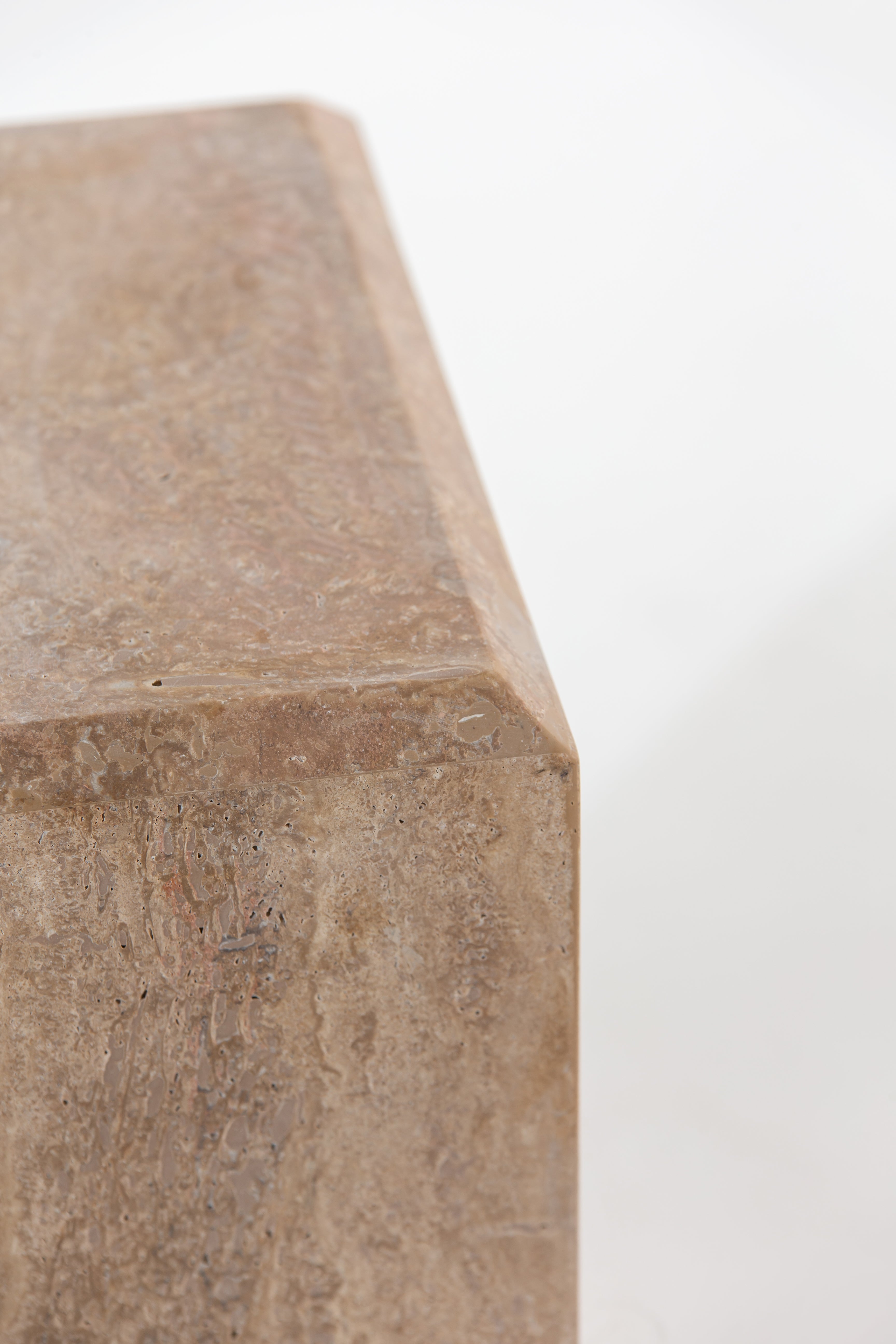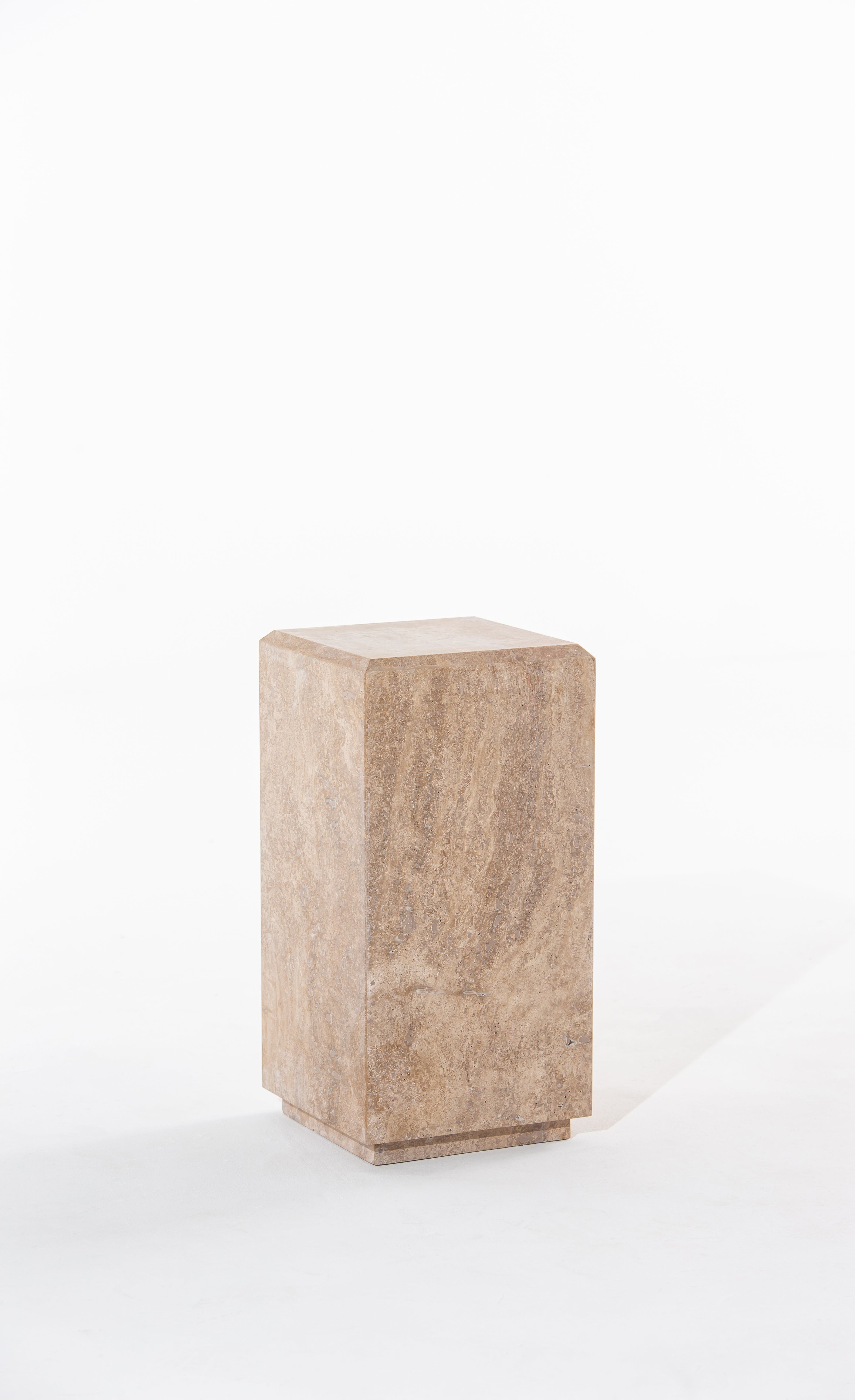 Sleek, modern, and architecturally refined, this geometric display plinth is designed to elevate the everyday. With its clean vertical profile and sharply angled edges, it functions as both a sculptural statement and a versatile surface for showcasing your favorite objects. Whether used as a stand for floral arrangements, art pieces, lighting, or vases, this pedestal adds height and visual focus to any interior having smoothness in material that includes Noche Travertine. The smooth, polished surface and natural veining create organic variation that brings warmth and texture to minimalist spaces.