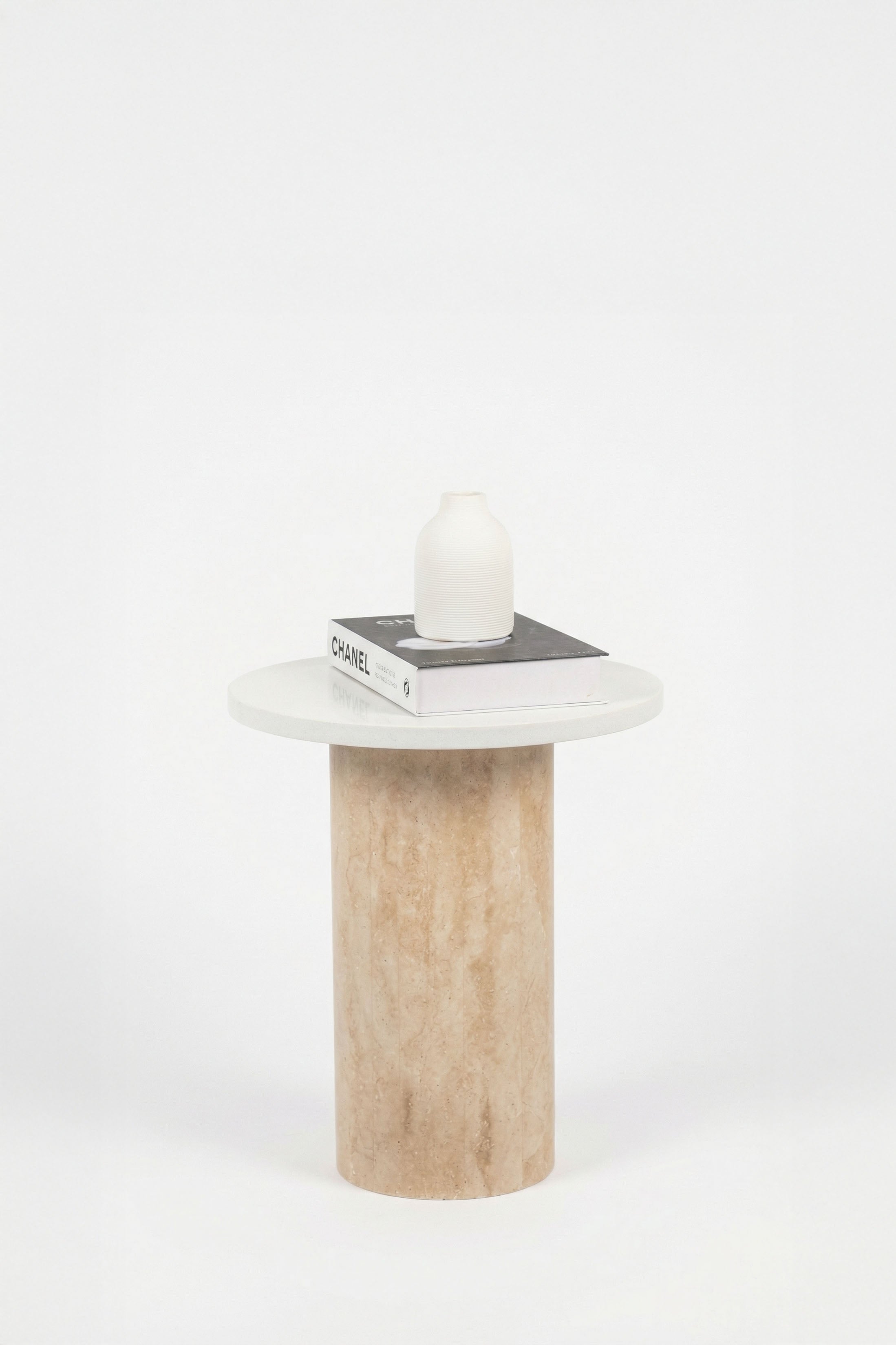 Harriet White Quartz Side Table with Travertine Base (38CM Diameter)