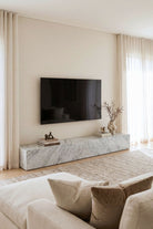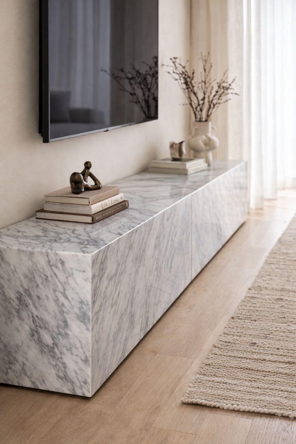 Soft bianco marble veining flows gently across two independent stone slabs, allowing you to arrange them freely in horizontal or vertical compositions to suit your space, creating a calm architectural presence that frames the television with sculptural balance while offering a pure, storage-free design that celebrates material, proportion, and visual serenity.