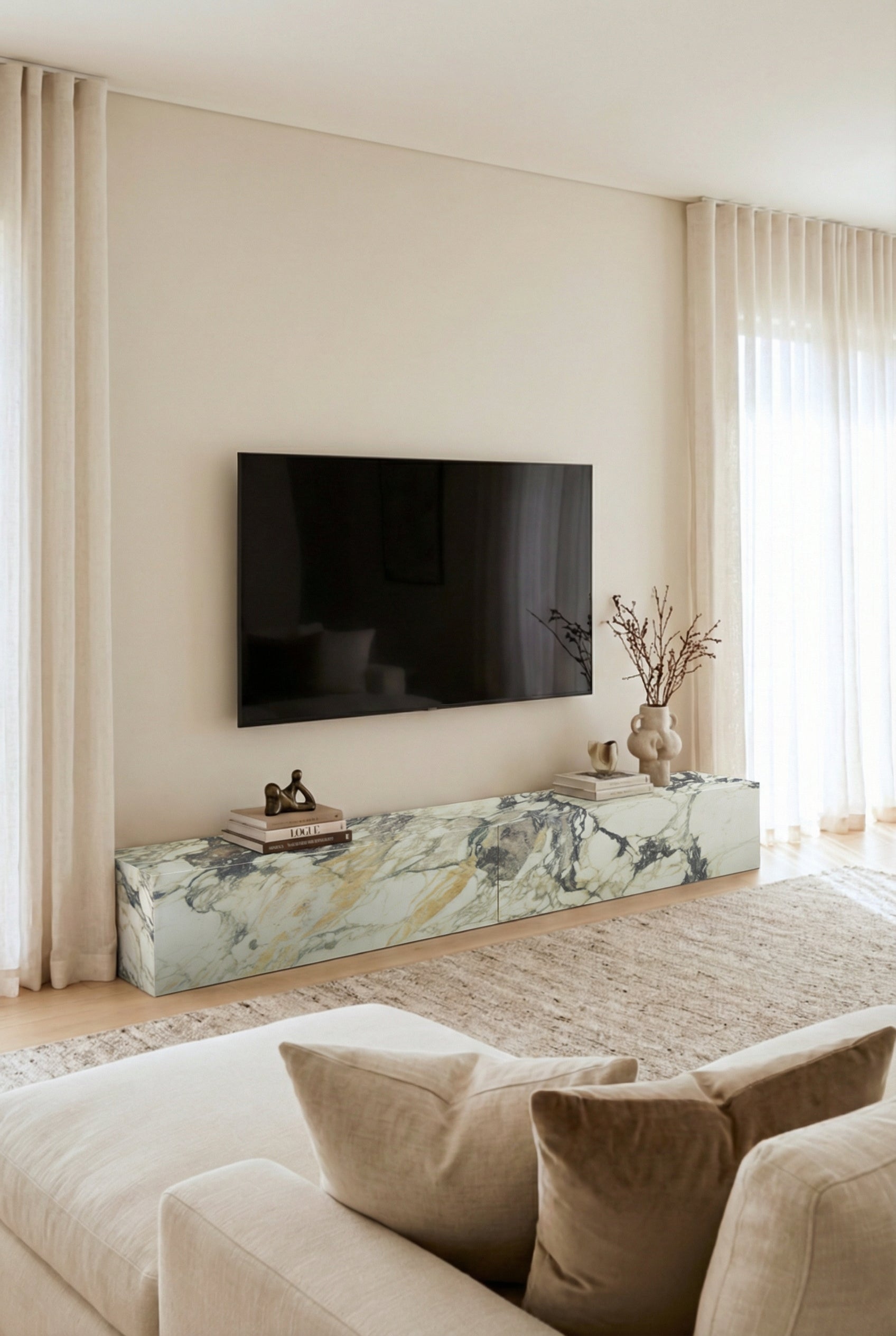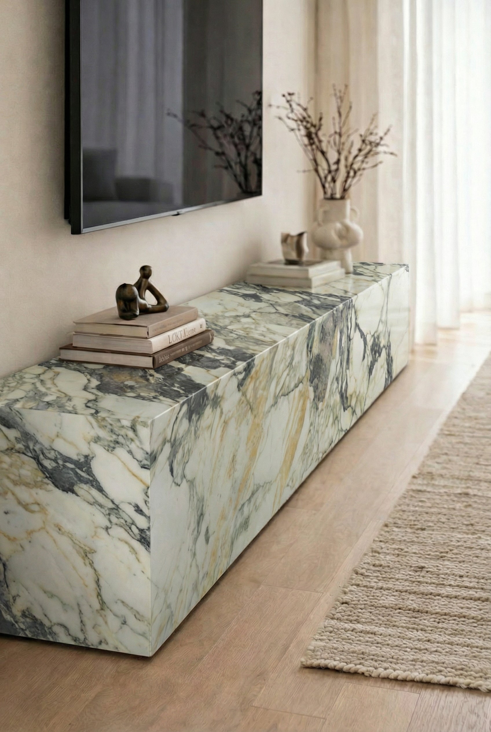 A sculptural statement crafted in Calacatta Viola marble, composed of two separate slabs that can be arranged freely in horizontal or vertical alignment as desired. Expressive violet and amber veining brings depth and artistry to contemporary living spaces, while the absence of storage preserves a clean, architectural presence.