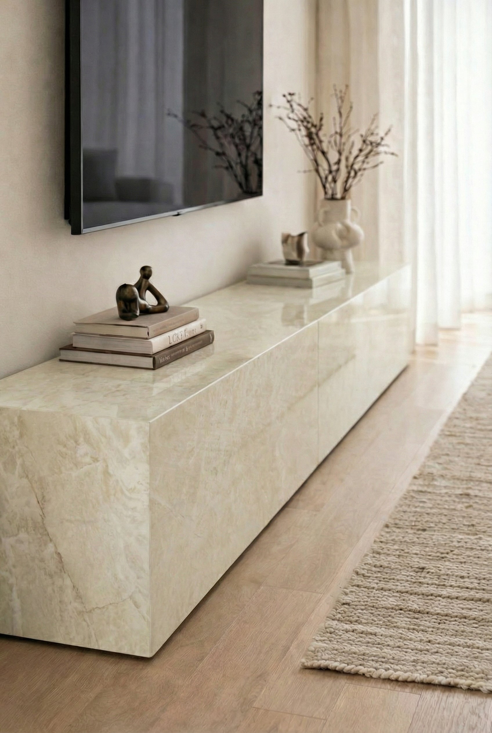 Soft creamy marble tones create a luminous and calming presence, bringing warmth and balance to modern living spaces. Composed of two separate slabs with no storage, the design allows complete freedom to arrange them horizontally or vertically as desired, resulting in a serene architectural composition that feels refined and effortlessly timeless.
