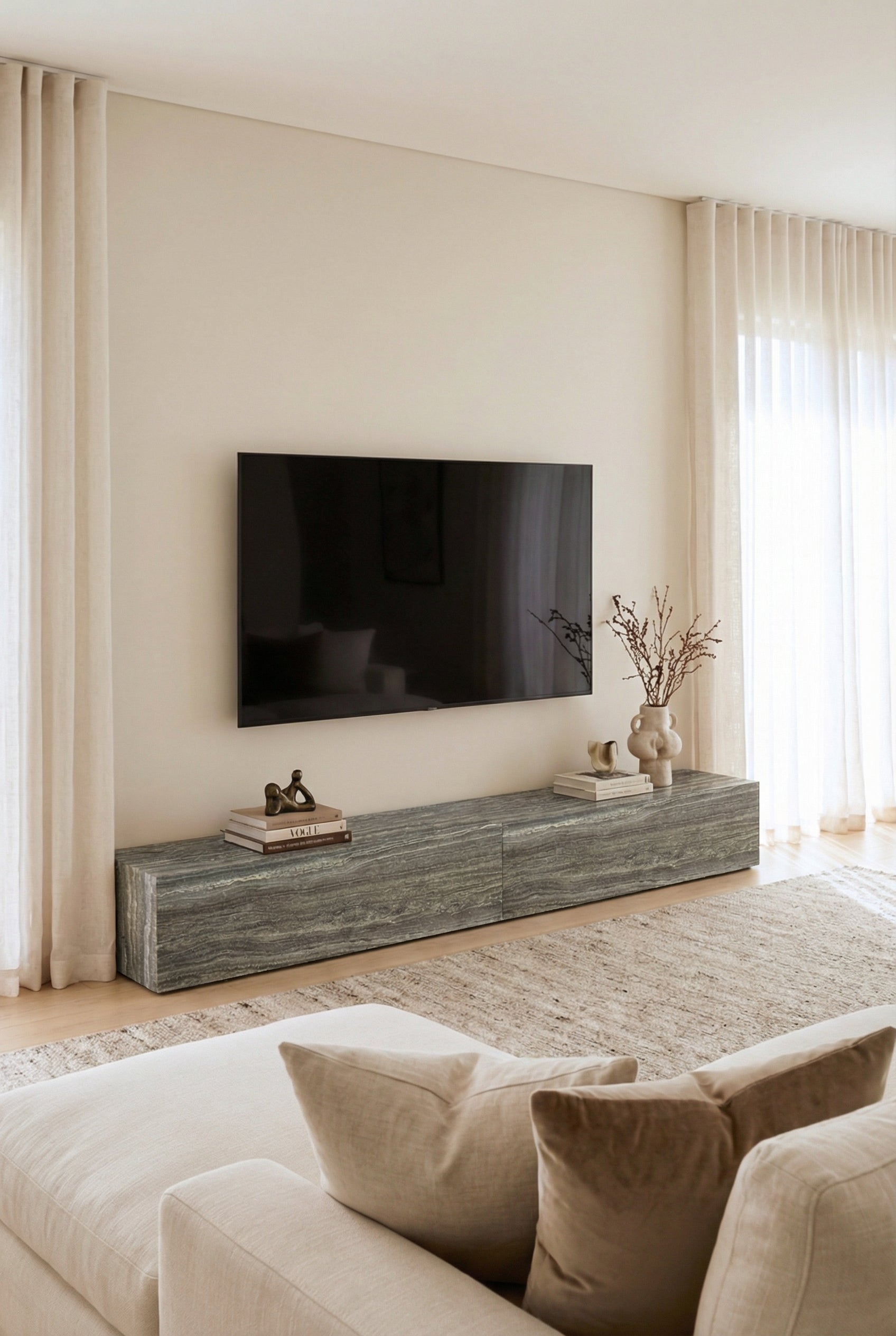 Crafted from refined Hellenic Grey travertine, this sculptural piece is composed of two separate slabs that can be arranged freely in vertical or horizontal alignment as desired. The natural veining creates a serene architectural backdrop, with no storage elements to preserve a clean and composed minimalist presence.