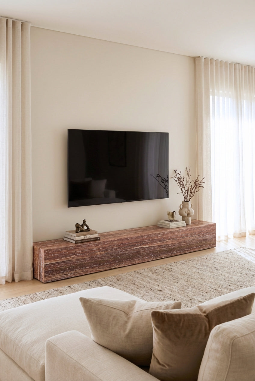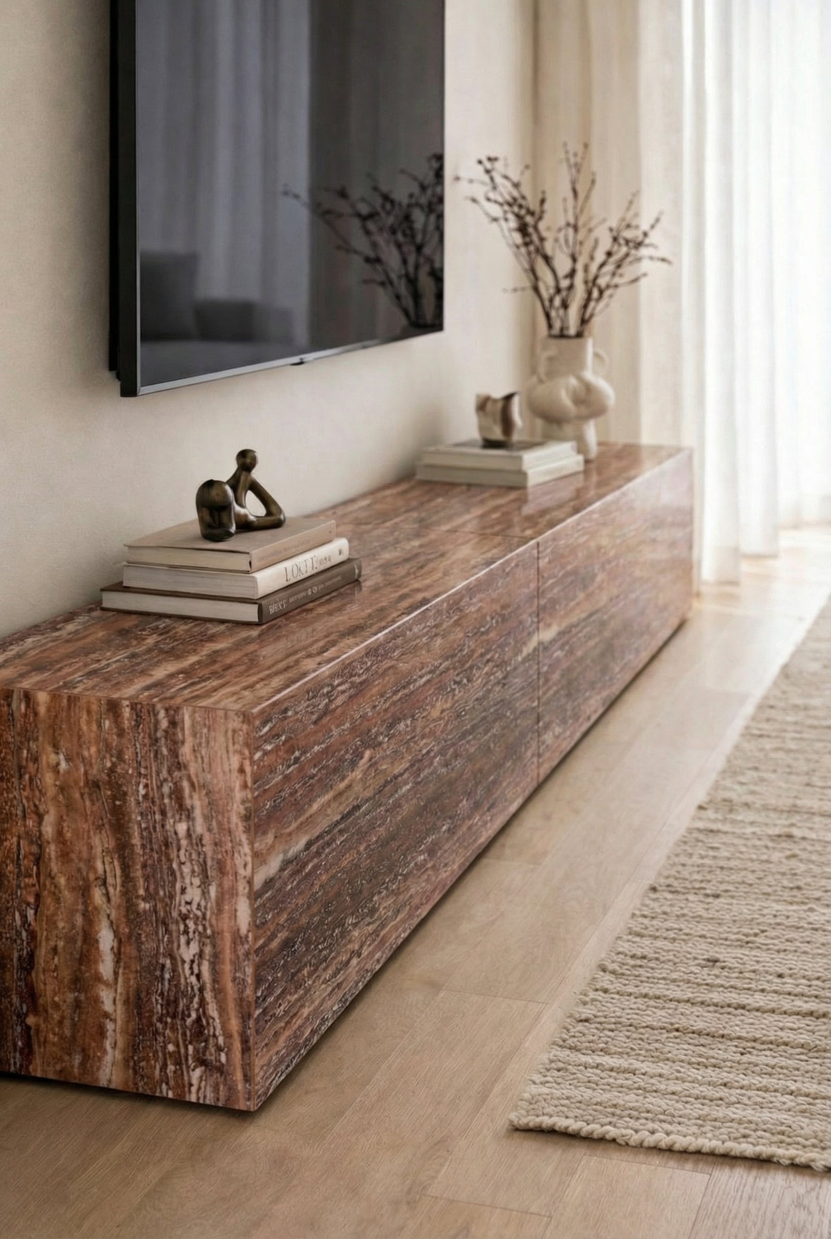 Crafted from richly veined red travertine, this sculptural TV unit is composed of two separate slabs that can be arranged freely in horizontal or vertical layouts to suit your space and styling vision. With no storage and a focus on pure architectural form, it brings a refined Hellenic character to the living area, allowing natural stone texture and timeless European elegance to take center stage.