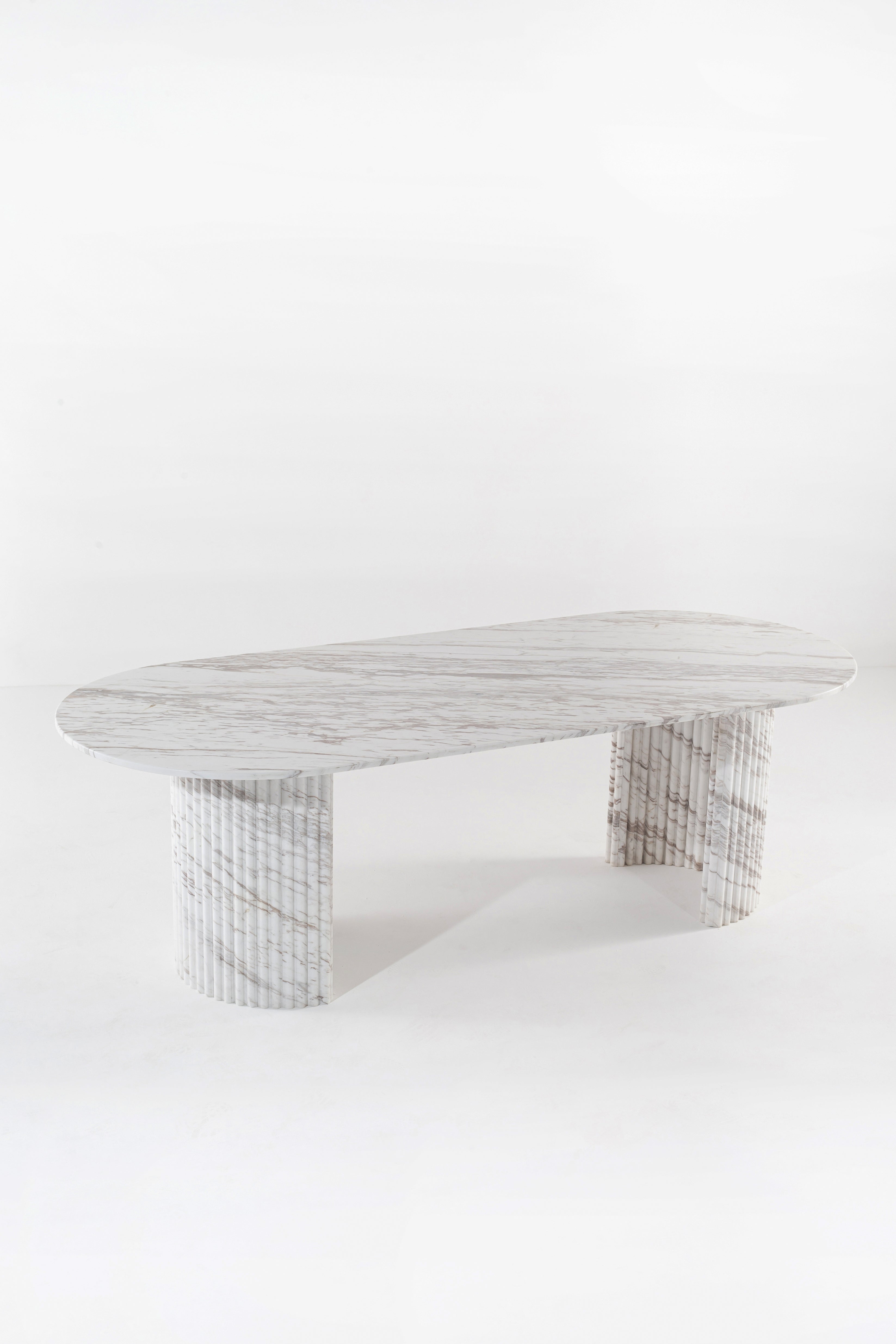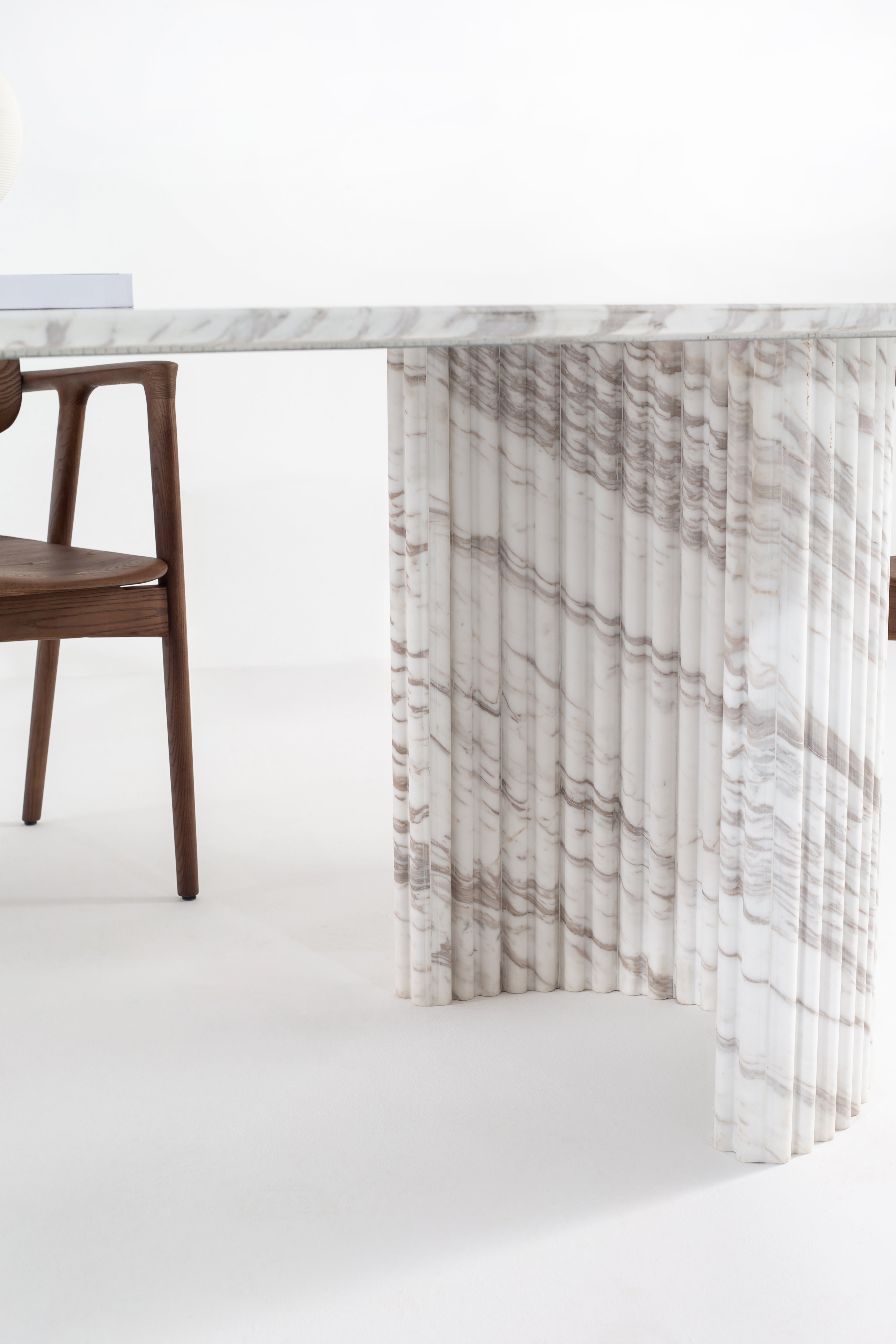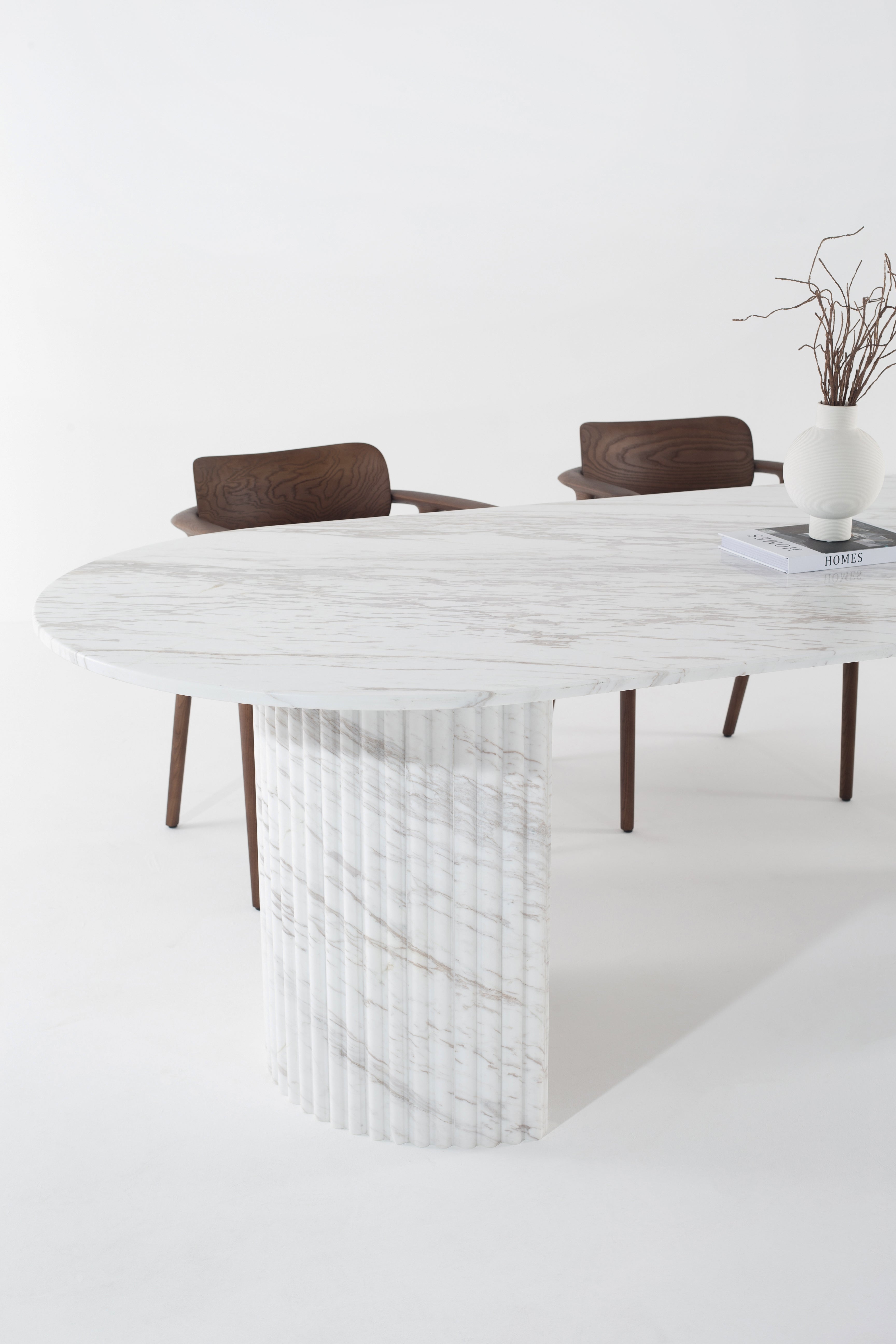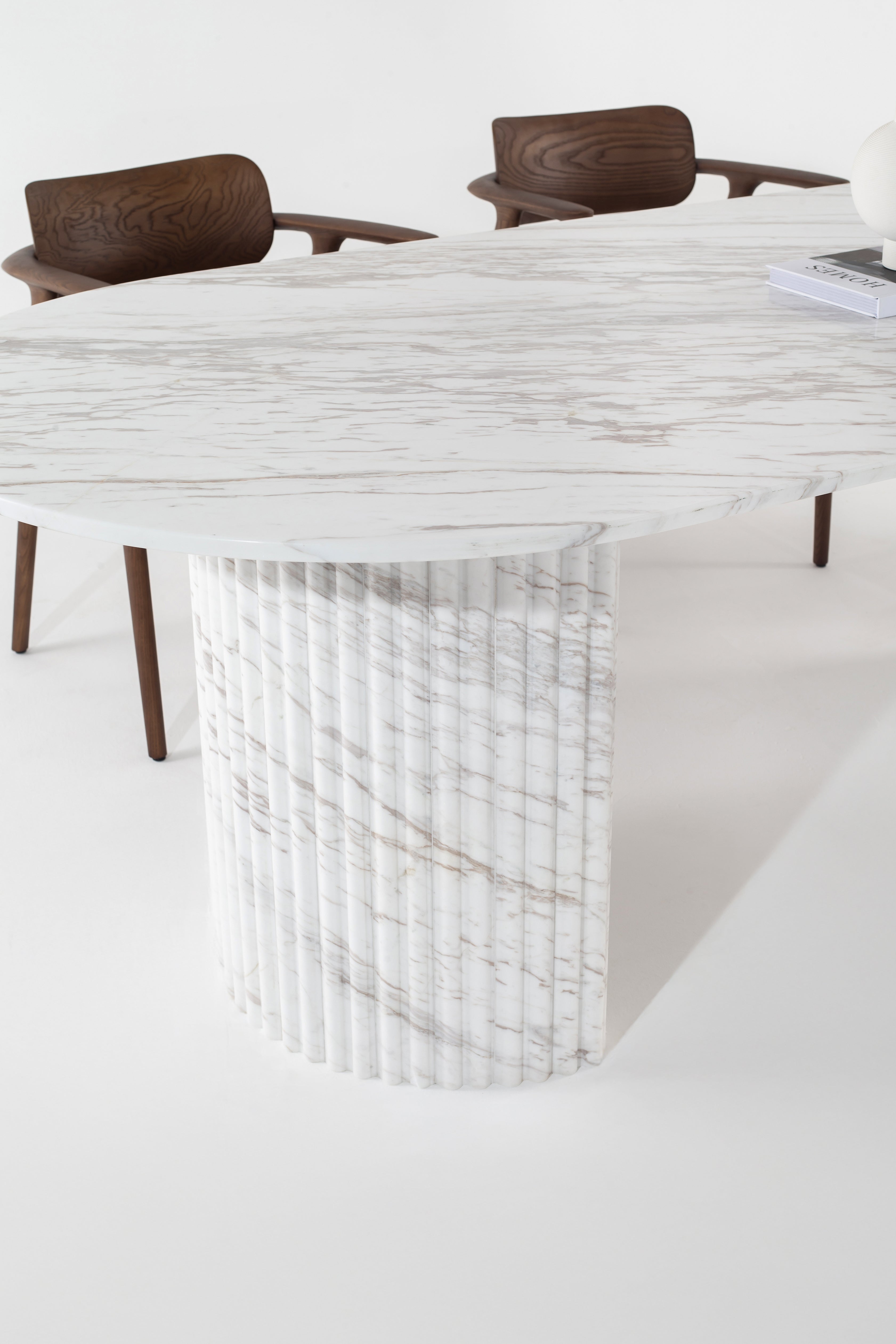 Command the room with a dining table that brings timeless Greek elegance into your space. Crafted from premium Calacatta marble, it features distinctive half-moon fluted legs that create a sculptural foundation for the elongated oval top. The creamy white marble, veined with soft greys and warm taupes, adds a luxurious texture that balances sophistication with natural warmth. Whether styled in a contemporary apartment or a refined villa setting, this marble dining table becomes the understated centerpiece that reflects your elevated taste.