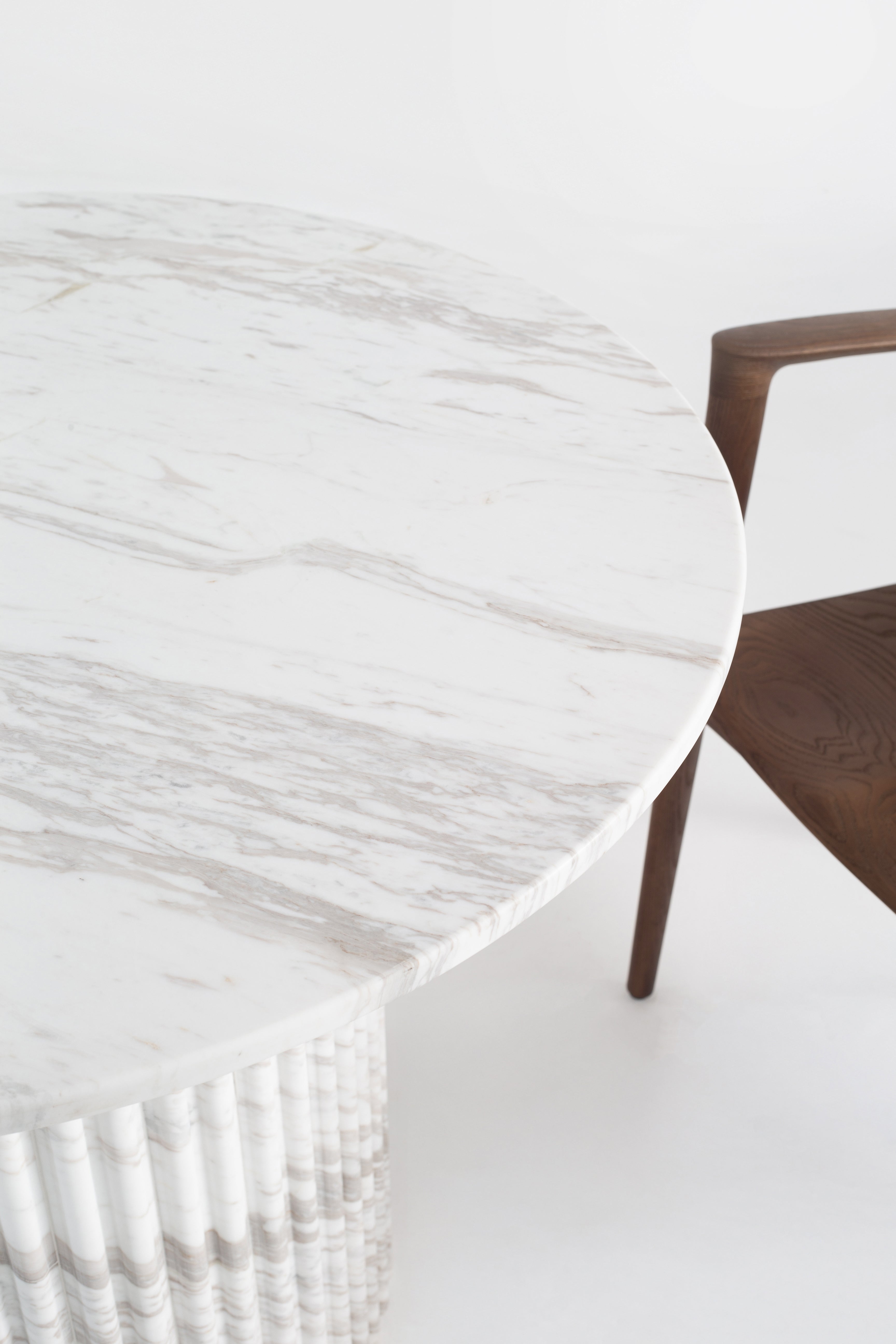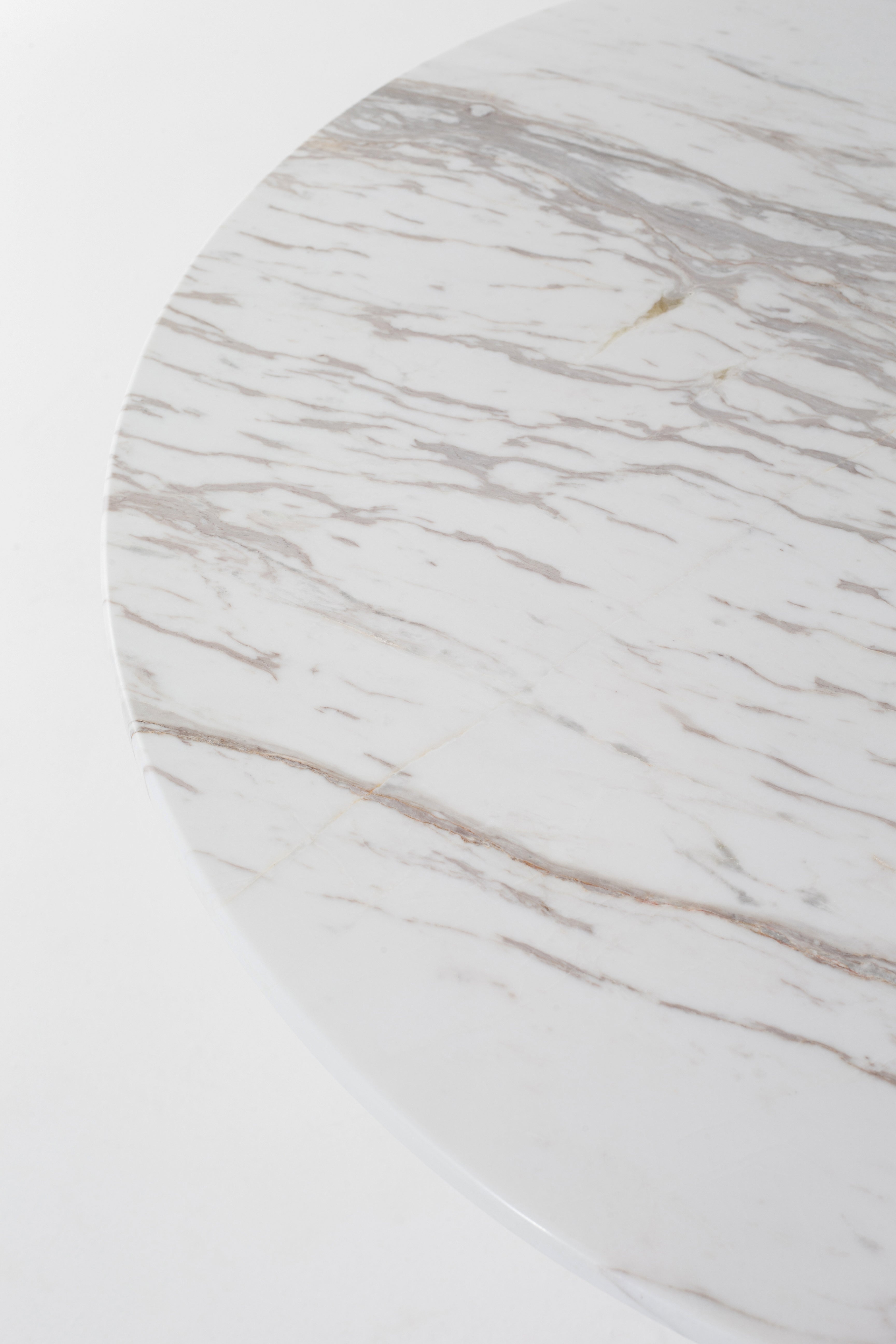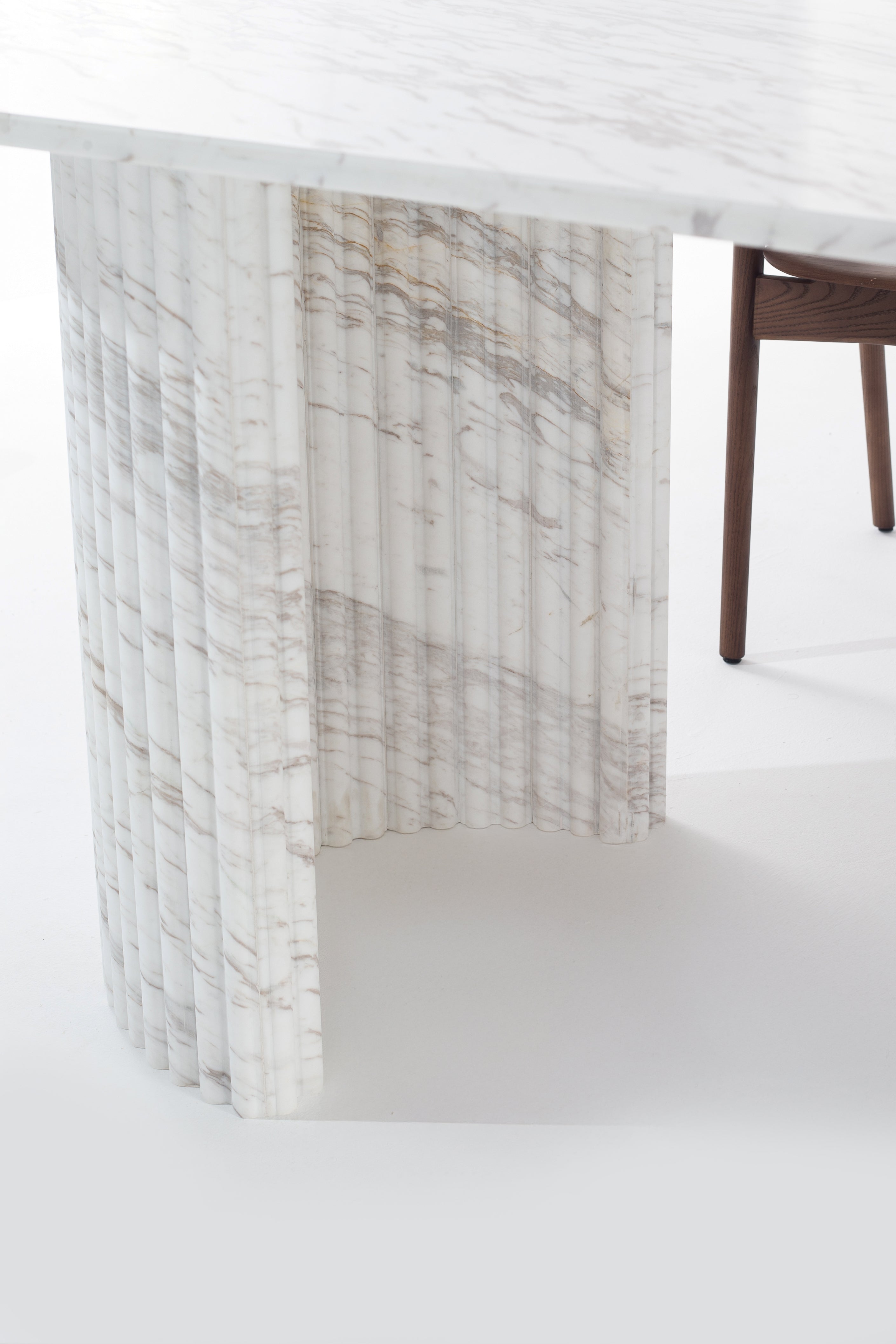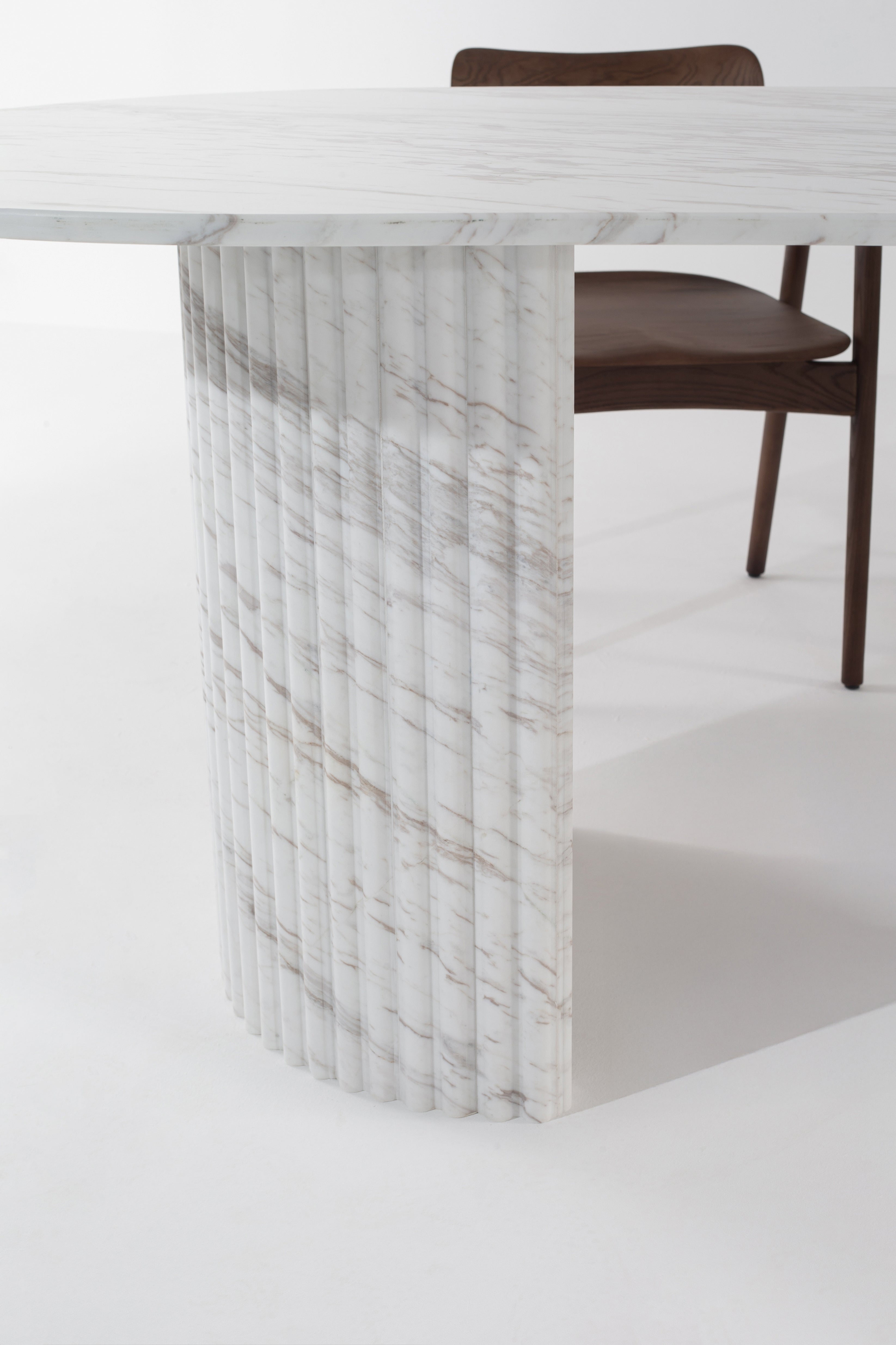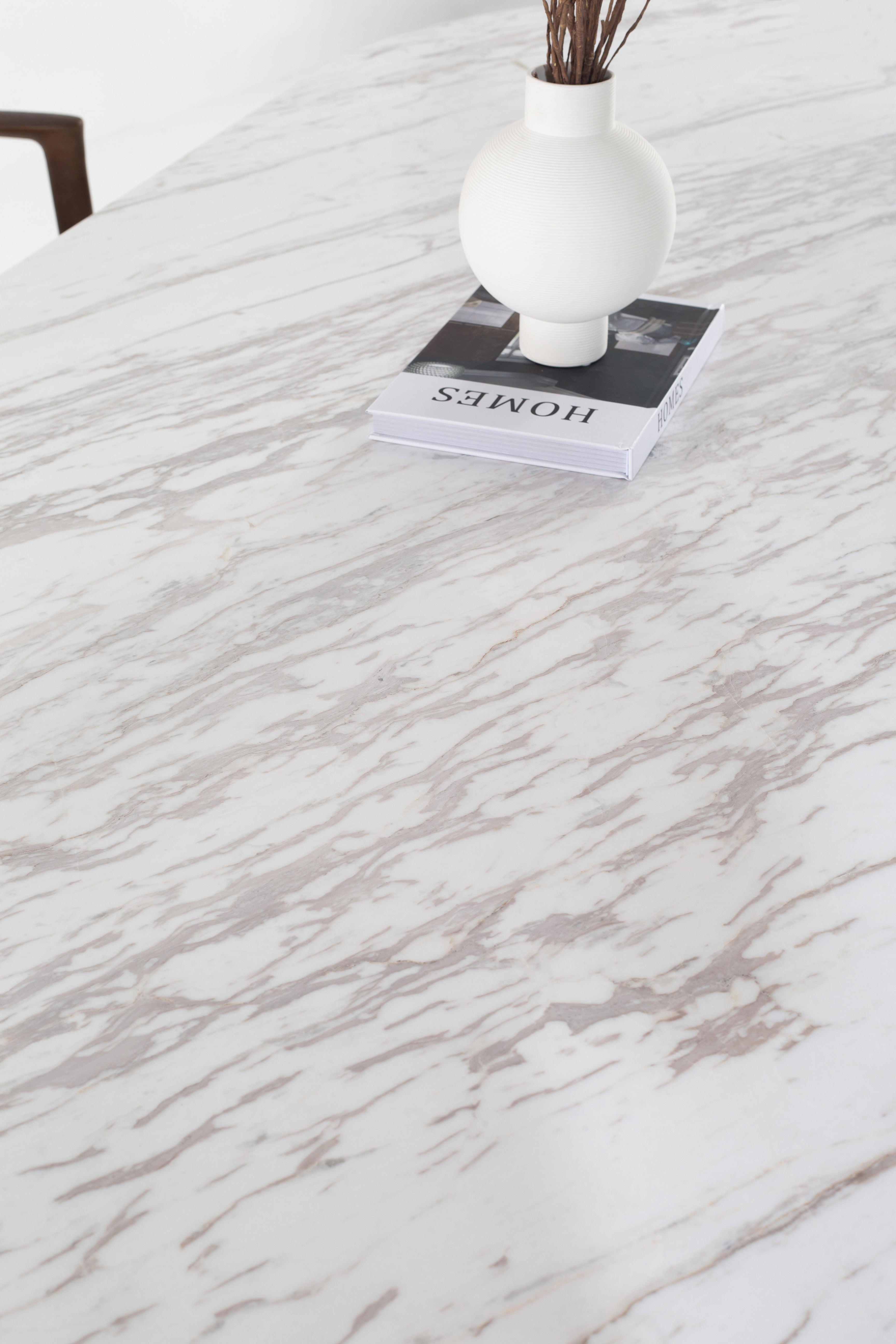 Command the room with a dining table that brings timeless Greek elegance into your space. Crafted from premium Calacatta marble, it features distinctive half-moon fluted legs that create a sculptural foundation for the elongated oval top. The creamy white marble, veined with soft greys and warm taupes, adds a luxurious texture that balances sophistication with natural warmth. Whether styled in a contemporary apartment or a refined villa setting, this marble dining table becomes the understated centerpiece that reflects your elevated taste.