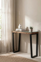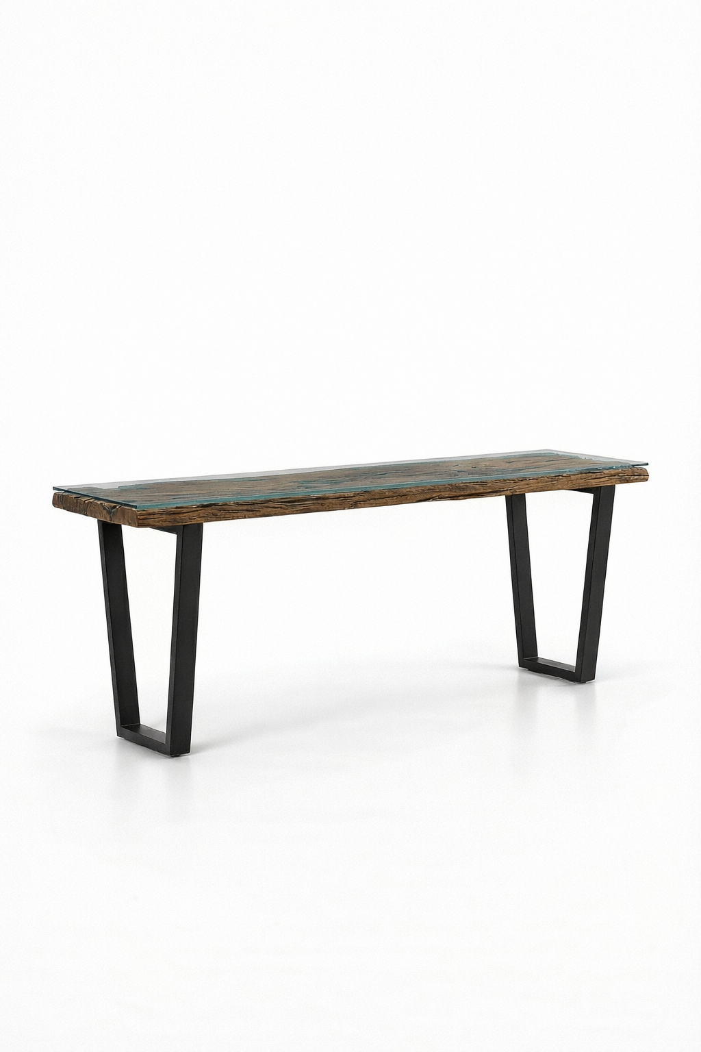 Renato Railway Wood Glass Top Console Table With V Shape Legs