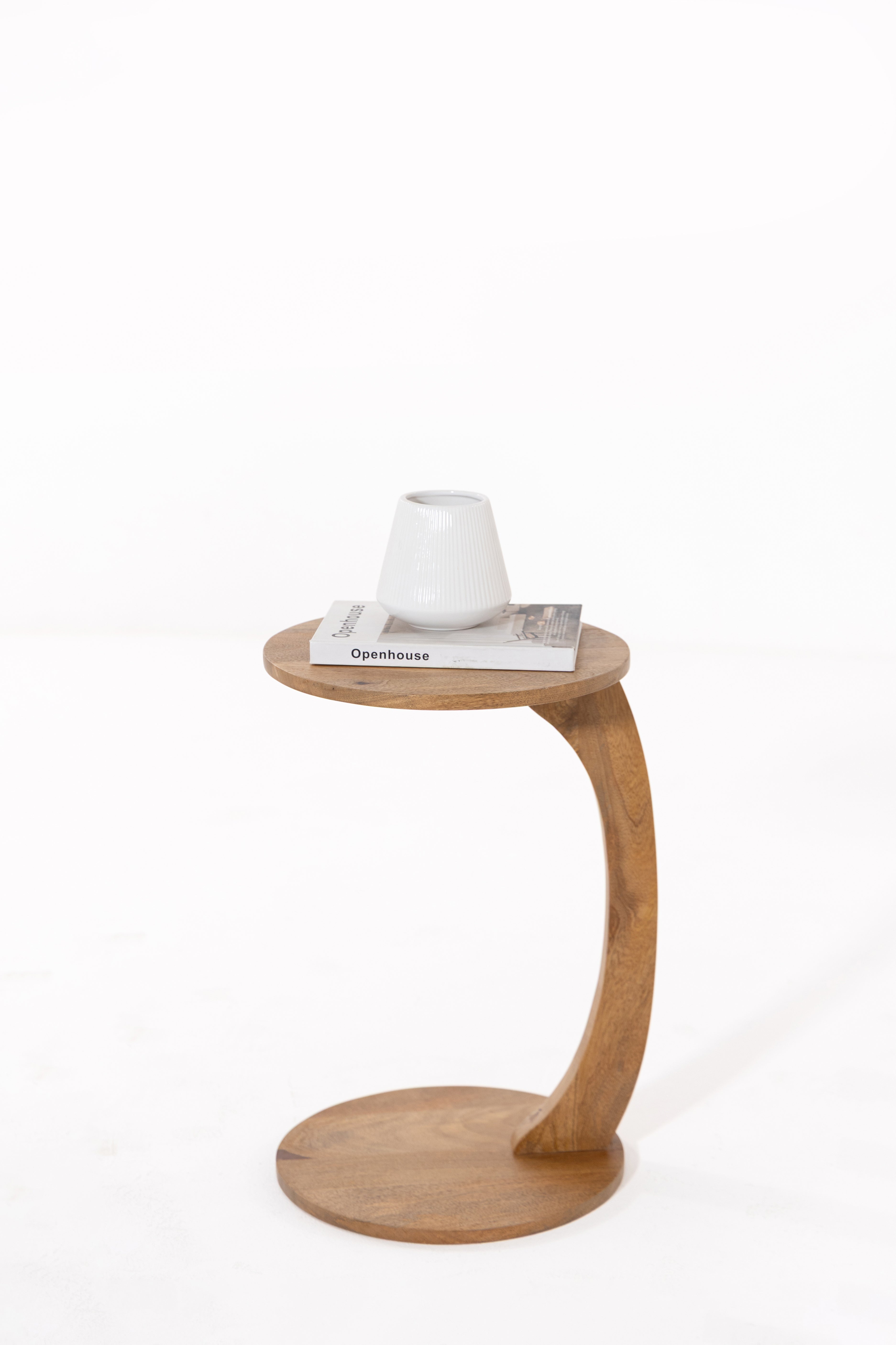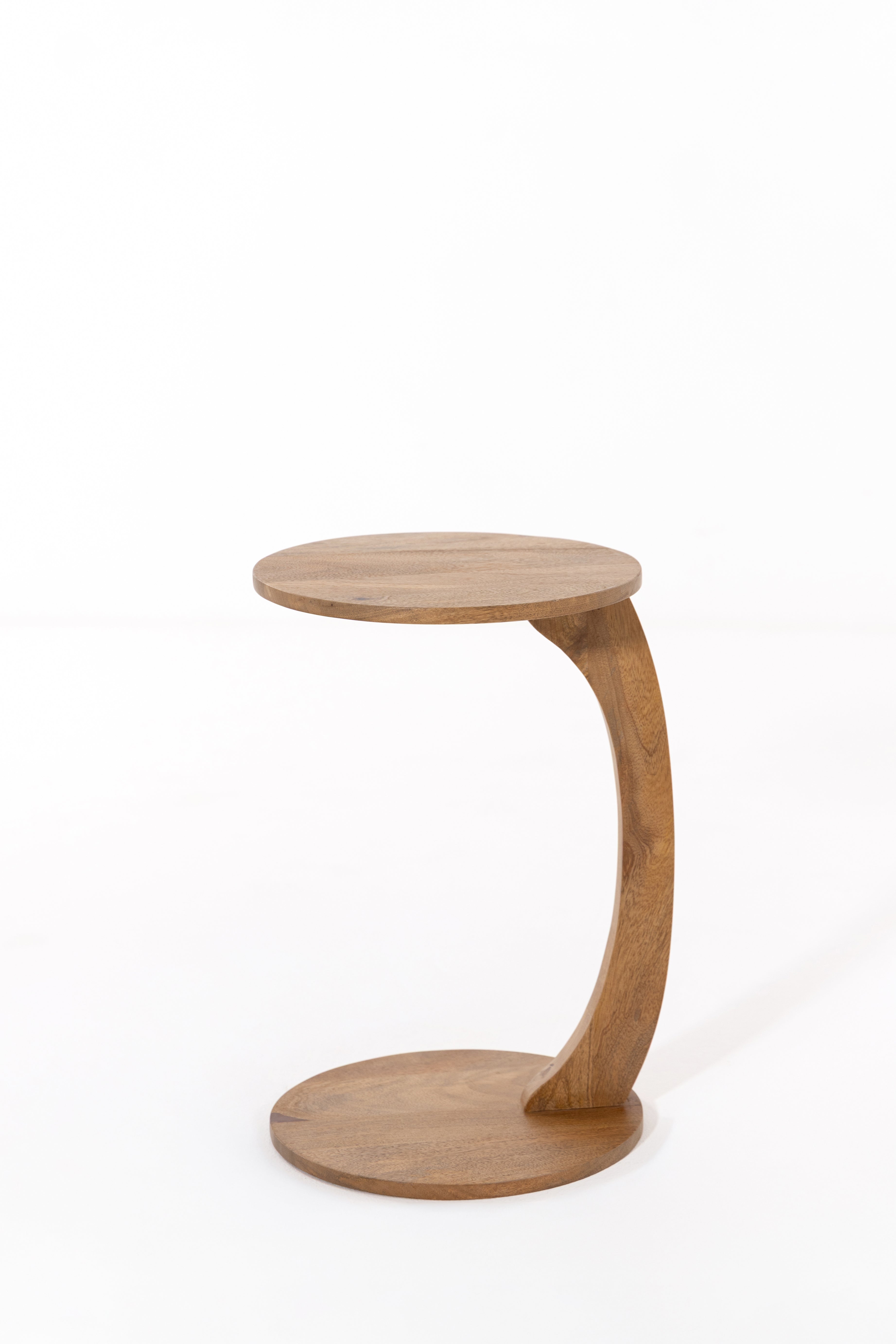 Gracefully sculpted from solid mango wood, this side table introduces fluid movement and natural warmth into your space. The curved support creates a striking cantilevered silhouette, balancing strength with visual lightness while highlighting the organic grain of the wood. Compact yet expressive, it offers a practical surface for everyday essentials while doubling as a sculptural accent. Designed to complement modern, minimalist, and natural interiors, it brings refined character and effortless elegance to living rooms, bedrooms, or reading corners.